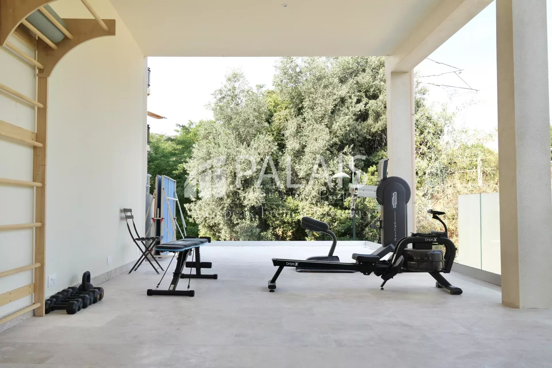 Elle se compose d'un vaste séjour avec cuisine (44 m2 env.), d'une chambre/bureau, d'une salle d'eau et d'une buanderie au rez-de-chaussée et de 5 chambres, dont une chambre de maître et sa terrasse privative, à l'étage.