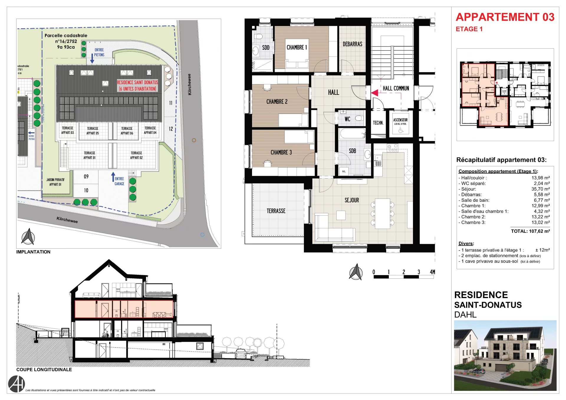 Au sein de la Résidence Saint Donatus, projet résidentiel contemporain à taille humaine situé à Dahl, découvrez ce bel appartement (03) neuf en vente en état futur d’achèvement, implanté au 1er étage d’une résidence moderne avec ascenseur. L’appartement développe une surface de 107,62 m², offrant une distribution équilibrée et fonctionnelle, parfaitement adaptée à une vie familiale confortable ou à un usage résidentiel de qualité. La pièce de vie se compose d’un séjour lumineux avec cuisine ouverte, non incluse dans le prix de vente, permettant à l’acquéreur de concevoir un aménagement sur mesure. Cet espace s’ouvre directement sur une terrasse de ± 12 m², idéale pour profiter d’un extérieur agréable à l’étage. L’espace nuit se compose de trois chambres, dont une chambre disposant de sa salle d’eau attenante, offrant un confort appréciable au quotidien. L’appartement bénéficie en complément d’une salle de bains indépendante, ainsi que d’un WC séparé, garantissant une organisation fonctionnelle et adaptée à une vie familiale. Un débarras complète intelligemment l’agencement intérieur. Les prestations techniques répondent aux standards actuels les plus exigeants – Carrelage dans les pièces principales – Parquet dans les chambres à coucher – Triple vitrage PVC – Chauffage par pompe à chaleur avec diffusion par le sol – Ascenseur desservant tous les niveaux – Vidéophone – Cave privative incluse La résidence bénéficie d’une classe de performance énergétique A et d’une classe d’isolation thermique B, assurant une excellente efficacité énergétique, un confort thermique durable et une maîtrise des consommations. Deux emplacements de parking intérieur sont en supplément au prix de 65.000 €, non inclus dans le prix de vente. Cet appartement représente une opportunité attractive d’acquérir un logement neuf à l’étage, au sein d’un projet immobilier soigné, dans un environnement calme et verdoyant à Dahl, tout en restant proche des axes principaux. Les plans, visuels et rendus 3D sont fournis à titre indicatif et n’ont pas de valeur contractuelle, conformément au cadre légal de la vente en état futur d’achèvement. Pour toute information complémentaire, je reste à votre entière disposition.