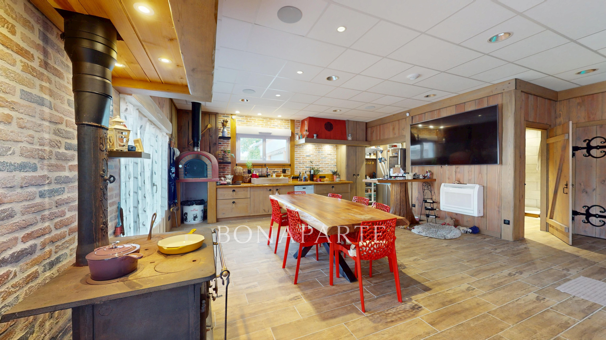 L'entrée s'effectue par un sas qui mène à une grande cuisine aménagée et équipée dotée d'un poêle à bois. Vous trouverez également une chambre au rez-de-chaussée, une salle de bains, des WC séparés et un vaste salon-séjour de 50 m2 baigné de lumière (avec accès direct à la terrasse) également équipé d'un poêle à bois.