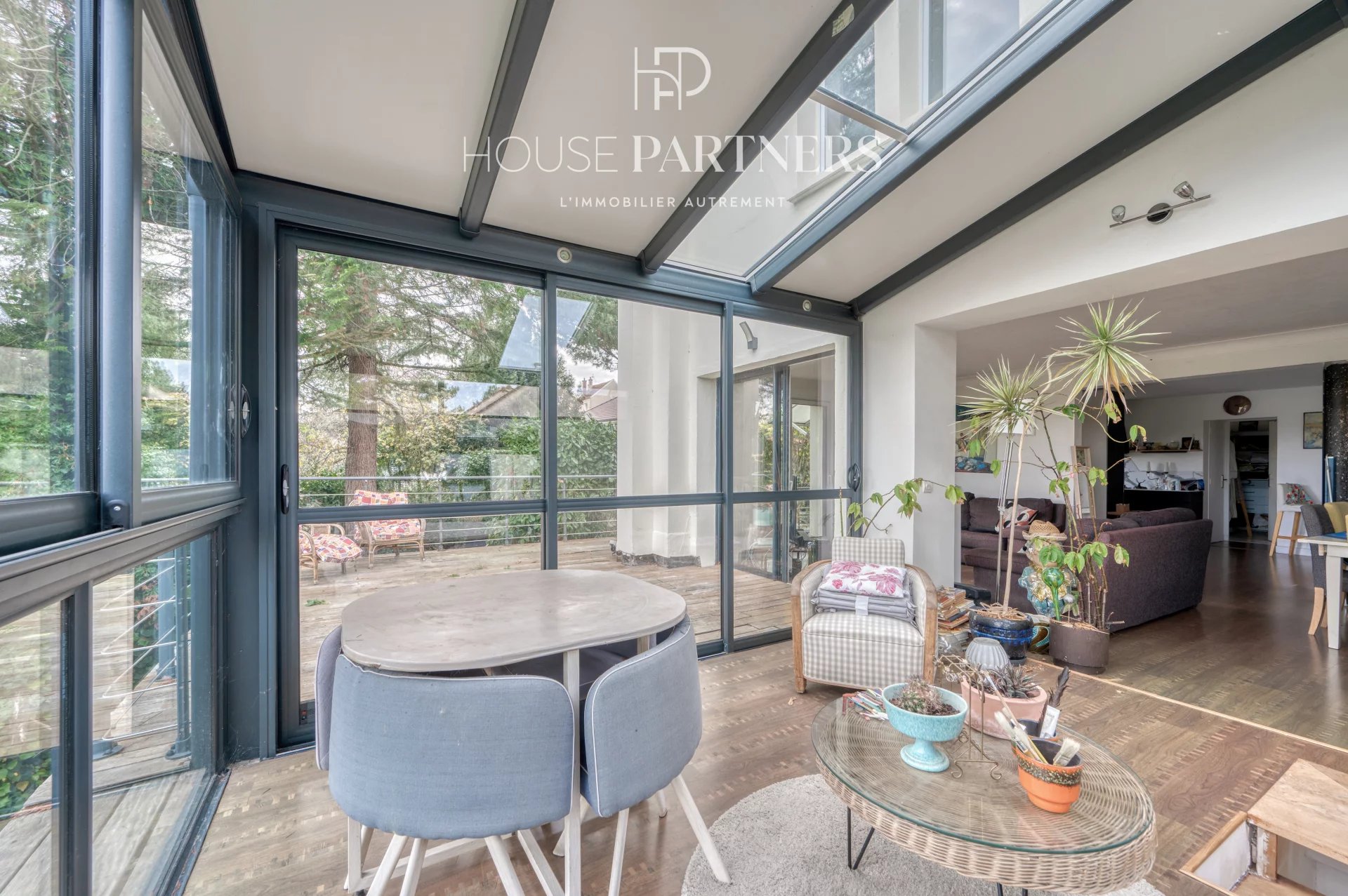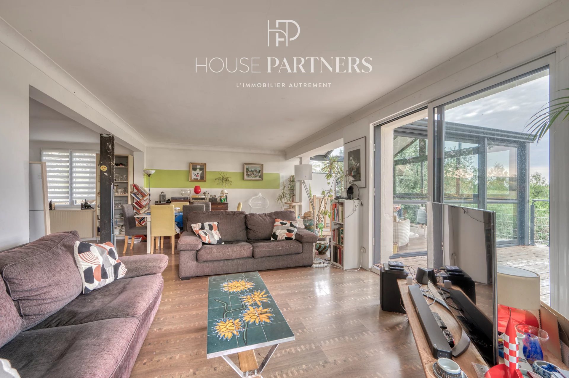 L’entrée ouvre sur un espace de vie traversant regroupant salon, salle à manger et cuisine ouverte. La lumière naturelle est omniprésente grâce à une véranda donnant sur la nature, qui prolonge la pièce principale et invite à la détente.