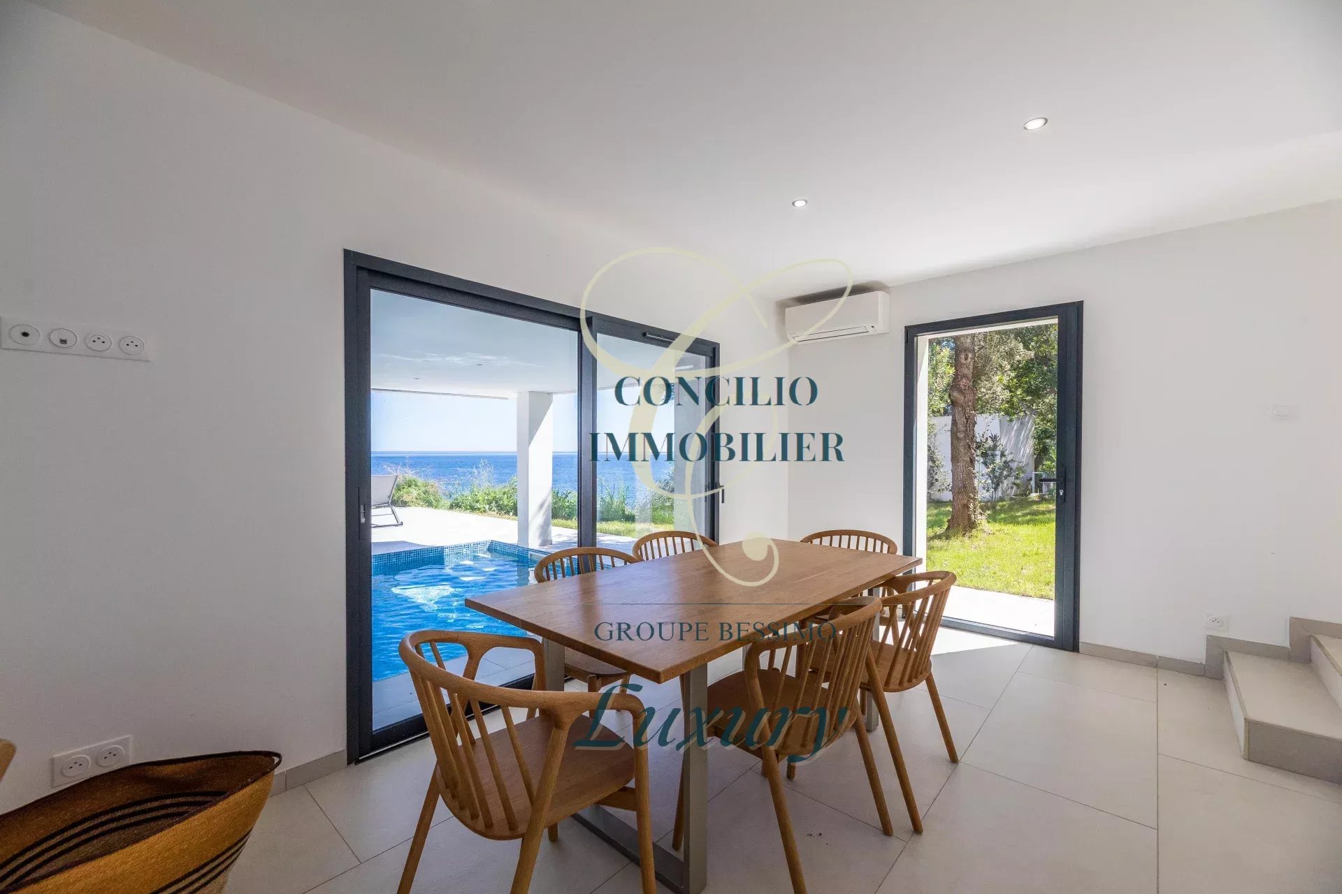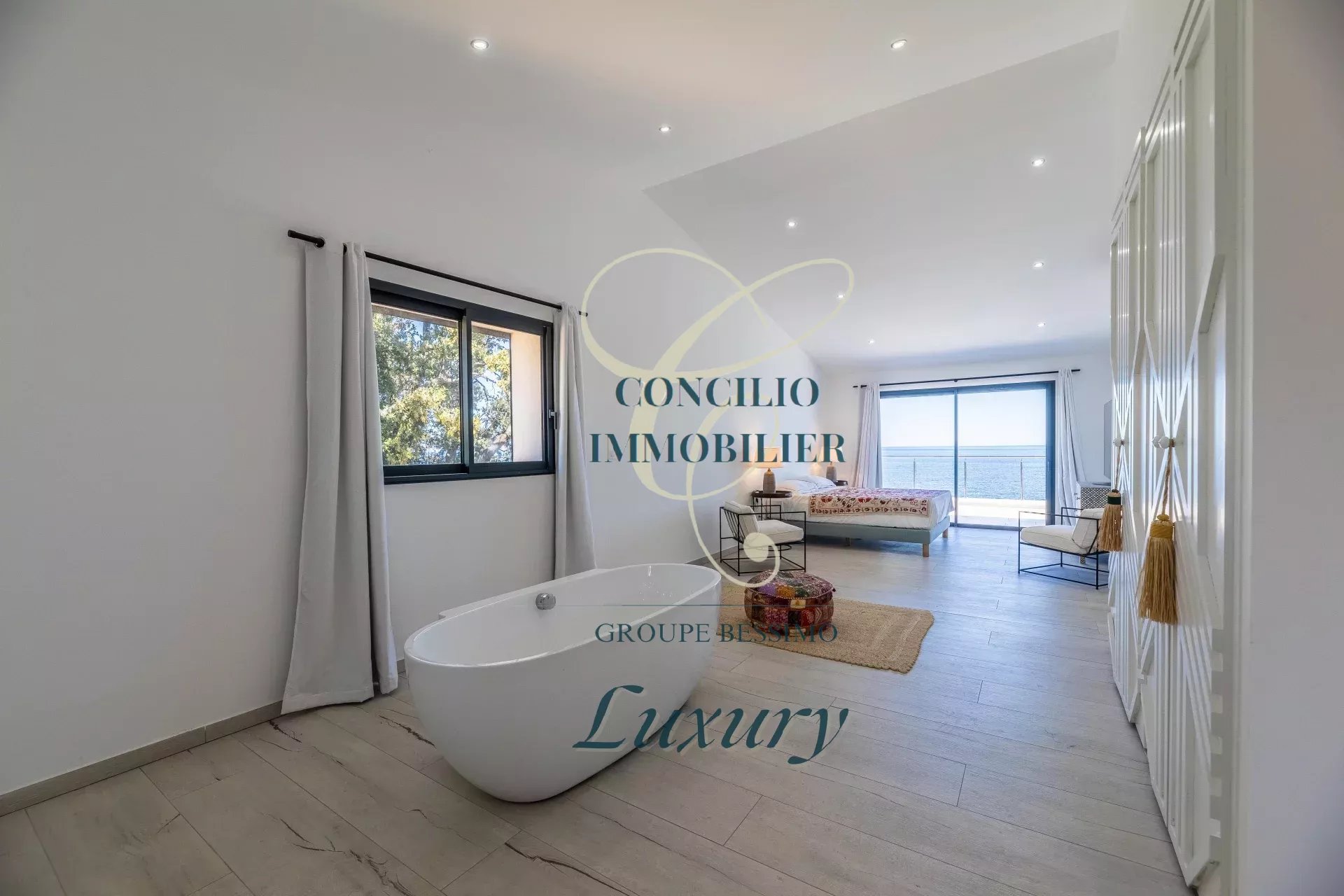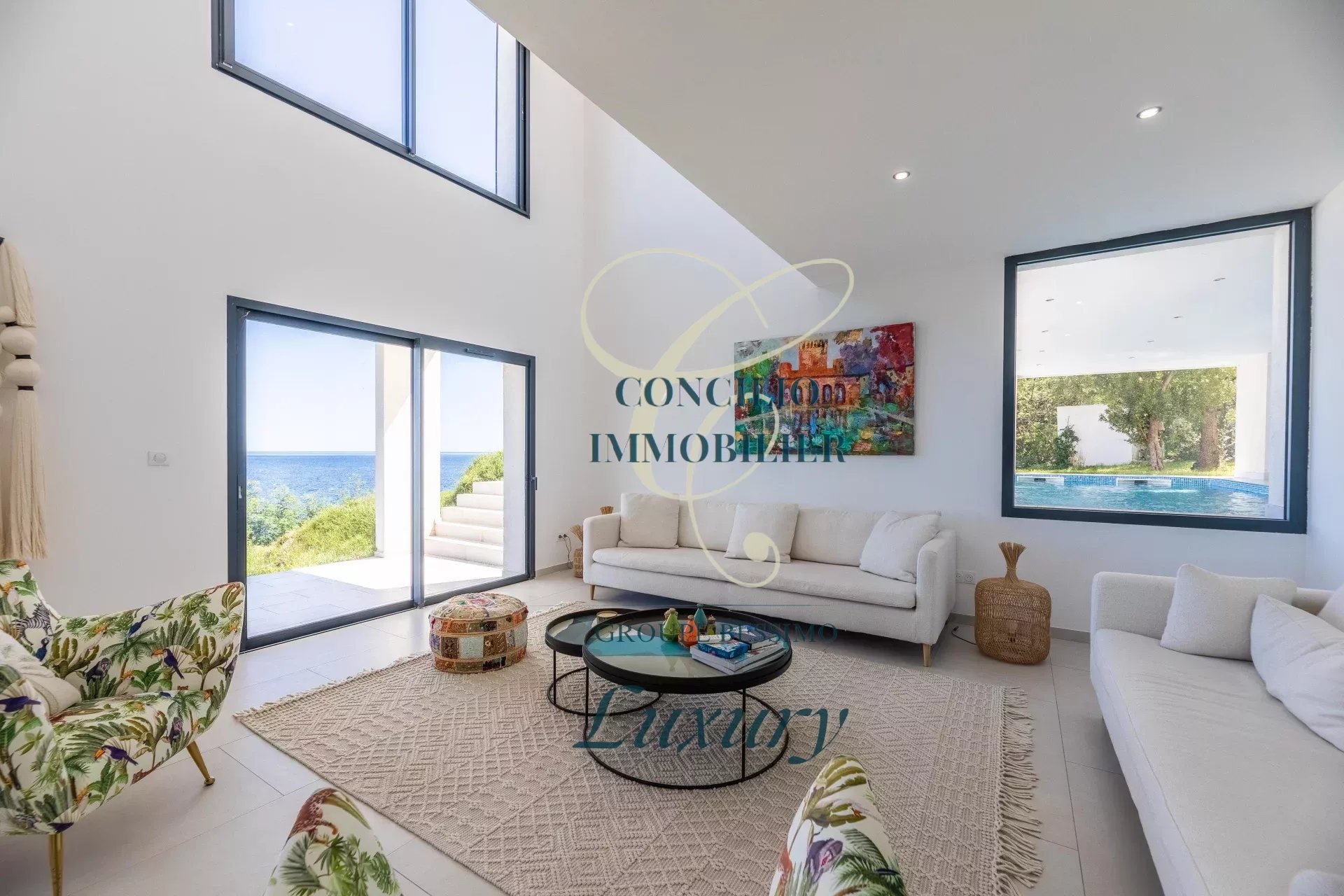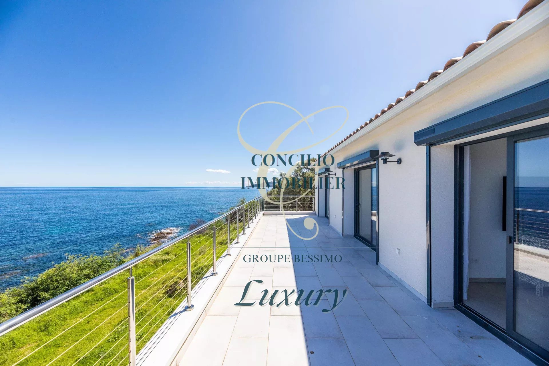 Propriété d’exception située sur la commune de Sari-Solenzara, dans un environnement rare où la mer rencontre la montagne. Cette villa contemporaine pieds dans l’eau bénéficie d’une vue mer panoramique et d’un accès direct et exclusif à la mer par un escalier privé menant à une crique d’eau turquoise. Entièrement rénovée en 2022, la villa développe une surface habitable de 316 m² pour une surface totale de 590 m². Elle offre des volumes généreux et des prestations haut de gamme, pensées pour sublimer son environnement naturel. Le rez-de-chaussée accueille un vaste espace de vie baigné de lumière comprenant un salon, une salle à manger et une cuisine ouverte entièrement équipée, ainsi qu’une suite parentale avec salle d’eau. L’ensemble est prolongé par de larges terrasses panoramiques face à la mer. À l’étage, trois suites indépendantes, chacune disposant de sa salle d’eau privative, offrent calme et intimité. La propriété comprend également un salon secondaire, une seconde cuisine et une buanderie, garantissant un confort optimal pour une résidence principale ou secondaire. Implantée sur un terrain de 2 556 m², la villa dispose d’une piscine à débordement face à la mer ainsi que d’un garage complétant cet ensemble rare. Alliance parfaite entre design contemporain, nature préservée et accès direct à la mer, cette propriété illustre l’art de vivre méditerranéen dans toute sa splendeur. Les informations sur les risques auxquels ce bien est exposé sont disponibles sur le site Géorisques.