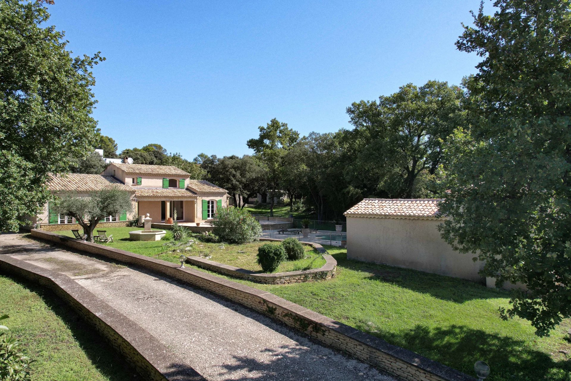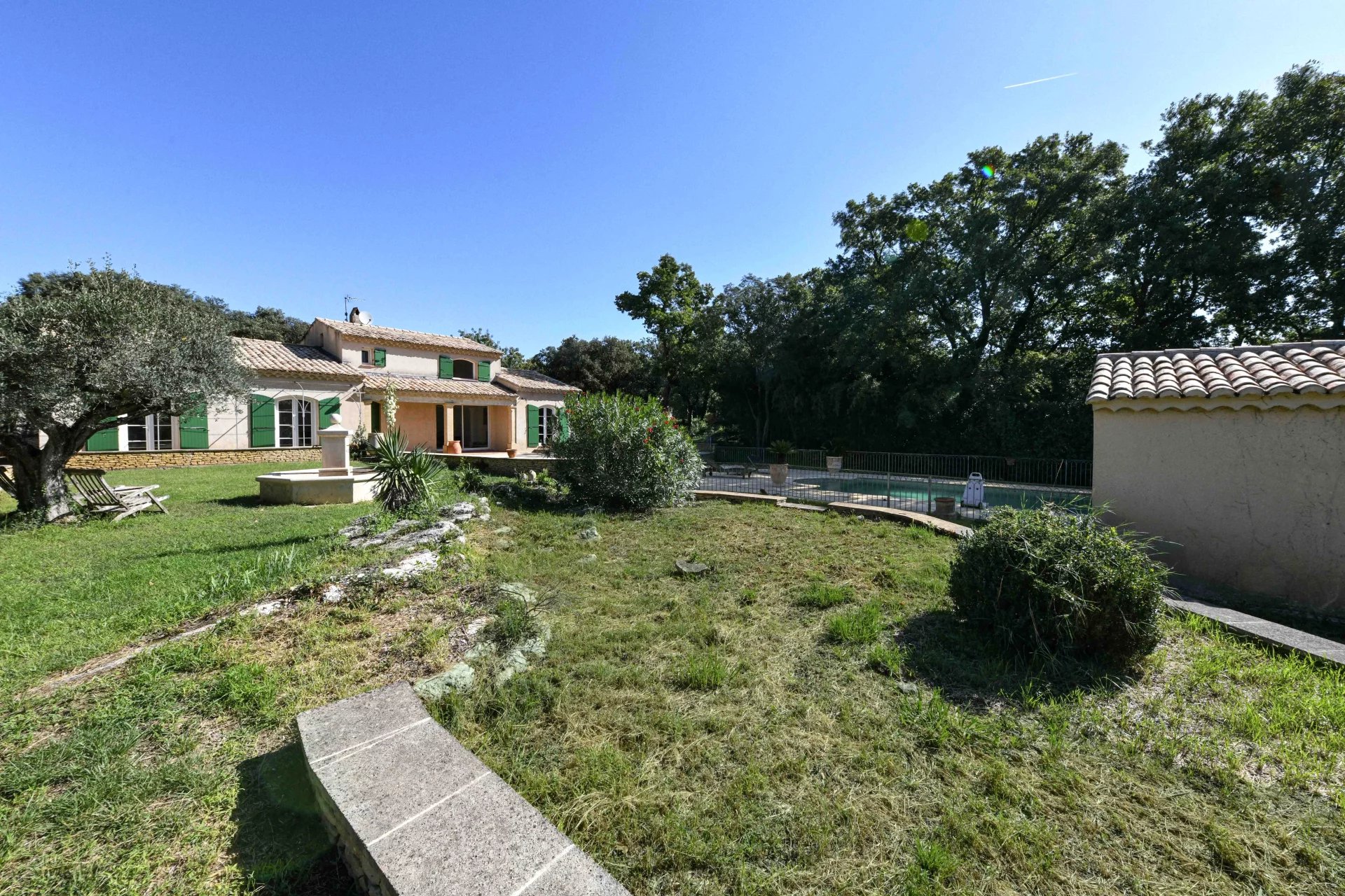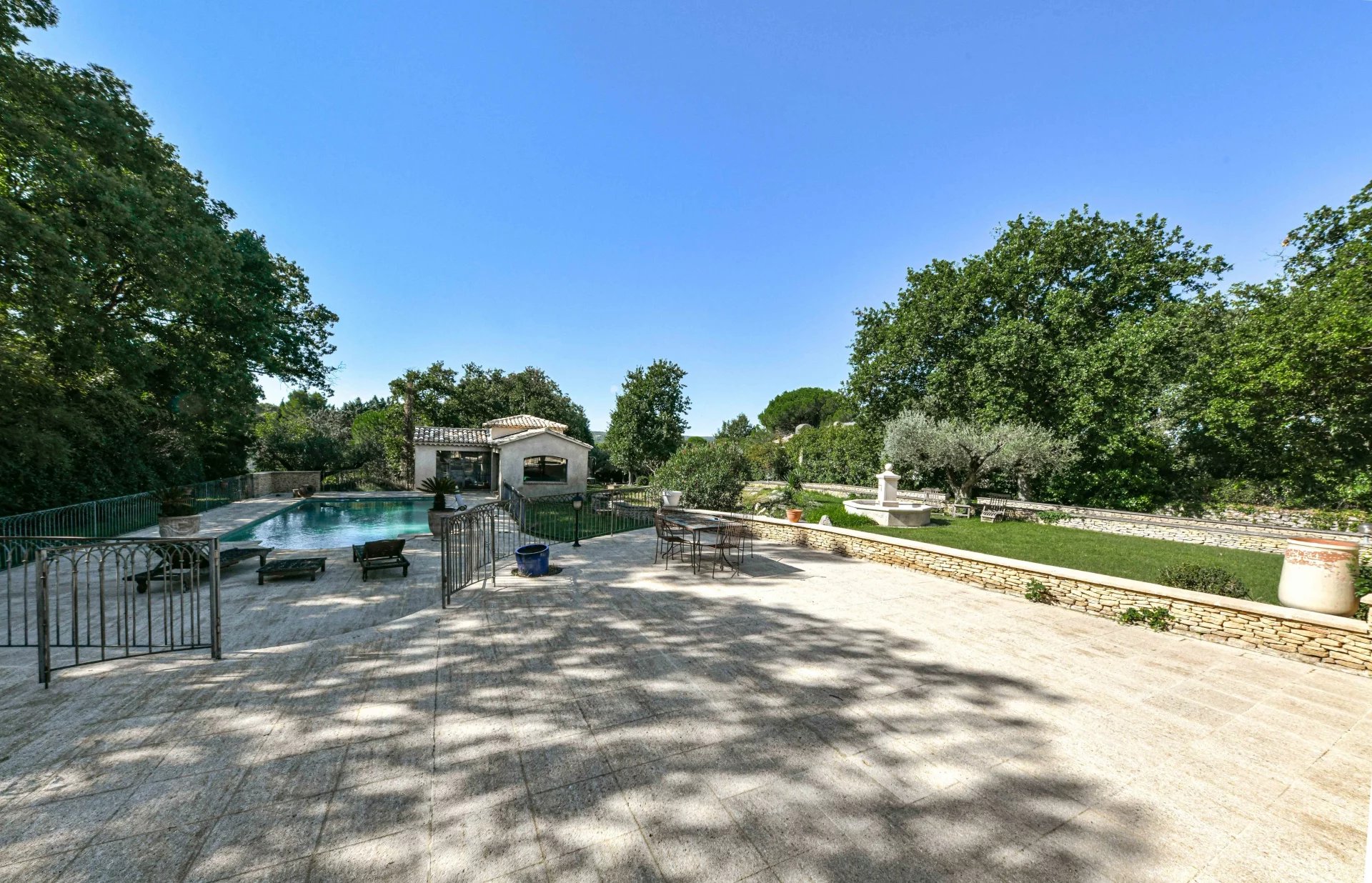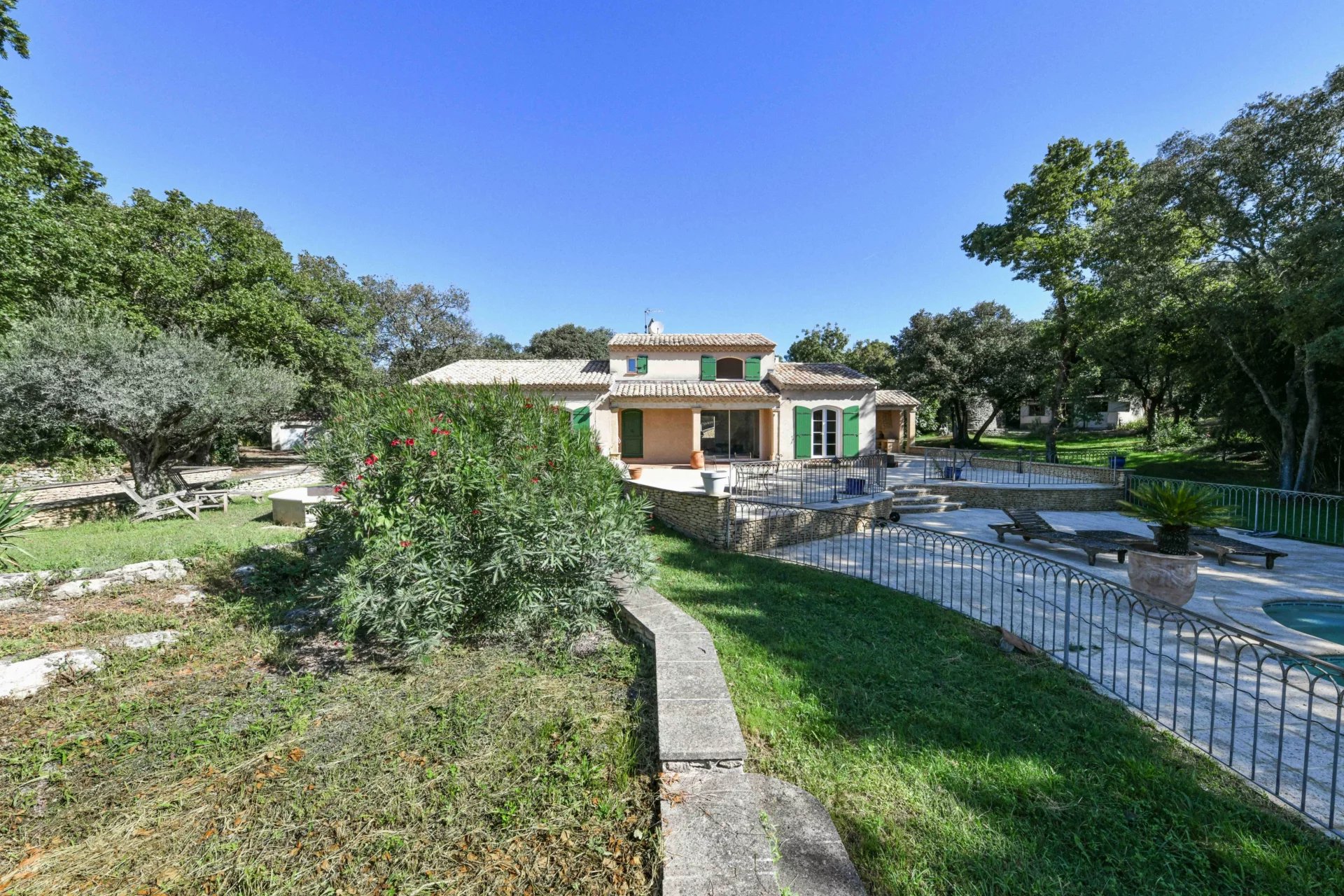 Belles pièces de vie ouvertes sur les terrasses. 4 chambres, 3 salles de bains, bureau Jardin bucolique de 4763 m², piscine 10 x 5m, poolhouse, garage, atelier Située dans un village avec commerces proche du Pont du Gard Photos non contractuelles : 2 chambres non meublées