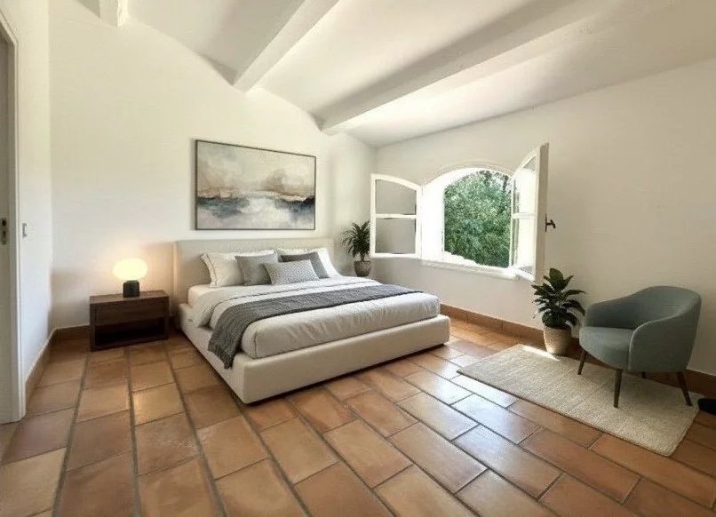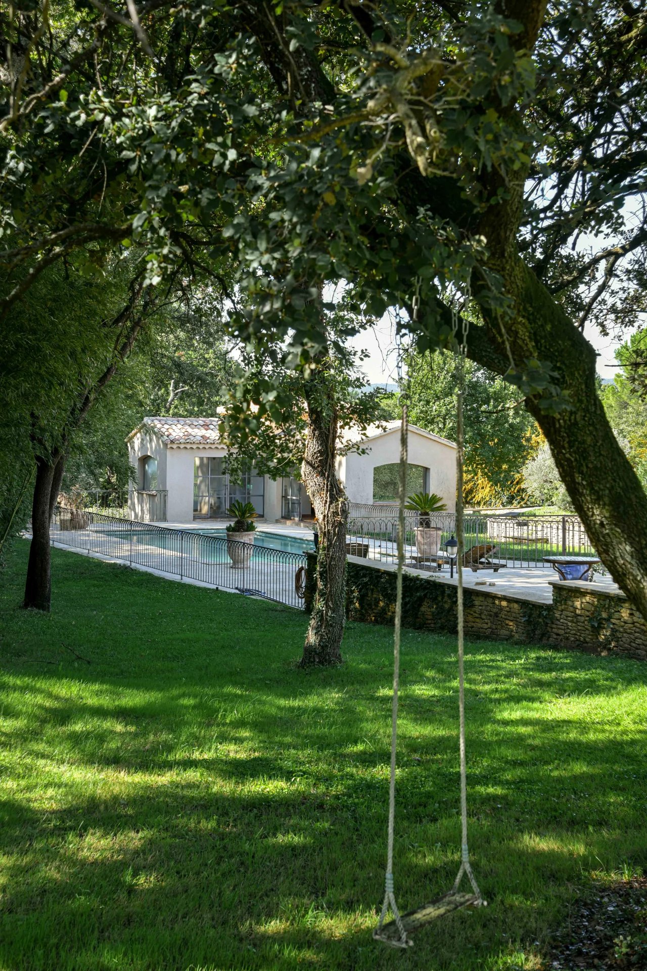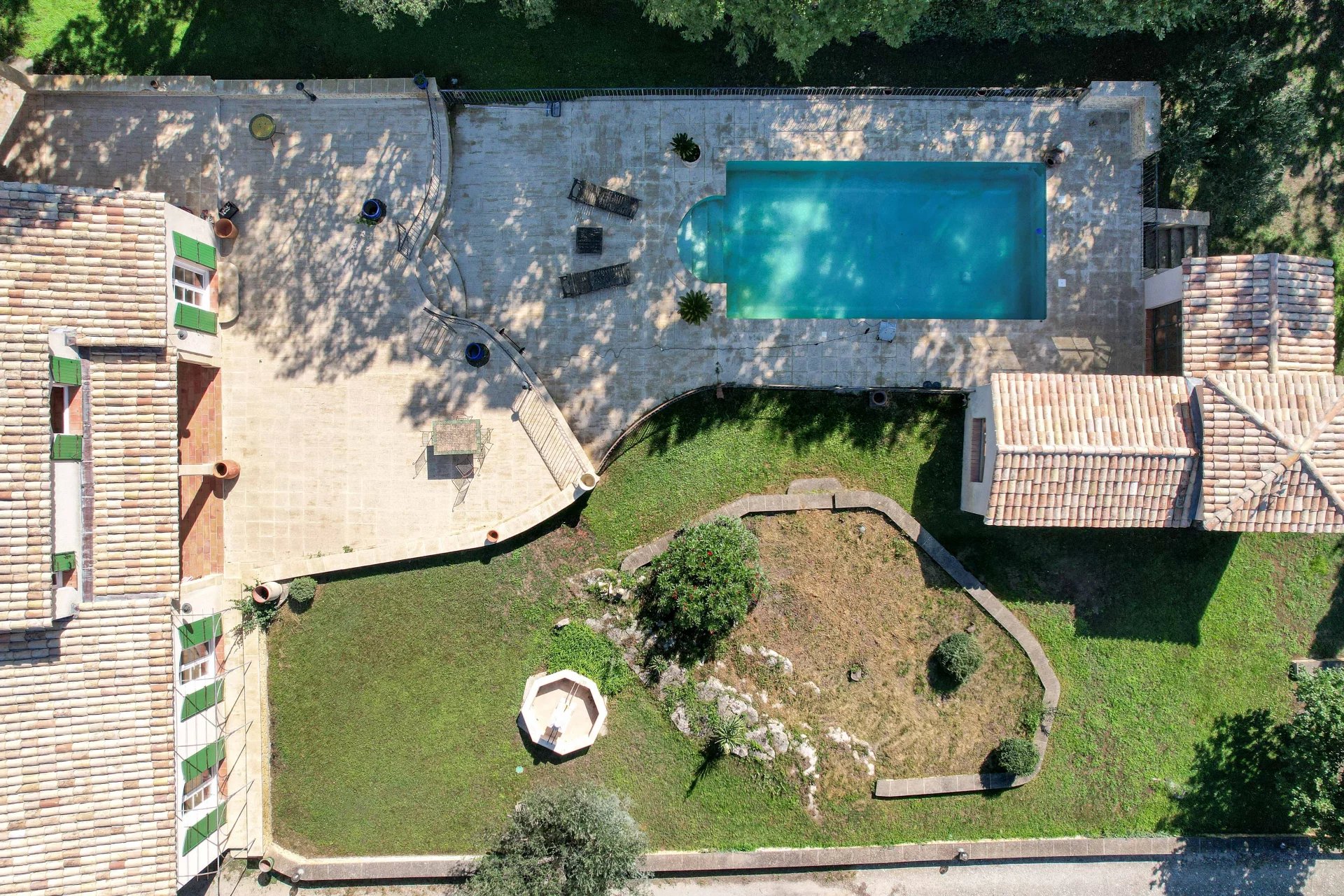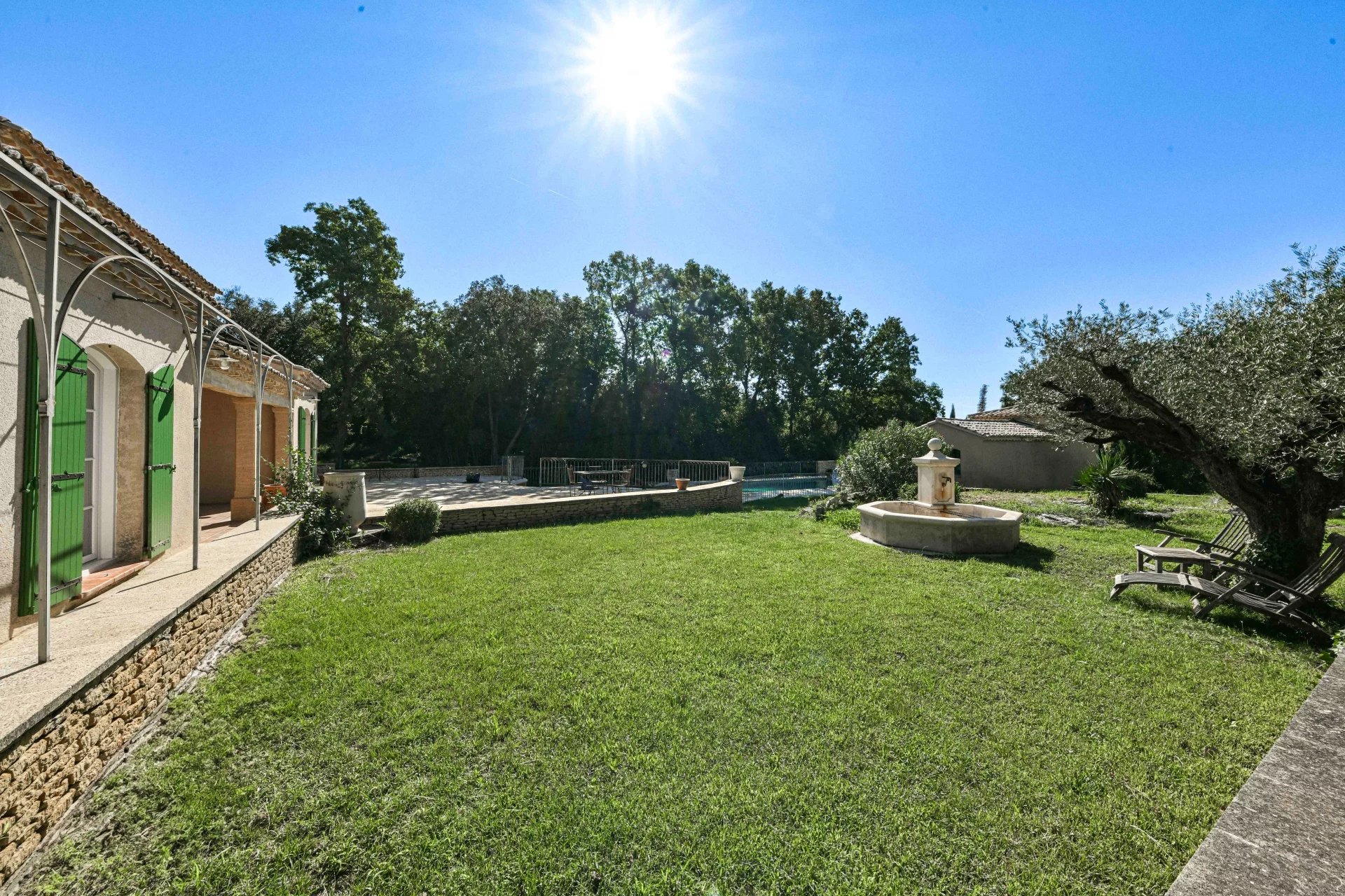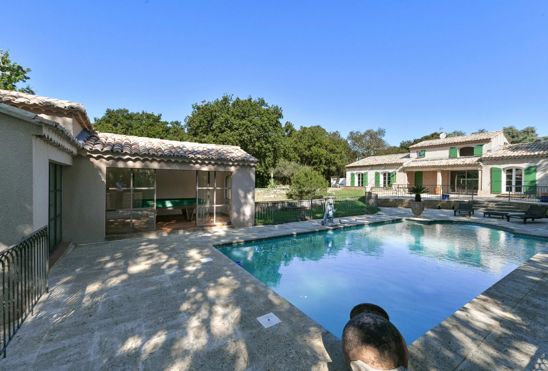 Belles pièces de vie ouvertes sur les terrasses. 4 chambres, 3 salles de bains, bureau Jardin bucolique de 4763 m², piscine 10 x 5m, poolhouse, garage, atelier Située dans un village avec commerces proche du Pont du Gard Photos non contractuelles : 2 chambres non meublées