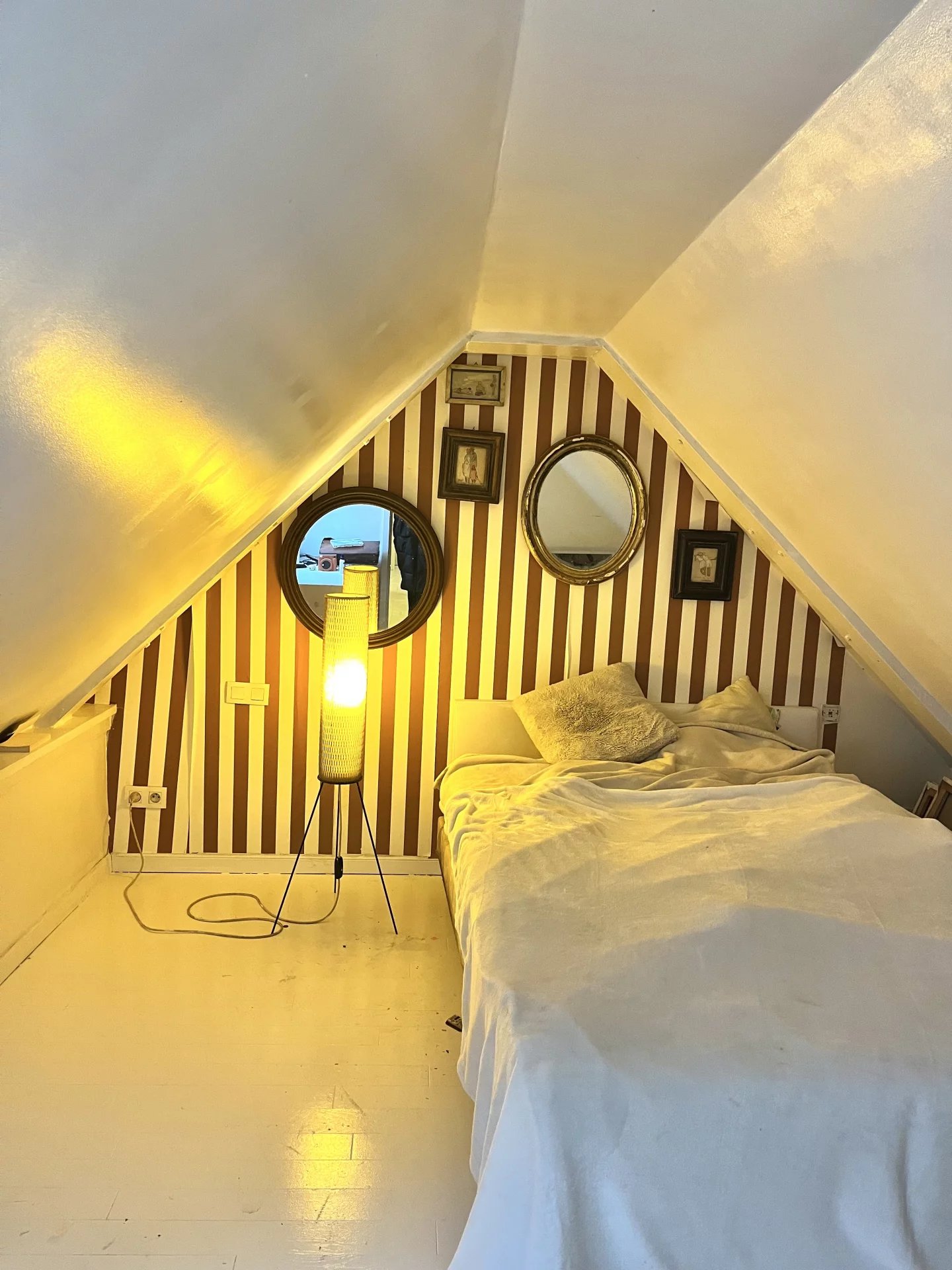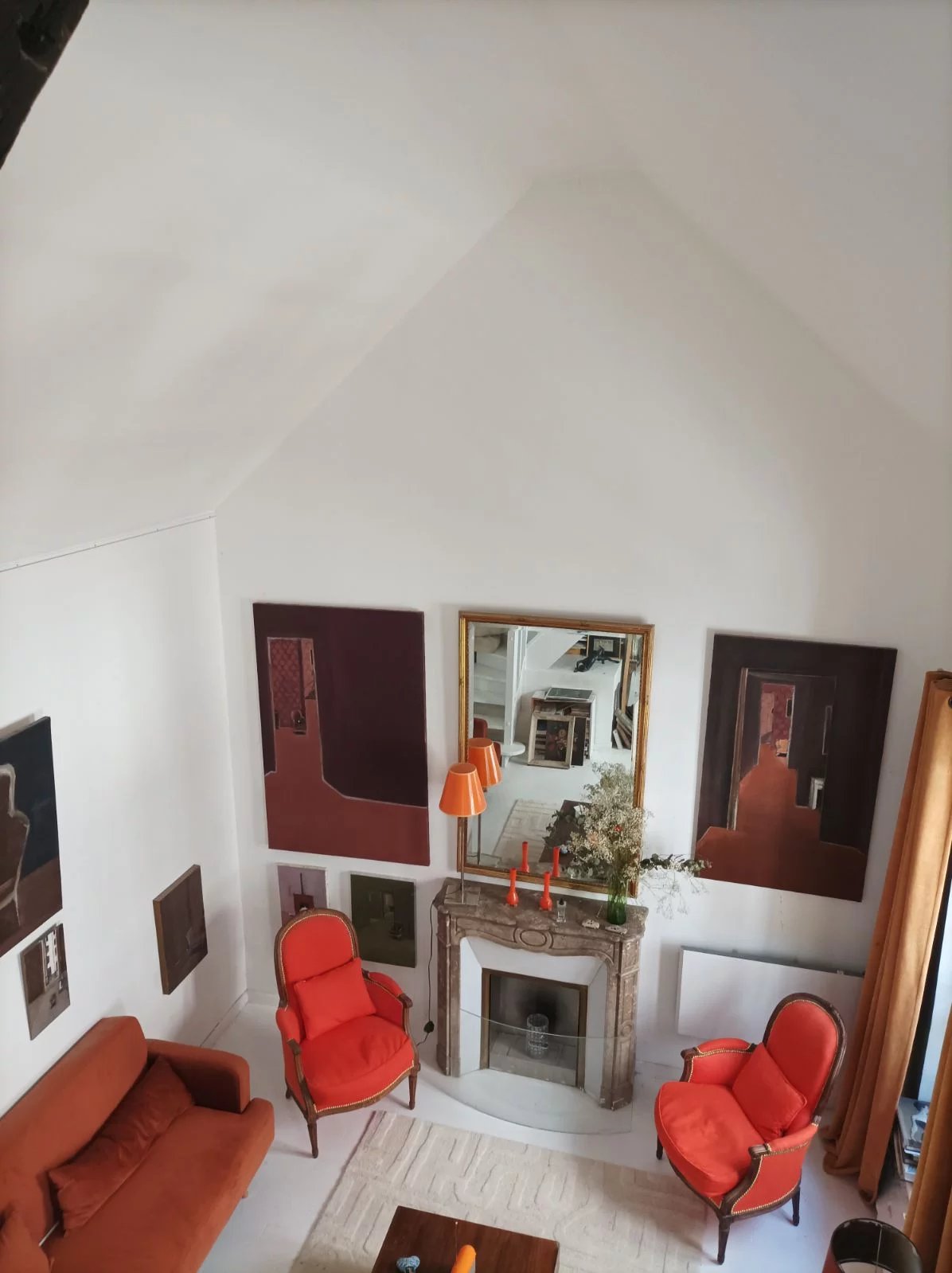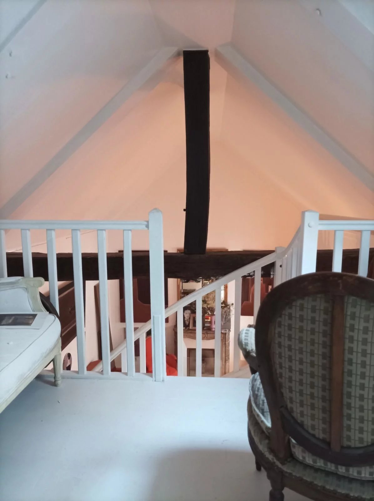 Un escalier ''ouvert'' part de ce salon pour arriver au bureau en mezzanine, à la salle de bain et à la chambre.