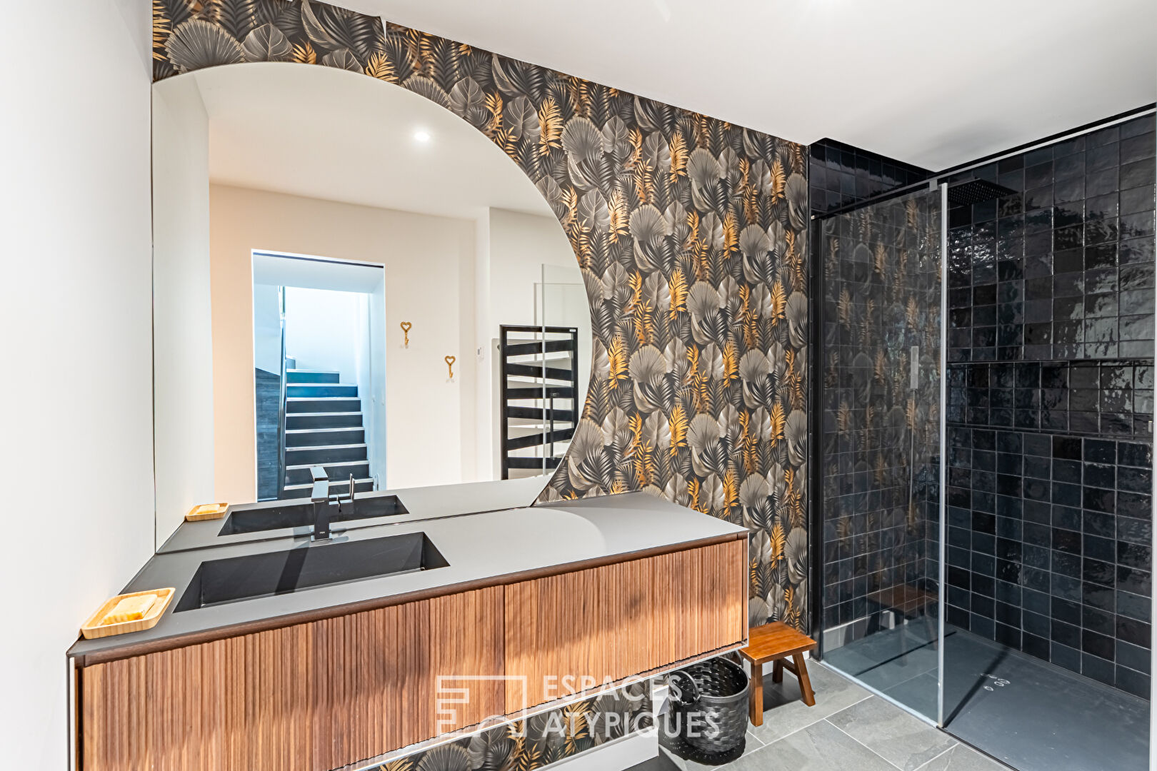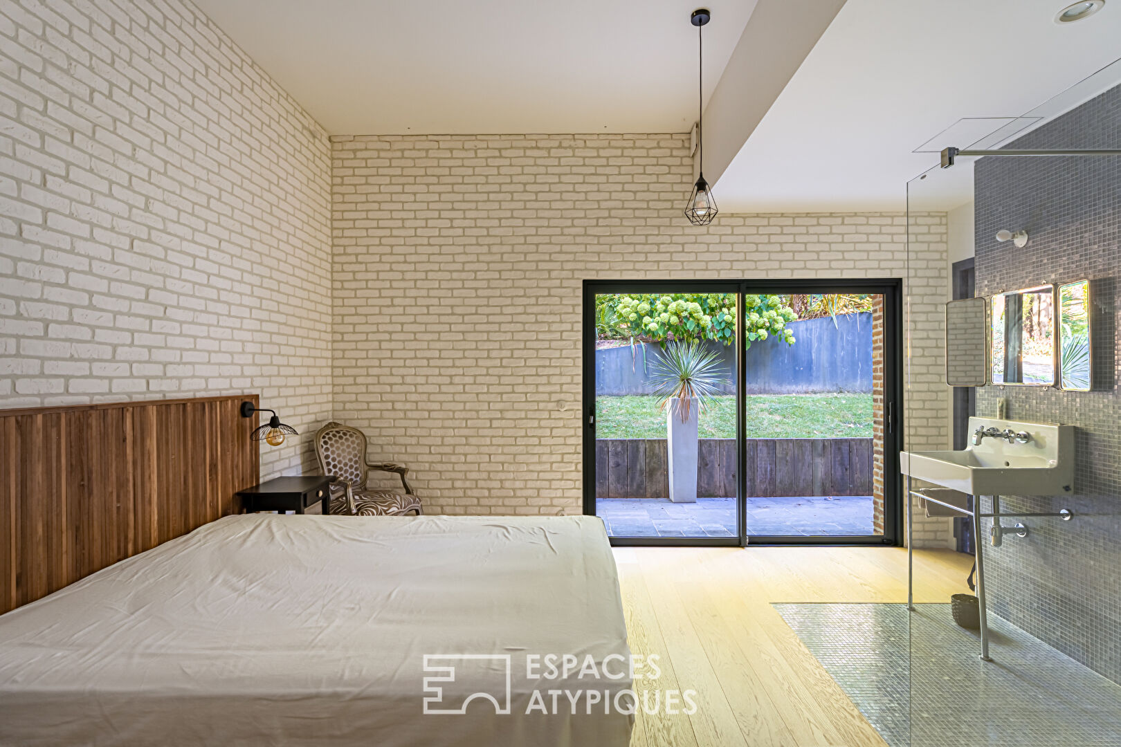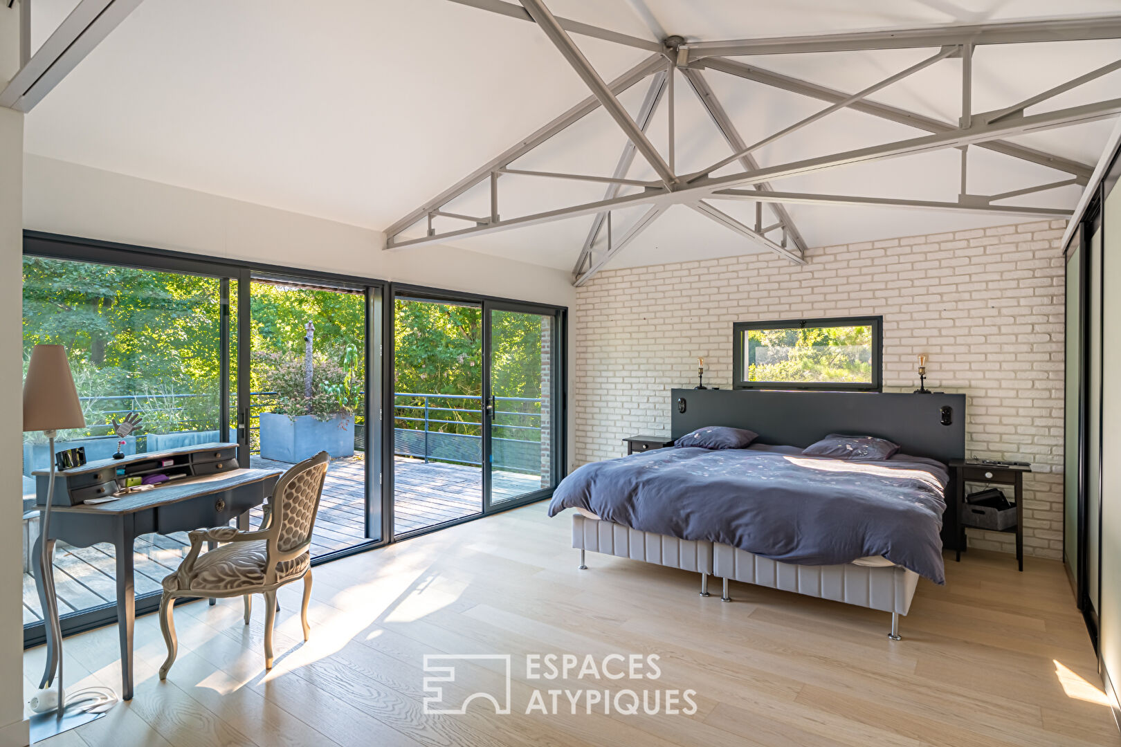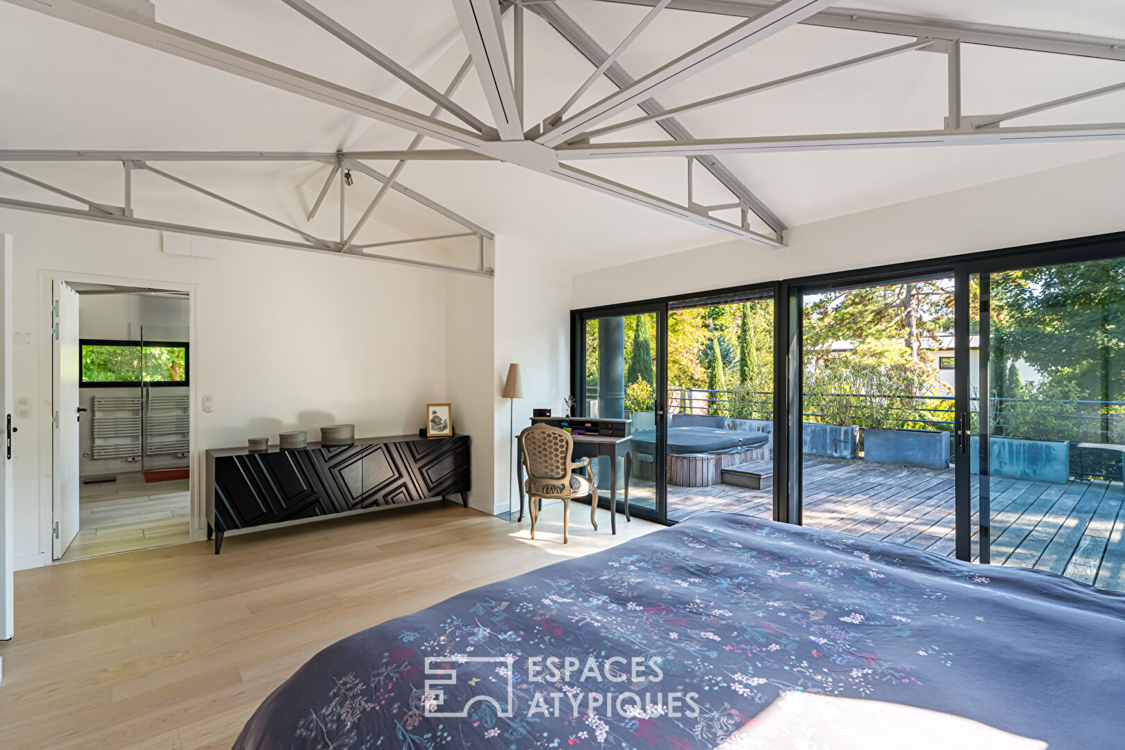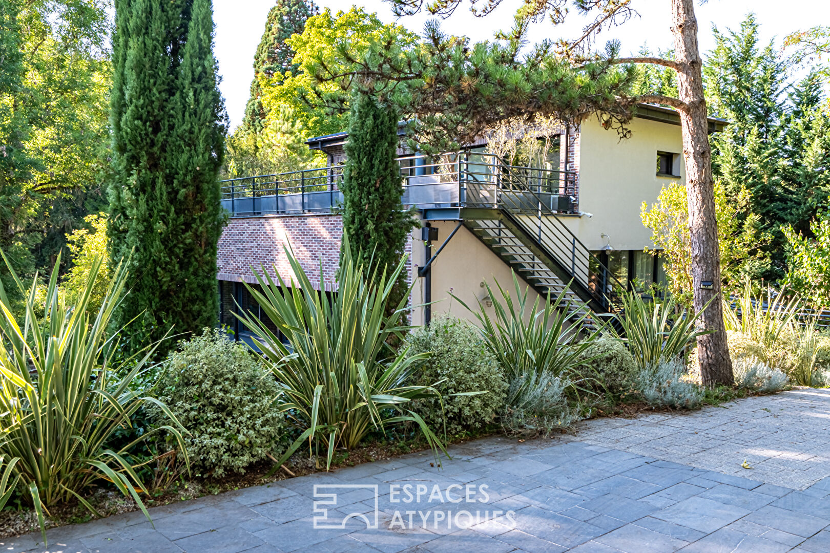 Cette maison contemporaine est située dans une impasse, au calme et sans vis-à-vis, à la lisière de la Forêt de St Cucufa sur les hauteurs de Rueil-Malmaison, proche des collèges et lycées de renom ; Passy Buzenval et Danielou. Posée sur un jardin paysager de 1500 m², elle déploie 235 m² de surface habitable sur 3 niveaux. Construite en 2013 en ossature bois, les matériaux et les isolations intérieures et extérieures, combinés à des pompes à chaleur air/eau et air/air en font une maison peu énergivore avec un DPE en classe B. Pour un confort optimal, un poêle à bois insert double face et une climatisation réversible intégrale ainsi qu'une VMC double flux procurent un bien-être inégalé au sein de la maison. Le rez-de-jardin s'ouvre au travers de grandes baies vitrées sur la pièce de vie de 94 m² avec un espace cathédrale salle à manger/ cuisine, au mobilier professionnel en inox et les murs en briques apparentes qui affirment l'atmosphère industrielle du lieu. L'îlot central avec son plan de travail en corian et sa hotte escamotable intégrée s'ajoutent aux prestations haut de gamme qui définissent cette maison exclusive. Quelques marches plus bas se trouve l'espace salon au parquet en chêne massif qui dispose de son coin bar pour plus de convivialité. Deux belles chambres de 20 m² avec leurs salles d'eau intégrées ainsi qu'un WC indépendant complètent ce niveau. Au premier étage, un grand palier de 15 m² dessert deux autres chambres de 19 m² et 12 m² qui se partagent une salle d'eau avec WC. Le dernier étage est dédié à la suite parentale composée d'une grande chambre avec dressing de 28 m² et d'une salle de bains de 20 m² avec baignoire balnéo, douche italienne, WC et dressing. L'espace parental s'ouvre sur une terrasse plein sud de 54 m² avec son jacuzzi. Un sous-sol de 48 m² comprend la chaufferie, un atelier et une cave. La domotique est au rendez-vous sur votre téléphone : - Volets roulants métal orientables intégrés dans la structure - Climatisation réversible - Eclairage de chaque pièce - Alarme et caméras extérieures - Portail électrique Concernant les extérieurs, un cabanon est dédié au rangement d'outils de jardinage, 2 robots tondeuses gèrent l'entretien de la pelouse. Les massifs du jardin disposent d'un arrosage automatique ainsi que la terrasse de l'espace parental. Le jardin est piscinable. 2 places de parking dans un garage fermé. 4 places de parking sous 2 carports avec borne de recharge électrique. 2 places en extérieur pour invités. Cette maison dispose d'un emplacement privilégié, au calme et sans vis-à-vis, proche des écoles renommées avec des prestations haut de gamme et permettant de garer 6 voitures. Le mobilier pourra être vendu en sus. CLASSE ENERGIE : B / CLASSE CLIMAT : A Montant moyen estimé des dépenses annuelles d'énergie pour un usage standard, établi à partir des prix de l'énergie des années 2021, 2022 et 2023 : entre 990 euros et 1410 euros Contact : Philippe 0668349509 - RSAC Versailles : 828 047 704