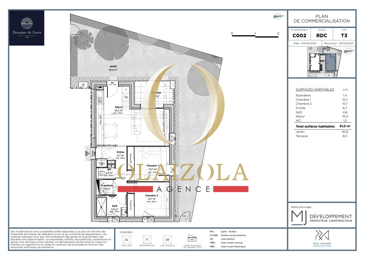 Situé dans le très prisé quartier de l'Uhabia, à seulement 100 mètres de la plage et à 4 minutes des commerces, ce superbe appartement neuf de 3 pièces se trouve au sein d'une résidence intimiste et haut de gamme : le Domaine de l'Aura. Dans un environnement calme et résidentiel, à 7 minutes de l'A63, cet emplacement réunit à la fois confort de vie, accessibilité et cadre balnéaire. Au rez-de-chaussée d'un immeuble de standing à taille humaine (R+1), ce bien de 61,00 m² habitables offre des prestations modernes et soignées. Son séjour lumineux de 25,2 m² orienté ouest s'ouvre sur une terrasse de 6,5 m² et un jardin de 82,6 m² , parfaits pour profiter des belles fins de journée. La cuisine américaine, aménagée et ouverte, prolonge agréablement l'espace de vie. Deux chambres confortables, une salle d'eau contemporaine avec douche à l'italienne, et un WC séparé complètent l'ensemble. L'appartement bénéficie d'un excellent niveau de confort thermique et acoustique grâce à une isolation performante par le toit et les murs, un système de chauffage individuel par pompe à chaleur air/eau et une climatisation réversible. Les volets roulants sont motorisés, les menuiseries en double vitrage et les finitions impeccables. Deux places de stationnement extérieure, un visiophone, un interphone et un accès sécurisé viennent renforcer les prestations de ce bien, vendu avec garantie décennale. Ce bien est idéal pour une résidence principale ou un pied-à-terre au bord de l'océan, alliant prestations de qualité, environnement privilégié et confort de vie à pied. Notre agence vous accueille téléphoniquement du lundi au samedi, de 8h à 19h, afin de répondre à toutes vos questions et de vous accompagner dans vos projets immobiliers. N'hésitez pas à nous contacter pour obtenir des informations personnalisées et un suivi attentif de vos démarches. Reference : OLAVFL1387-C002 VENTE IMMOBILIER BIDART HONORAIRES CHARGE VENDEUR Les informations sur les risques auxquels ce bien est exposé sont disponibles sur le site Géorisques : www.georisques.gouv.fr Copropriété de 4 lots (Pas de procédure en cours). Charges annuelles : 1 euros. Fabrice LANNEBERE (EI) Agent Commercial - Numéro RSAC : 437 681 778 - BAYONNE.