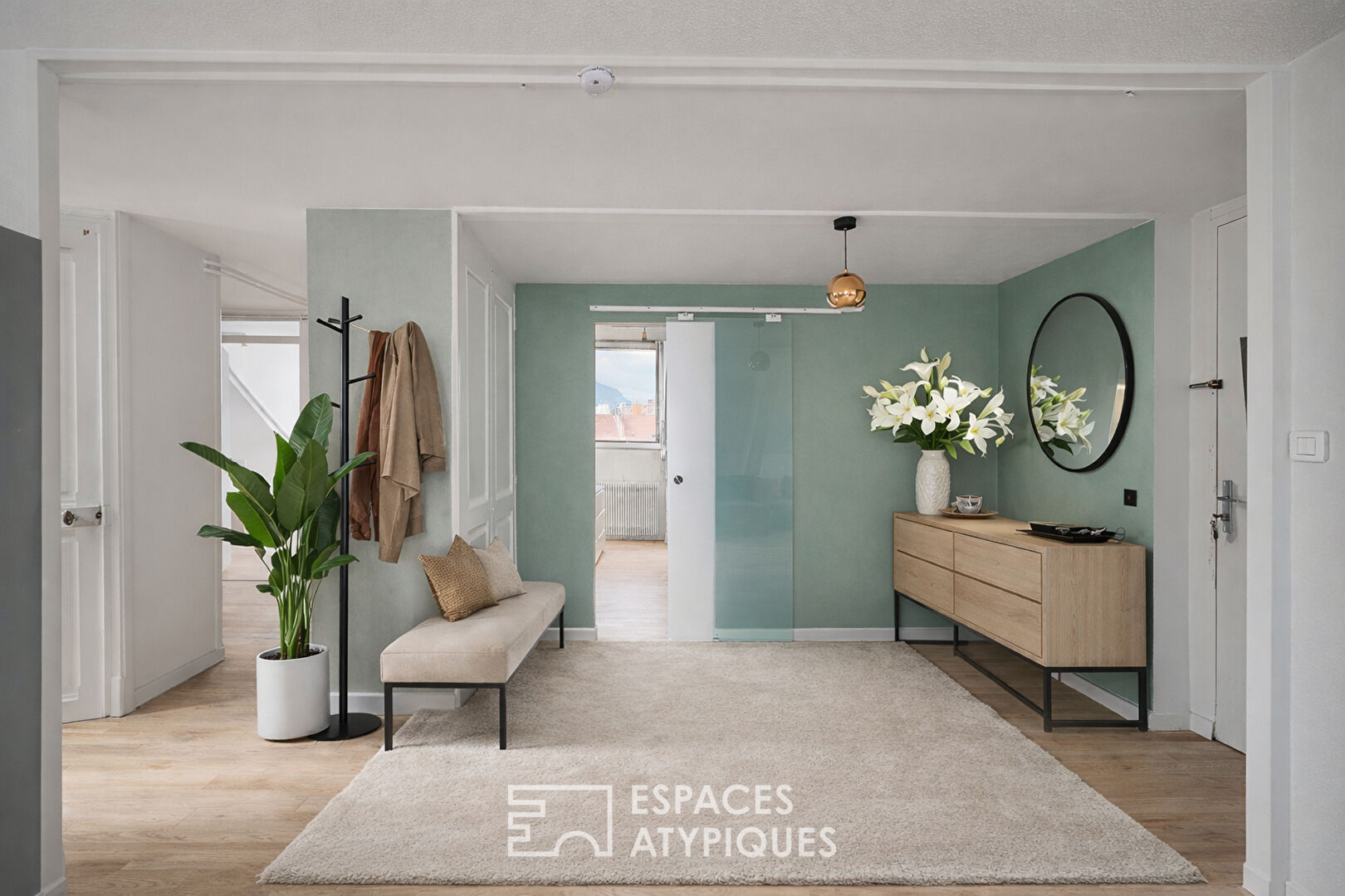 A deux pas de la place Victor Hugo, niché au dernier étage d'une copropriété parfaitement entretenue, cet appartement séduit dès les premiers instants. Rénové avec goût, il allie cachet, confort et modernité. L'entrée s'ouvre sur un bel espace de vie lumineux, baigné de clarté où la cuisine contemporaine, ouverte sur le séjour, créé un lieu chaleureux où il fait bon recevoir ou simplement profiter du calme des toits. La première chambre, séparée par une élégante porte à galandage, laisse passer la lumière et offre un véritable cocon de tranquillité. Une seconde chambre, une salle d'eau fonctionnelle, des toilettes indépendantes et un espace buanderie complètent cet ensemble harmonieux. Deux grandes caves viennent parfaire le confort de ce bien rare. Les parties communes, la toiture et le ravalement ont été récemment refaits, tandis qu'une chaudière Saunier Duval neuve assure des performances énergétiques optimales. Projections d'aménagement non contractuelles. Bien soumis au statut de la copropriété : 9 lots Charges annuelles : 1 145 euros - Pas de procédure en cours. Taxe foncière : 1 441 euros CLASSE ENERGIE : D / CLASSE CLIMAT : D . Montant moyen estimé des dépenses annuelles d'énergie pour un usage standard, établi à partir des prix de l'énergie des années 2021, 2022, 2023 : entre 1 190 euros et 1 660 euros. Les informations sur les risques auxquels ce bien est exposé sont disponibles sur le site Géorisques : www.georisques.gouv.fr Contact : Edwige de Préval (EI) - 06 87 61 23 35 Agent commercial indépendant RSAC Grenoble n° 815 164 280 Copropriété de 11 lots - dont 9 lots habitation. (Pas de procédure en cours). Charges annuelles : 1145 euros. Edwige de PREVAL (EI) Agent Commercial - Numéro RSAC : 815164280 - GRENOBLE.