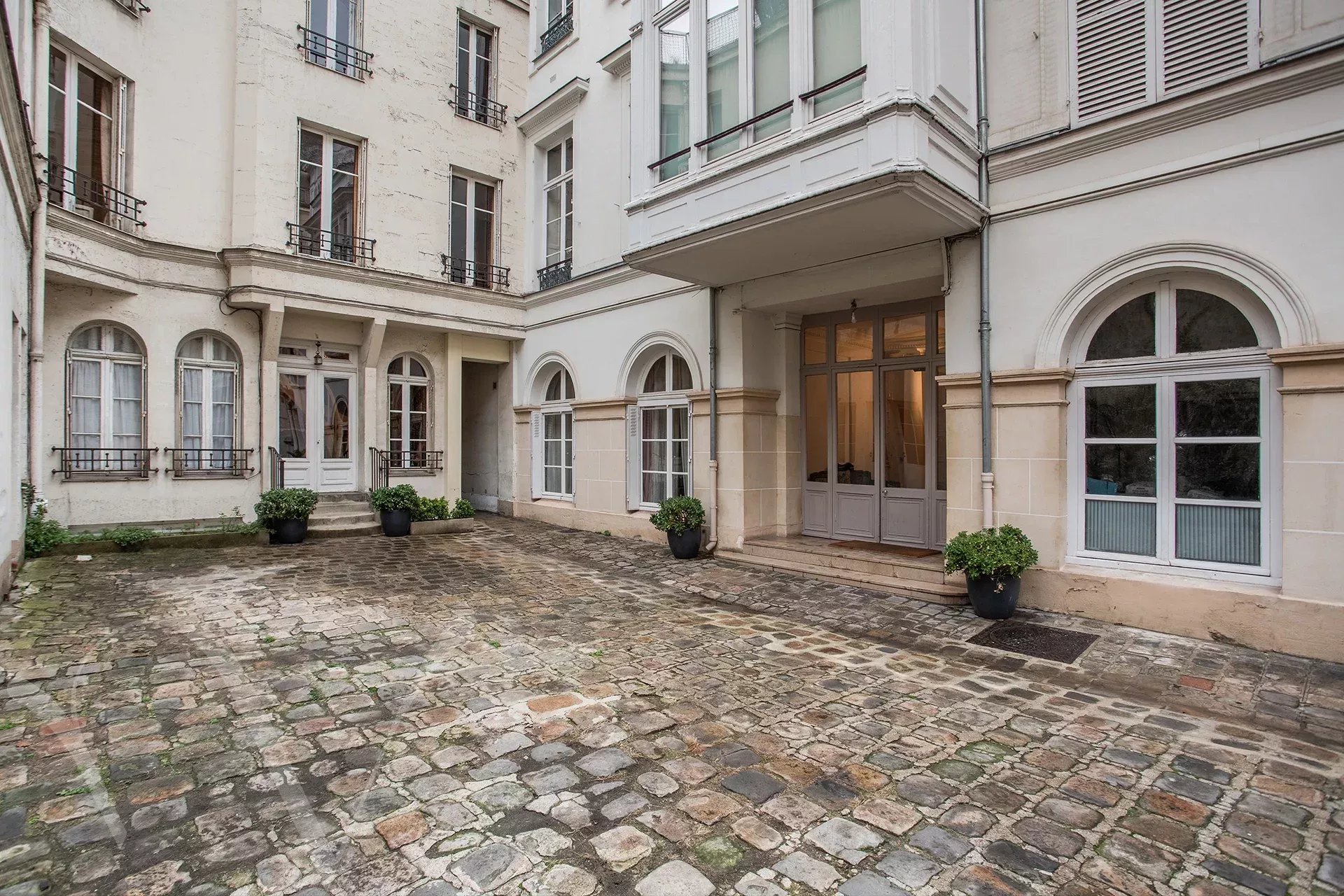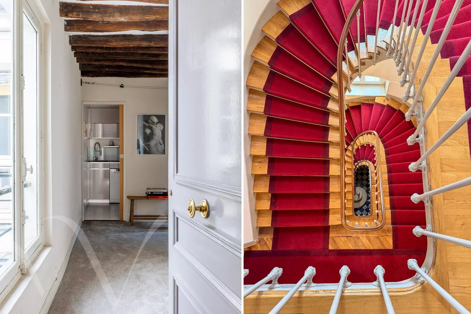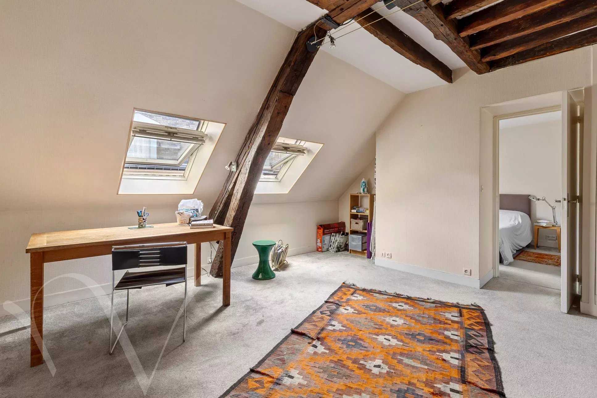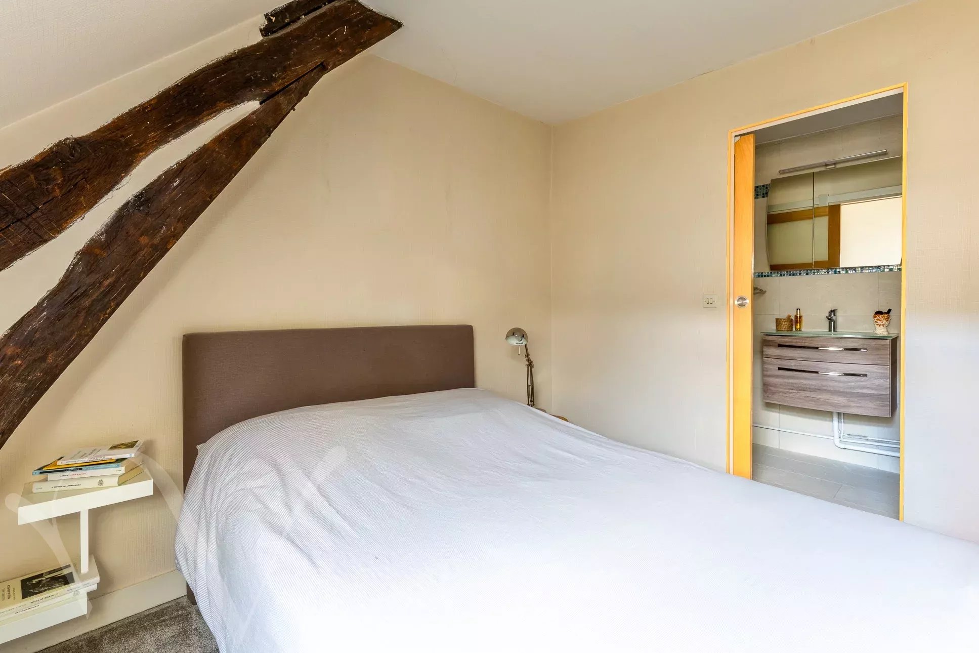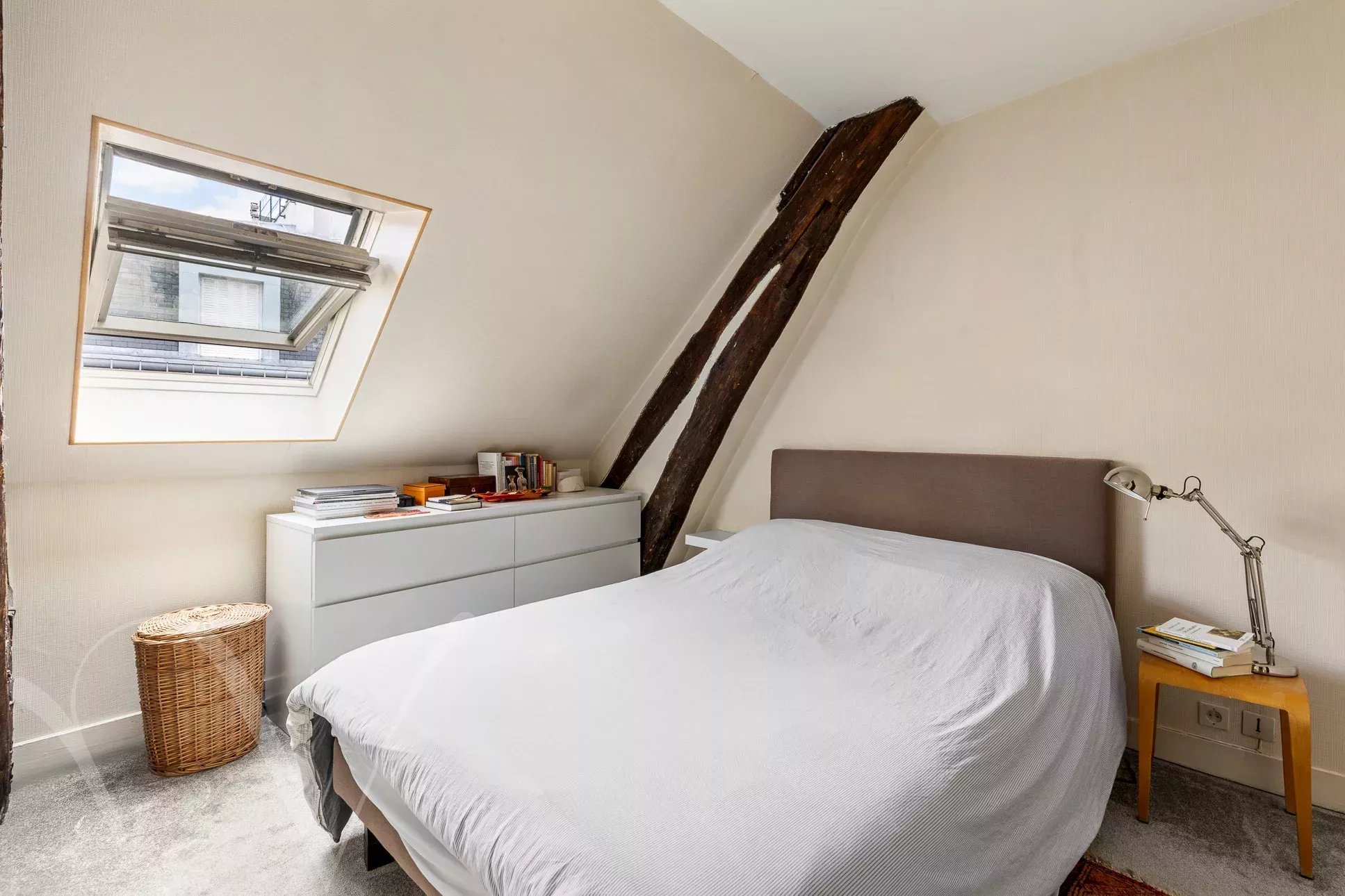 Dans un magnifique hôtel particulier, au 3e étage accessible par un escalier, charmant appartement de 2 pièces au dernier étage, composé d'une entrée desservant un salon avec cheminée et 2 fenêtres sur la rue, une petite cuisine pouvant être ouverte sur le salon et une chambre en suite avec une salle de bains et WC.