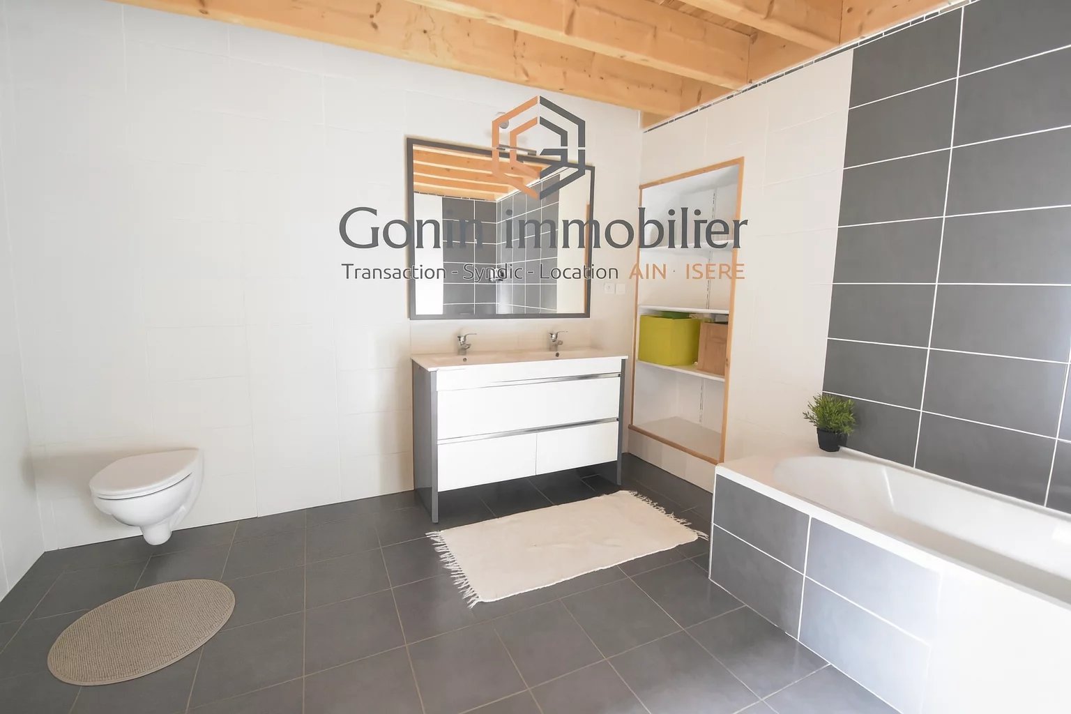 Un séjour lumineux, une grande salle de bains, un WC indépendant et une chambre avec placard intégré.