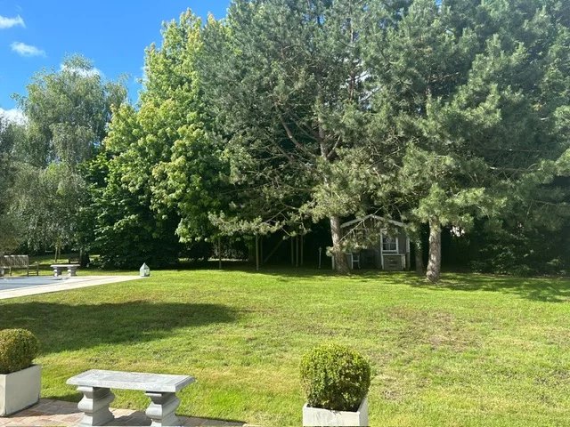 À l'extérieur, le vaste jardin plat accueille une cabane dans les arbres, un potager, un cabanon de jardin, ainsi qu'une superbe terrasse avec bains de soleil faisant face à la piscine chauffée de 10x5 m, créant une véritable oasis de sérénité.