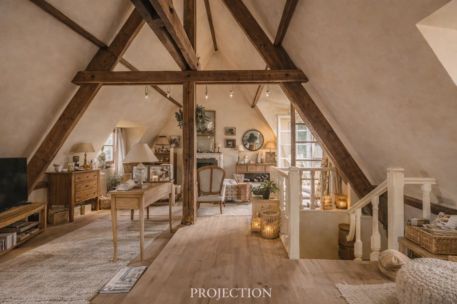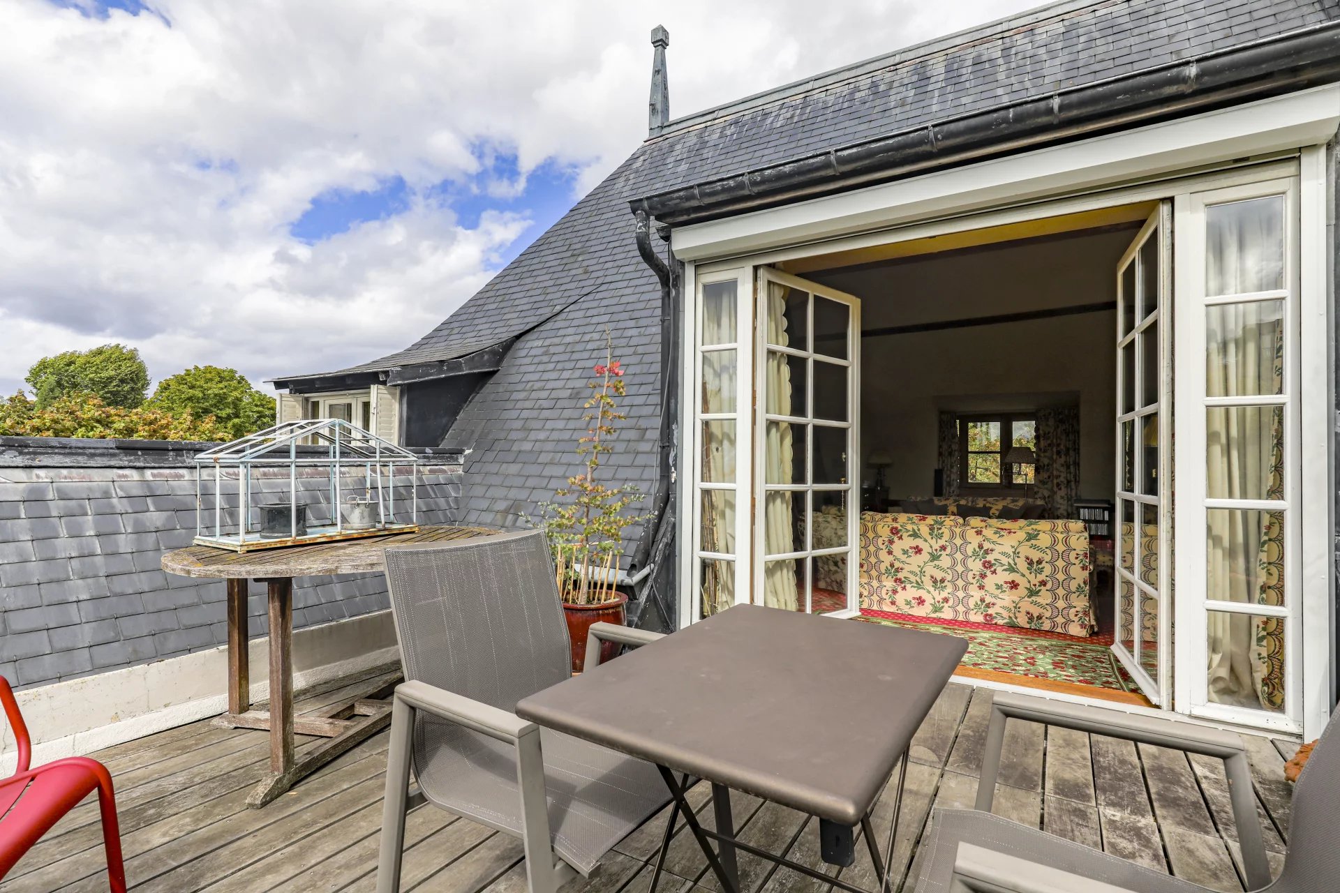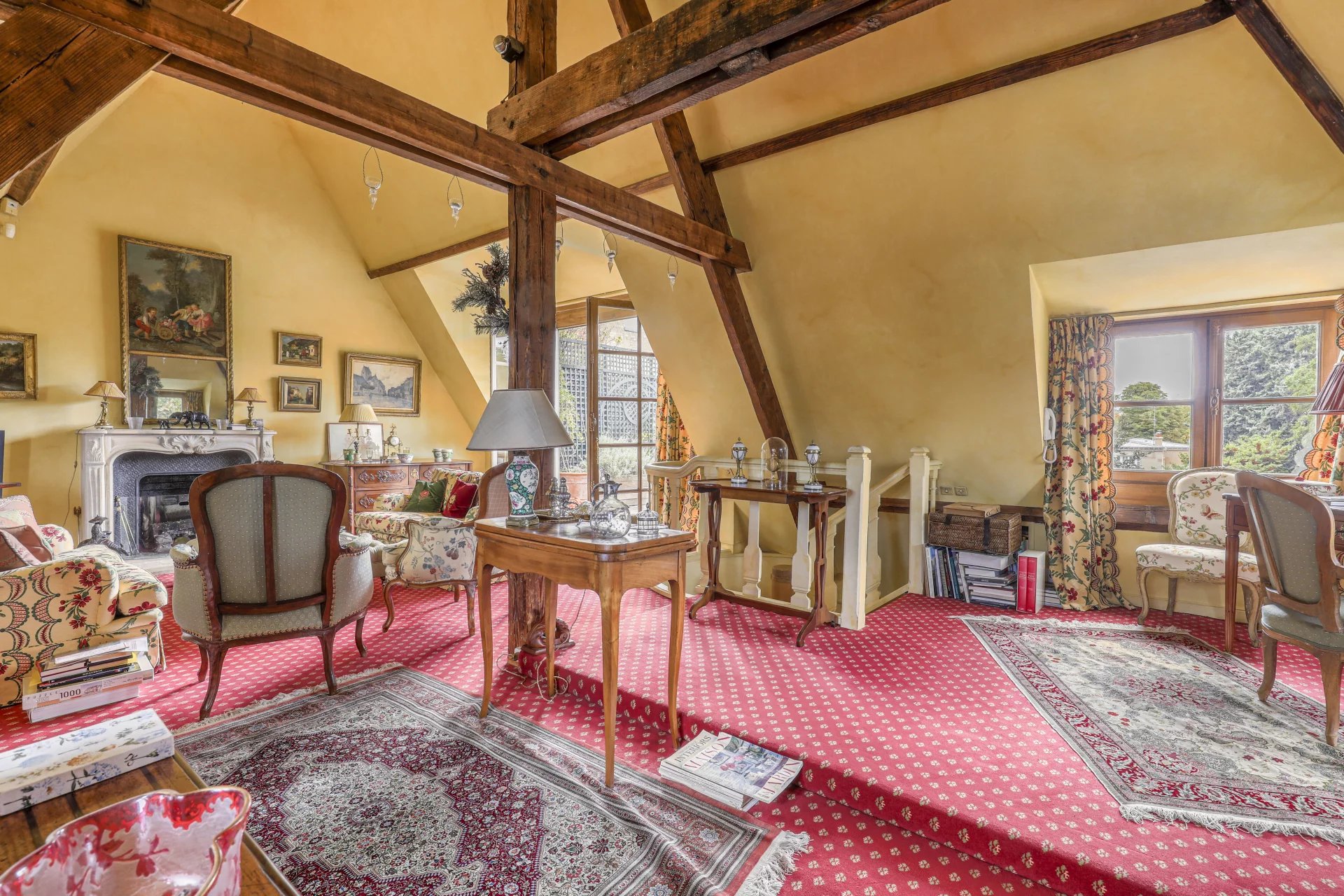 L'appartamento è composto da un pianerottolo, una cucina abitabile, due camere da letto (17 e 21 m2), un bagno con doccia, un bagno di servizio e un ufficio (9 m2). Al piano superiore (ultimo piano) si trova un ampio soggiorno con soffitto a cattedrale (45 m2) con camino e accesso a una terrazza a un piano, esposta a ovest (20 m2).