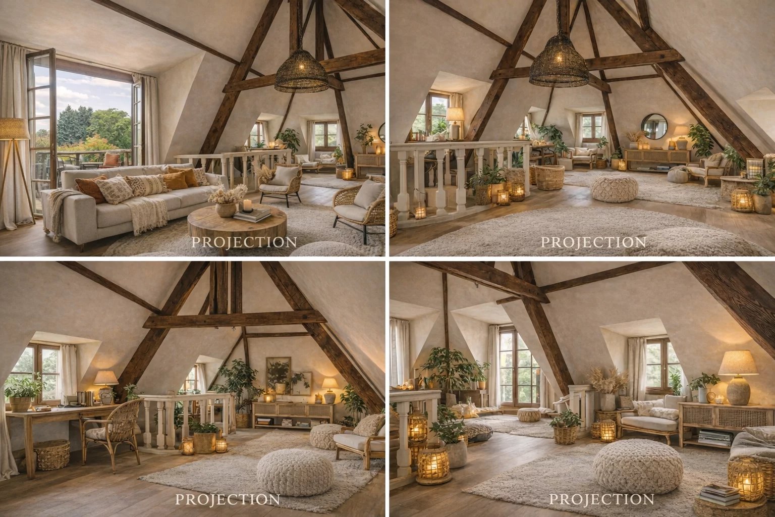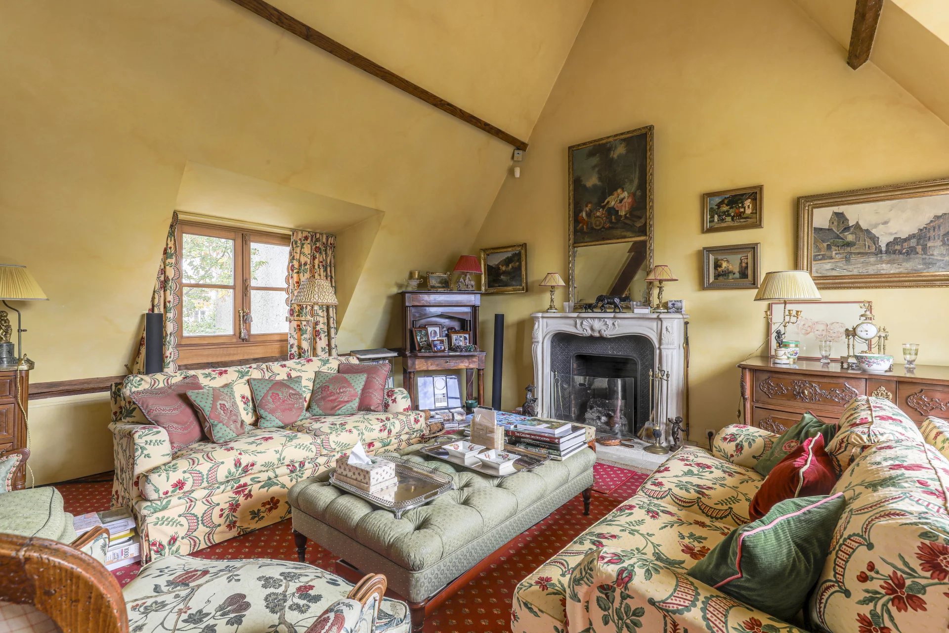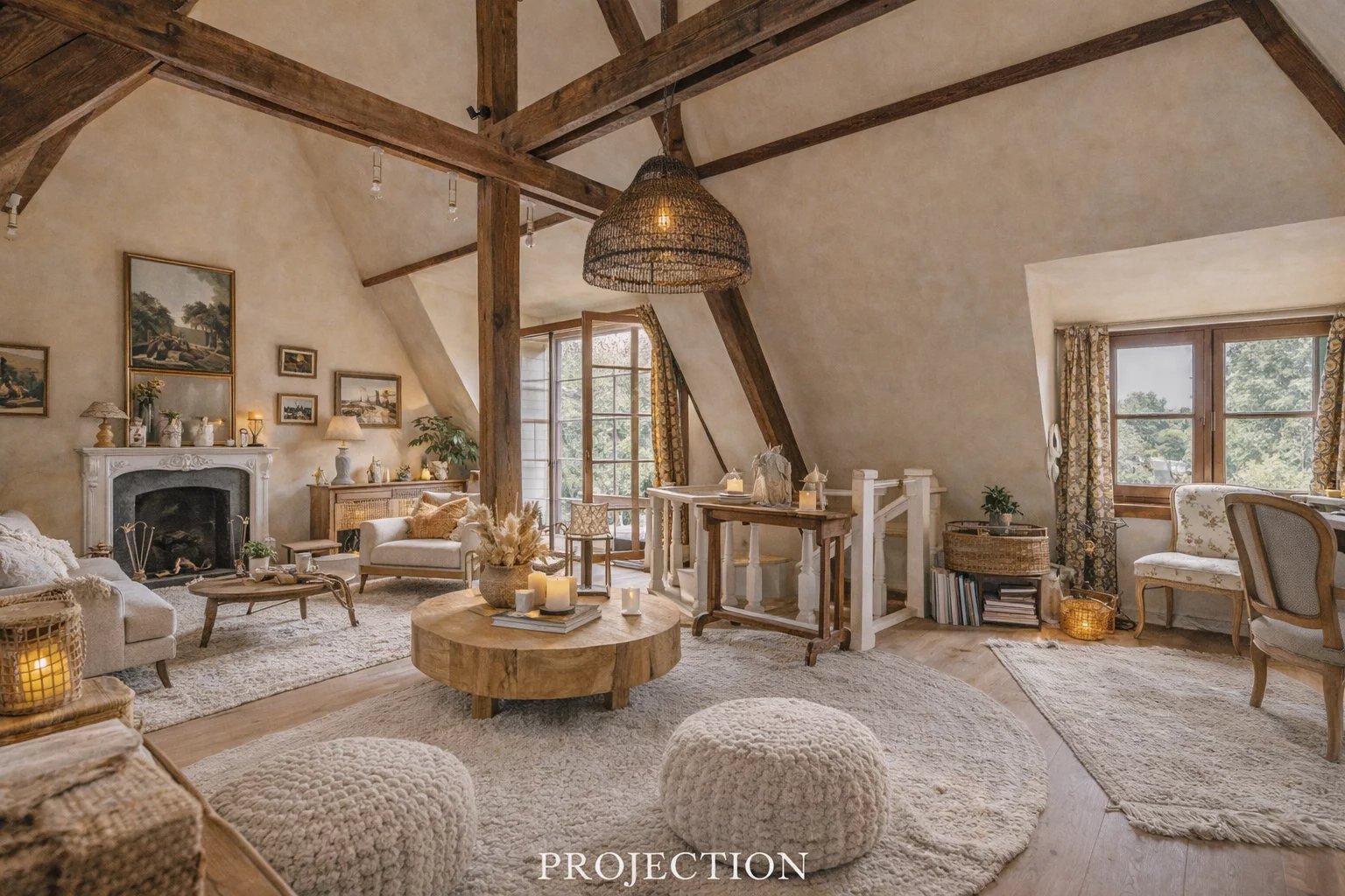 L'appartamento è composto da un pianerottolo, una cucina abitabile, due camere da letto (17 e 21 m2), un bagno con doccia, un bagno di servizio e un ufficio (9 m2). Al piano superiore (ultimo piano) si trova un ampio soggiorno con soffitto a cattedrale (45 m2) con camino e accesso a una terrazza a un piano, esposta a ovest (20 m2).
