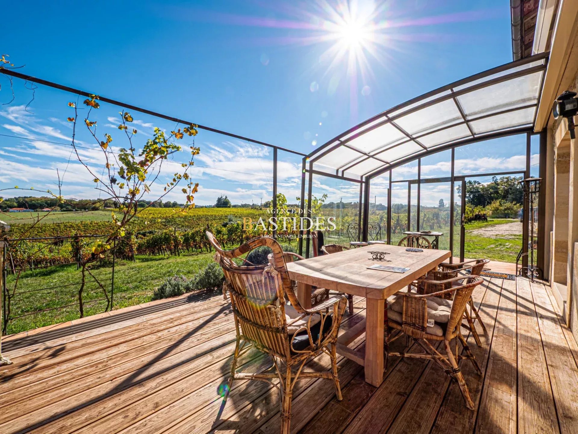 A 20 minutes de Bordeaux, sur les hauteurs d'une commune très recherchée de l'axe Bordeaux-Libourne et dans un environnement des plus preservé, Cette authentique propriété NORD/SUD en pierre bénéficie d'une vue dégagée à 360° ! Avec ses 6 hectares de vignes entourant la propriété, voilà un joyau du XVème siècle très rare sur le marché. Discrète comme ce lieu de surveillance qu'elle représentait autrefois, la maison est aujourd'hui fonctionnelle et bien distribuée. Une large terrasse couverte plein sud surveille le vignoble. Le séjour, intimiste avec cheminée et poutres d'origine et une bibliothèque. Côté nuit, pas moins de 5 chambres, toutes avec salles d'eau/WC. L'étage propose un grand espace avec suite parentale et plusieures pièces ainsi qu'un accès exterieur à aménager pour mieux profiter encore de la vue! Le chai indépendant d'environ 300m² est un outil clé en main, fonctionnel, avec ses cuves en inox prêtes à vinifier mais l'espace est assez grand et authentique pour imaginer tout type de projet. Pour amoureux de la pierre, de la nature et du vin, ce domaine d'agrément pourrait facilement allier chambres d'hôtes, expérience oenotouristique, et propriété familiale.