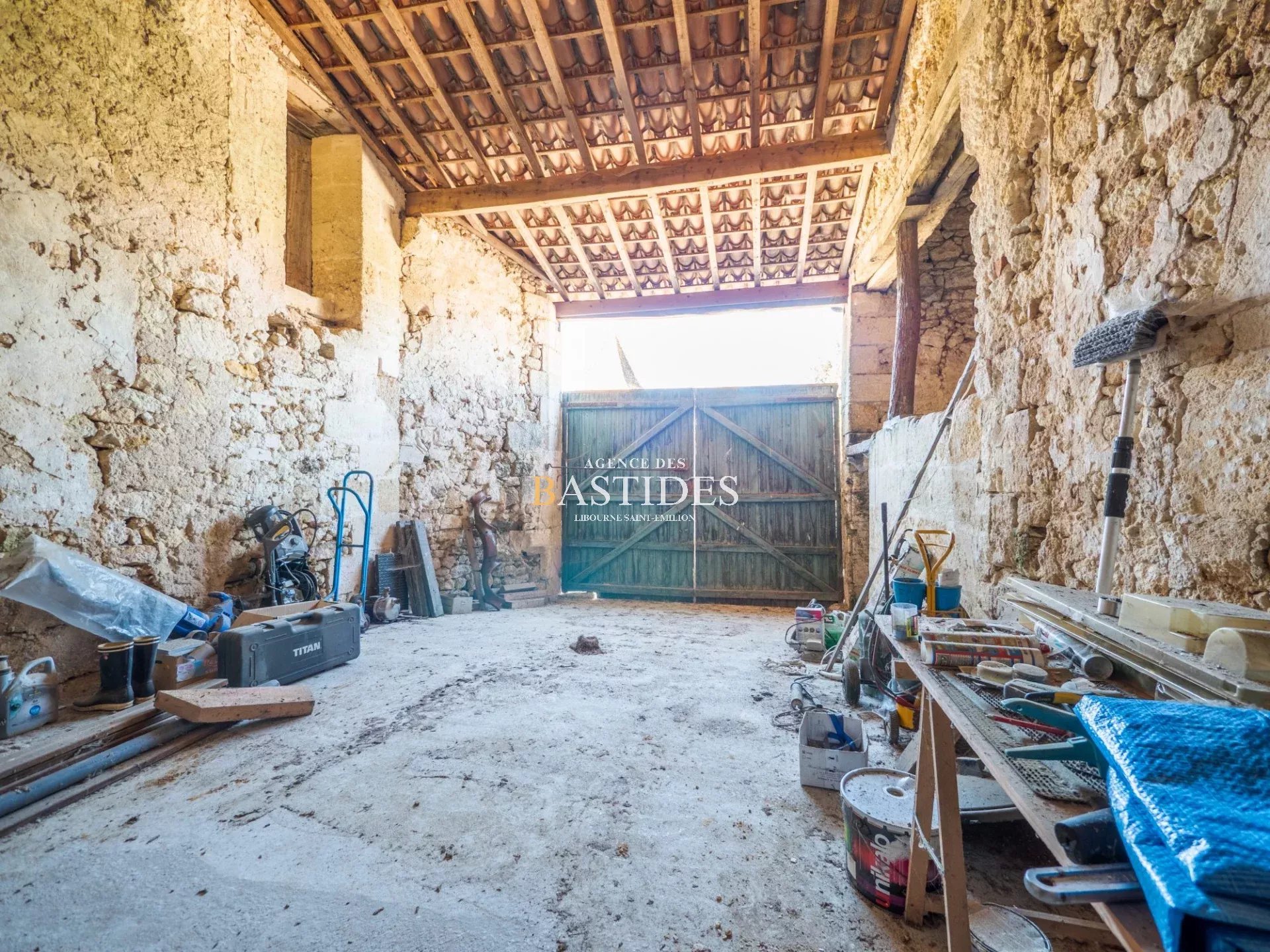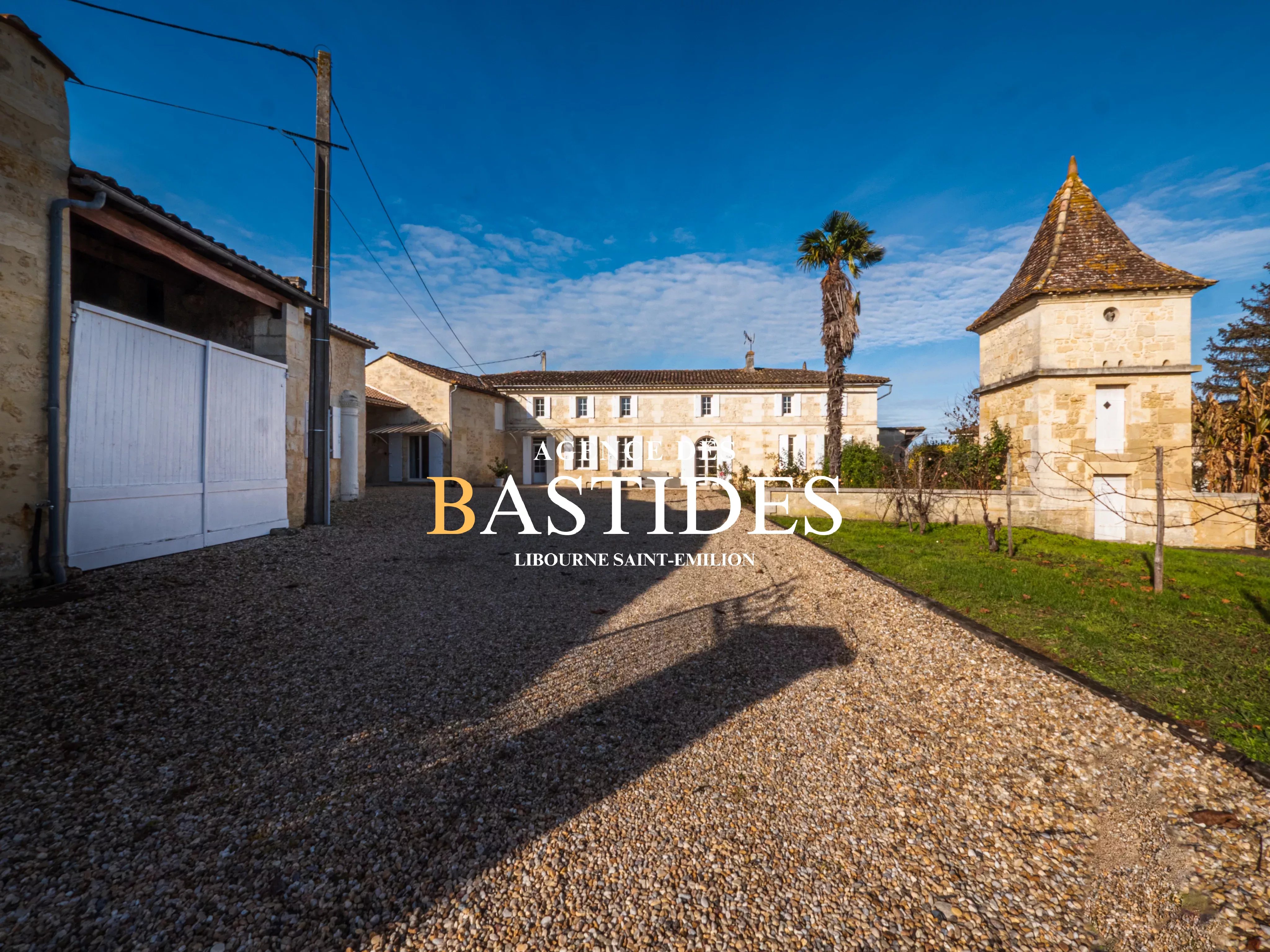 Autrefois propriété viticole, aujourd'hui demeure en pierre aux façades remarquables, l'arrivée dévoile nettement un ensemble de bâtiments en pierre de taille très bien conservé, derrière son grand portail en fer forgé et son authentique pigeonnier. La partie habitation plein sud propose un espace séjour, bureau et cuisine d'une part, et un grand espace chambre avec dressing, salle d'eau/WC et son propre accès extérieur d'autre part. L'étage propose 4 chambres aux volumes généreux. Des dépendances, ateliers et ancien chai pour environ 300m² donneront la possibilité à bien des projets. Environnement résidentiel et paisible, sur l'axe Bordeaux Libourne