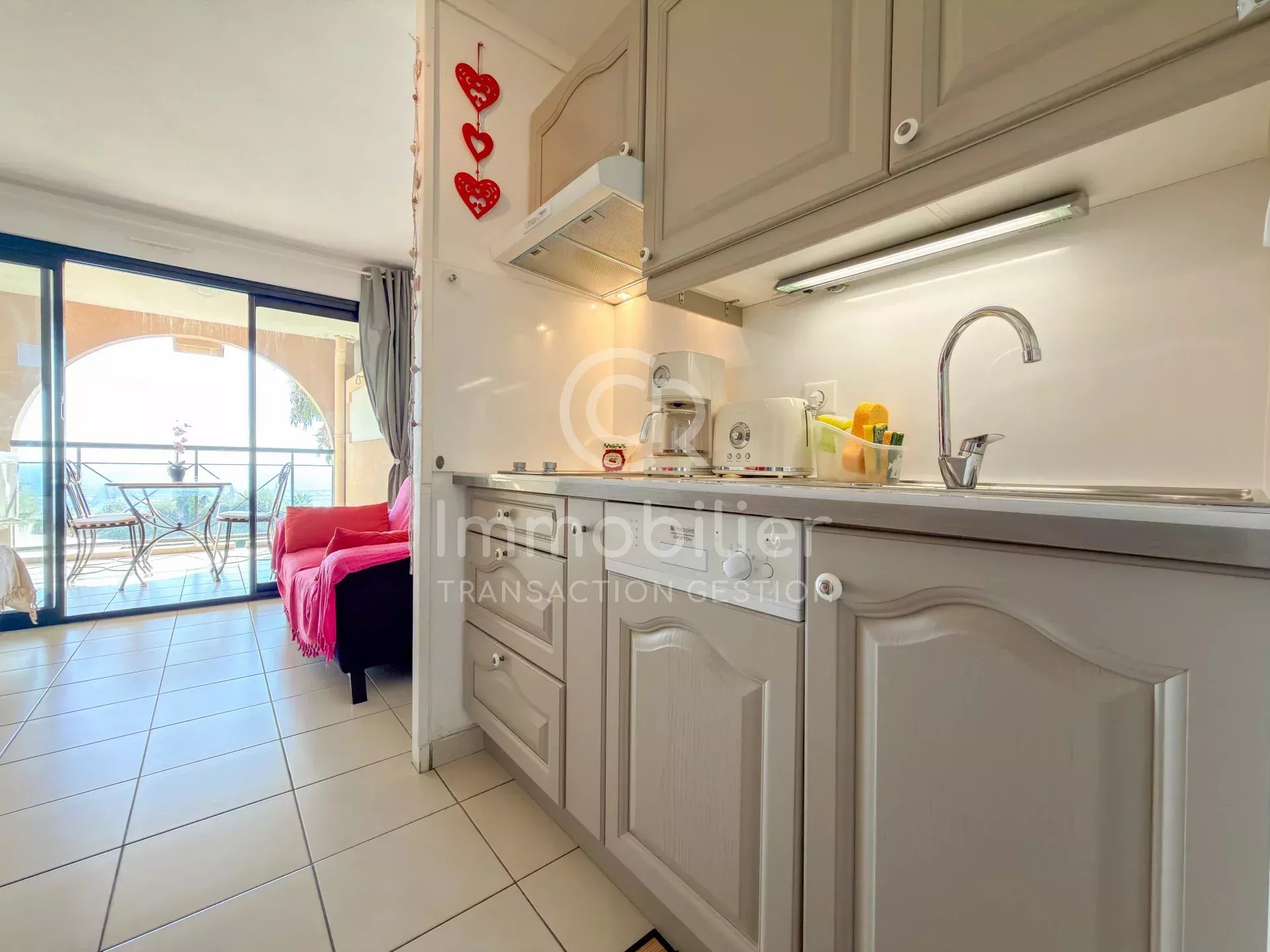 Exclusivité Cannes-La-Bocca centre-ville, résidence La Palme d'Azur. À deux pas des plages et de toutes les commodités venez découvrir la belle vue mer que vous offre cet appartement 2 pièces de 26,43m² Carrez en étage élevé! Il se compose d'une entrée, un salon/séjour avec cuisine, un balcon (8,04m²), une chambre, une salle de bains avec toilettes. L'appartement est vendu meublé et équipé (plaque, lave-vaisselle, machine à laver). Deux piscines dans la résidence, restaurant, espaces verts, ascenseurs. Charges environ 150€ mensuelles incluant l'eau chaude et l'eau froide. Taxe foncière: 875€ Idéal pied à terre ou locatif saisonnier!