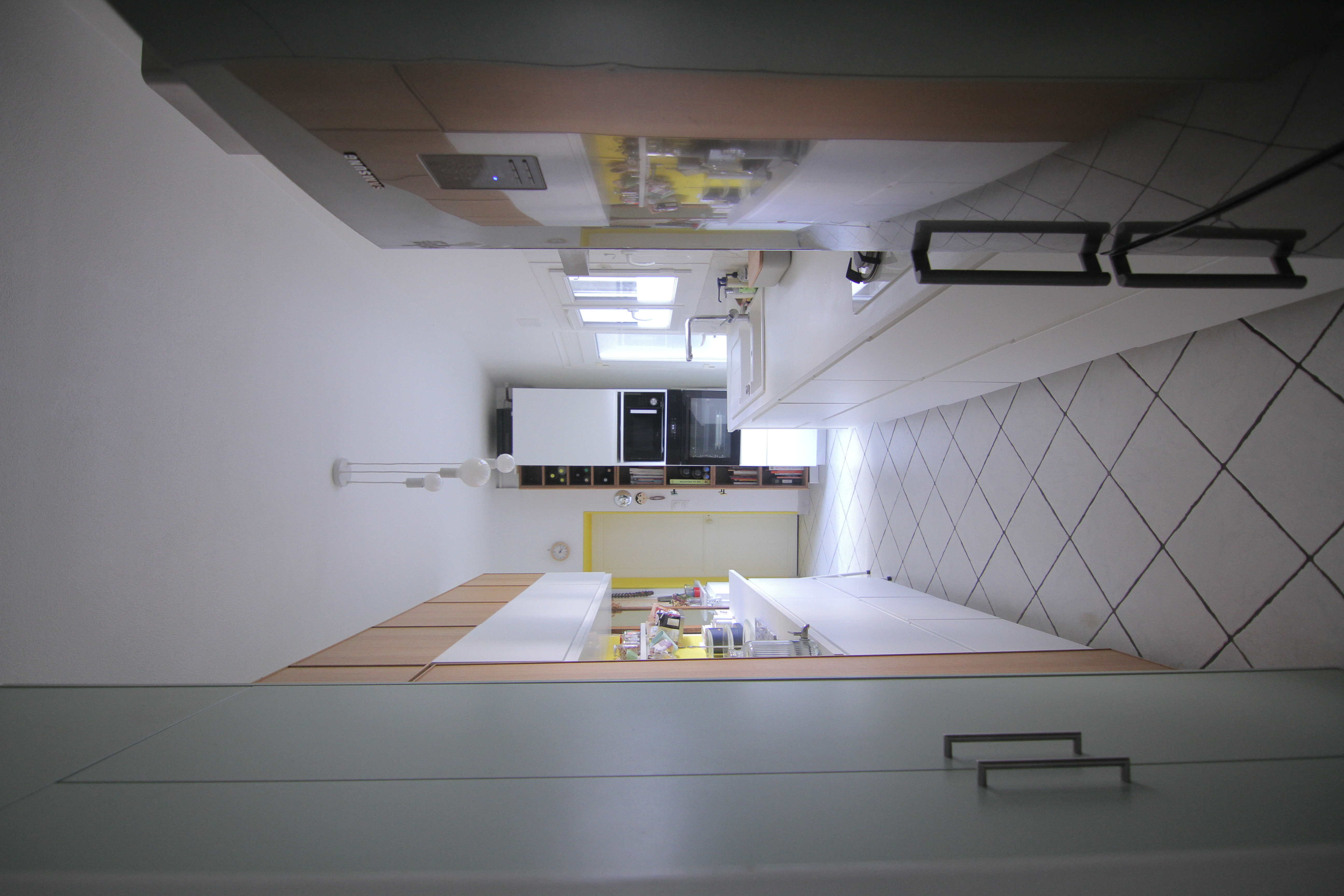 Cuisine équipée récente aux rangements généreux et bien pensés, donnant accès sur l’extérieur.