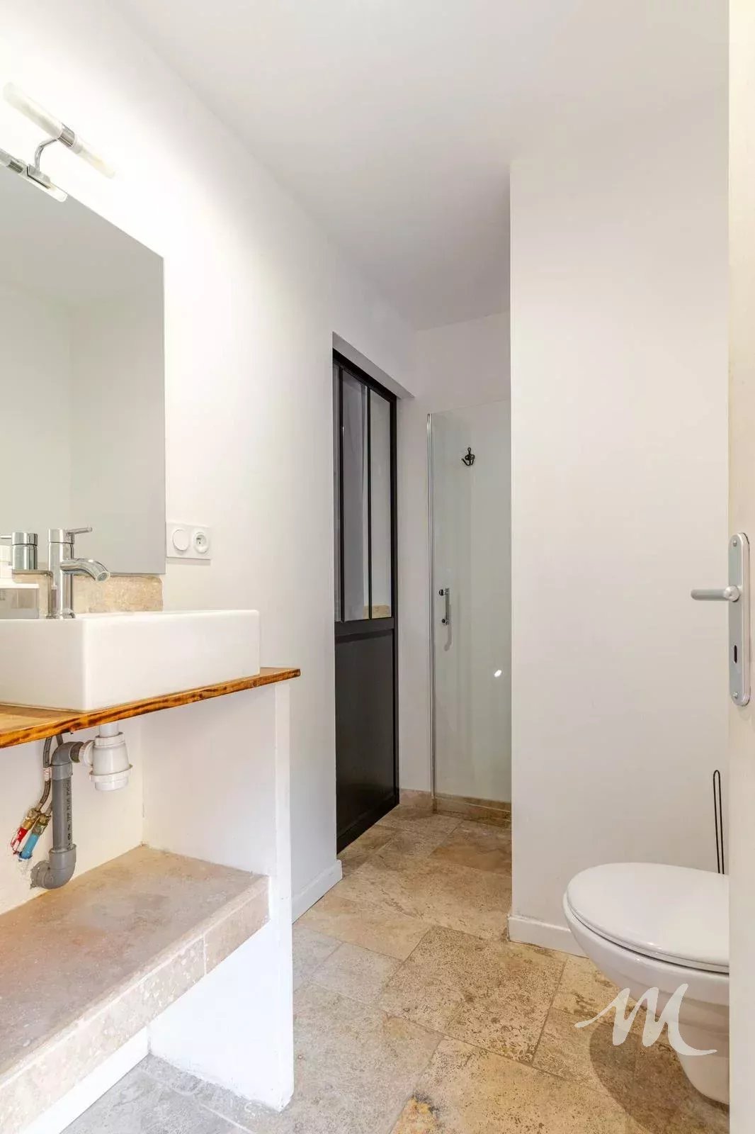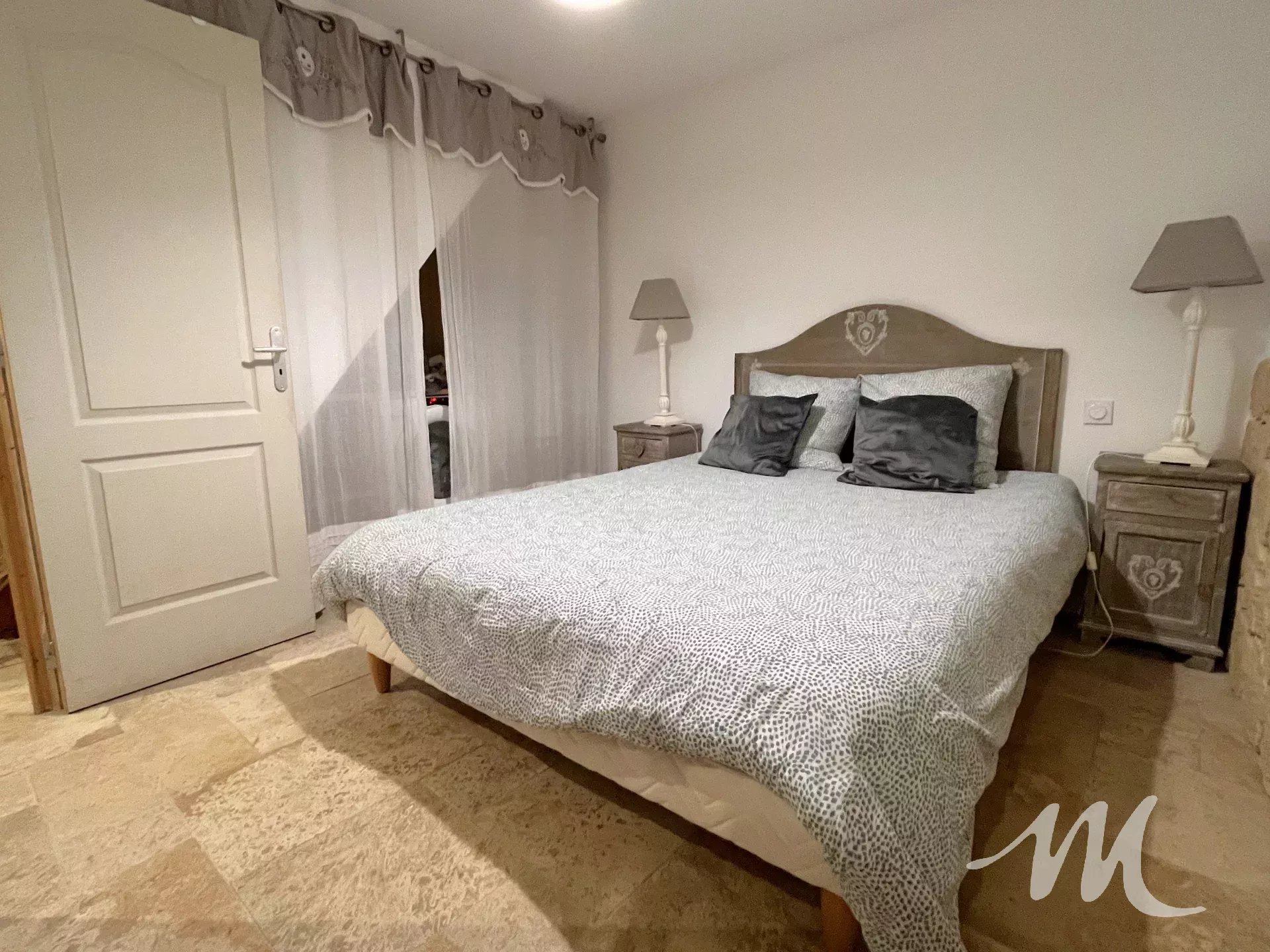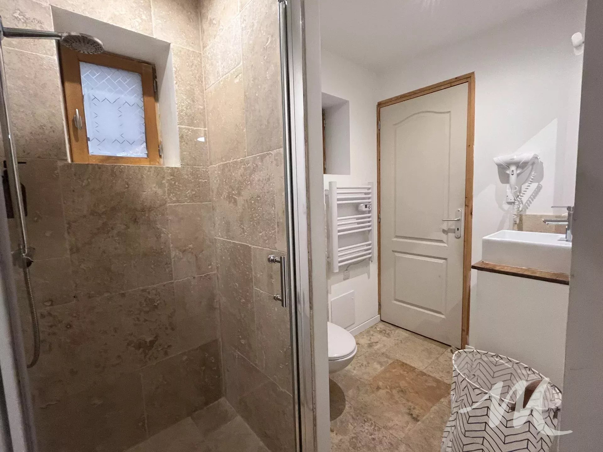 Au rez-de-chaussée, d’une entrée desservant une suite parentale avec chambre ouvrant sur une salle d’eau en travertin avec WC.