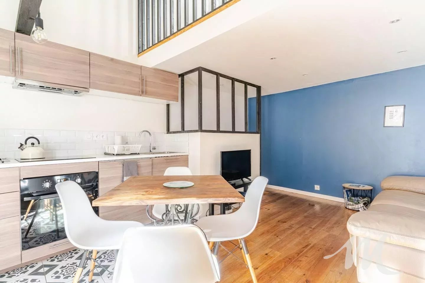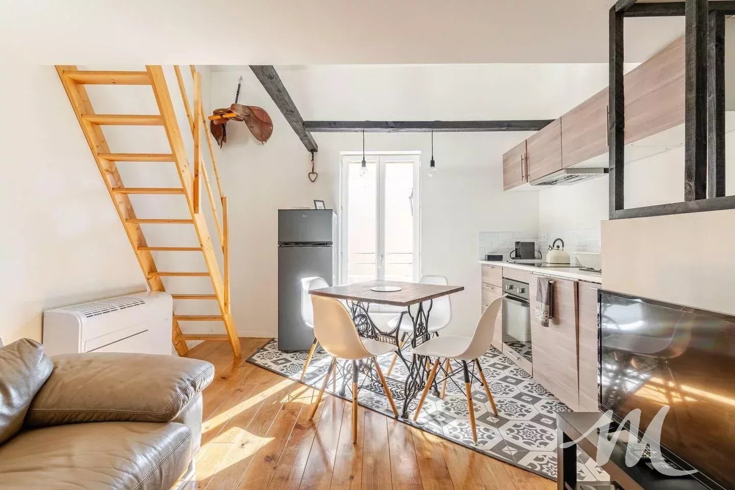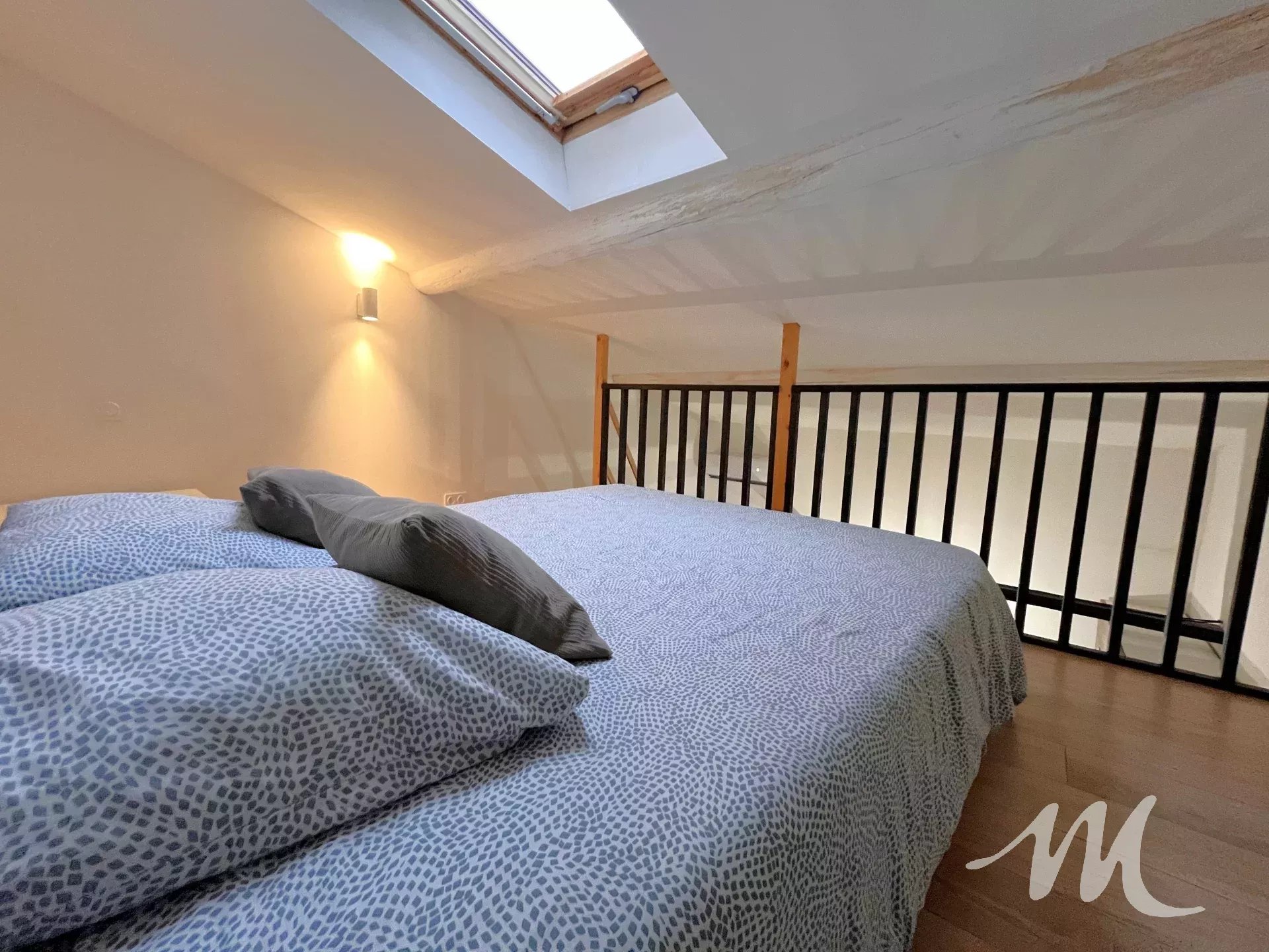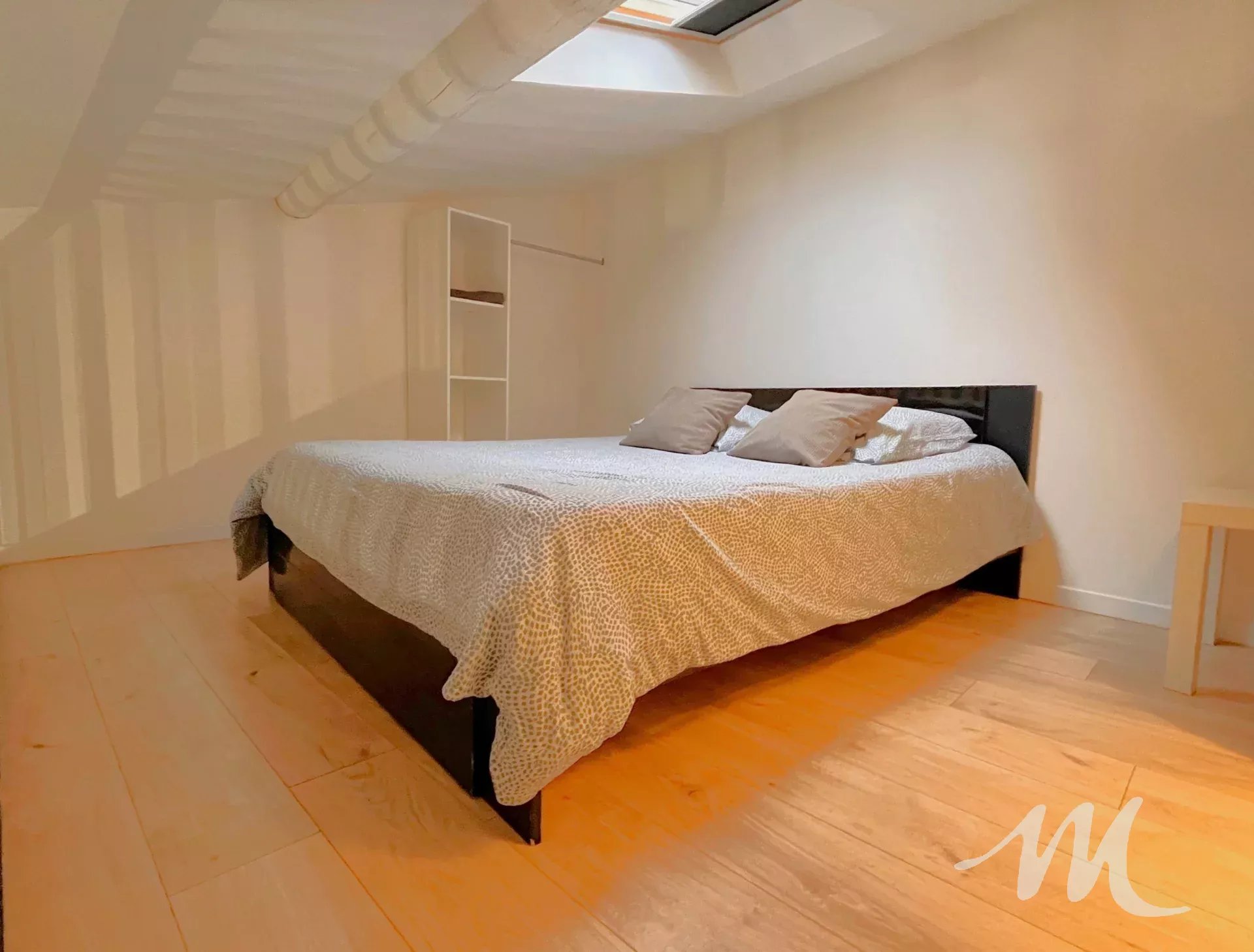À l’étage, une agréable pièce de vie avec cuisine équipée, ainsi qu’une chambre mansardée.