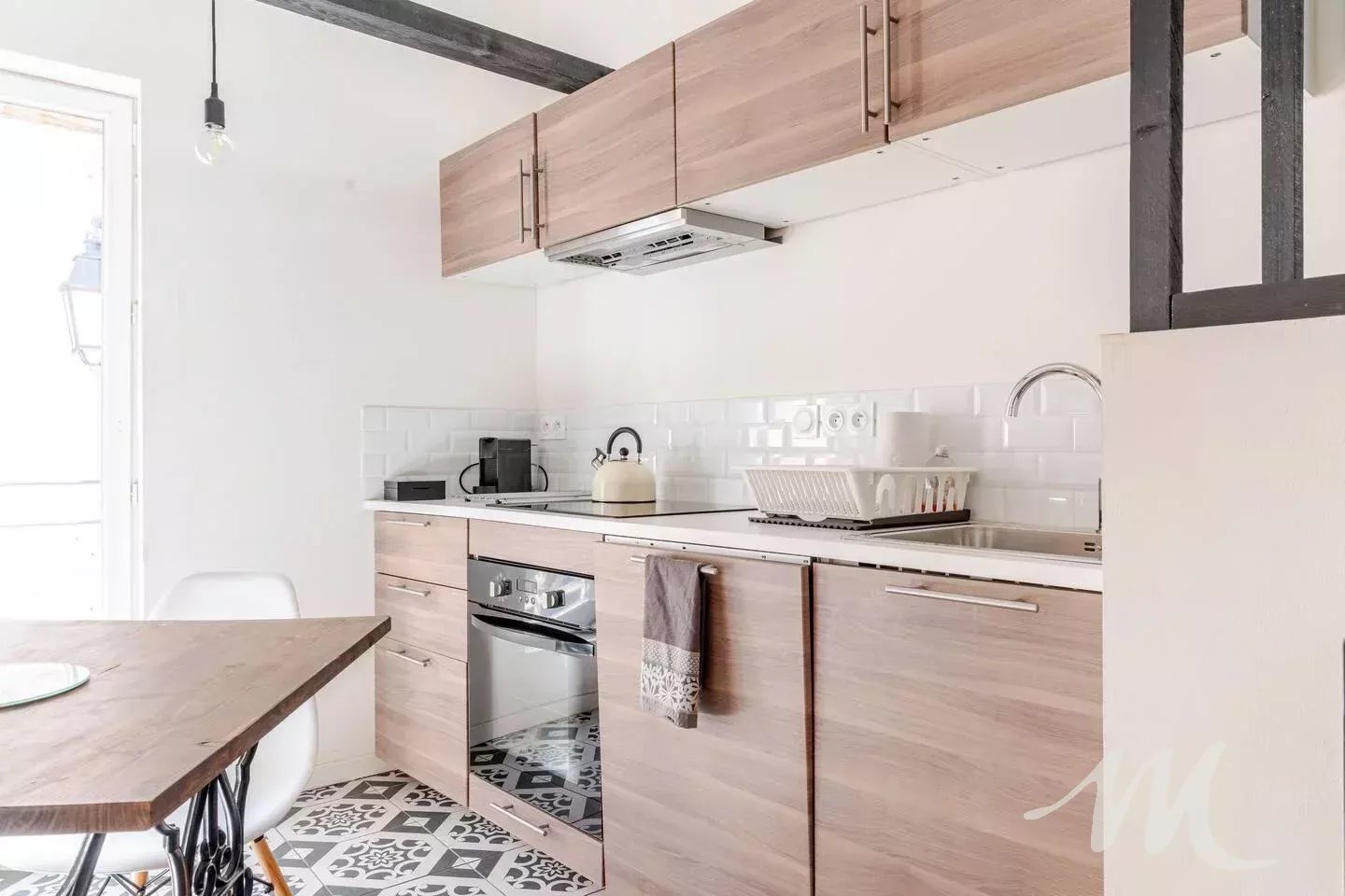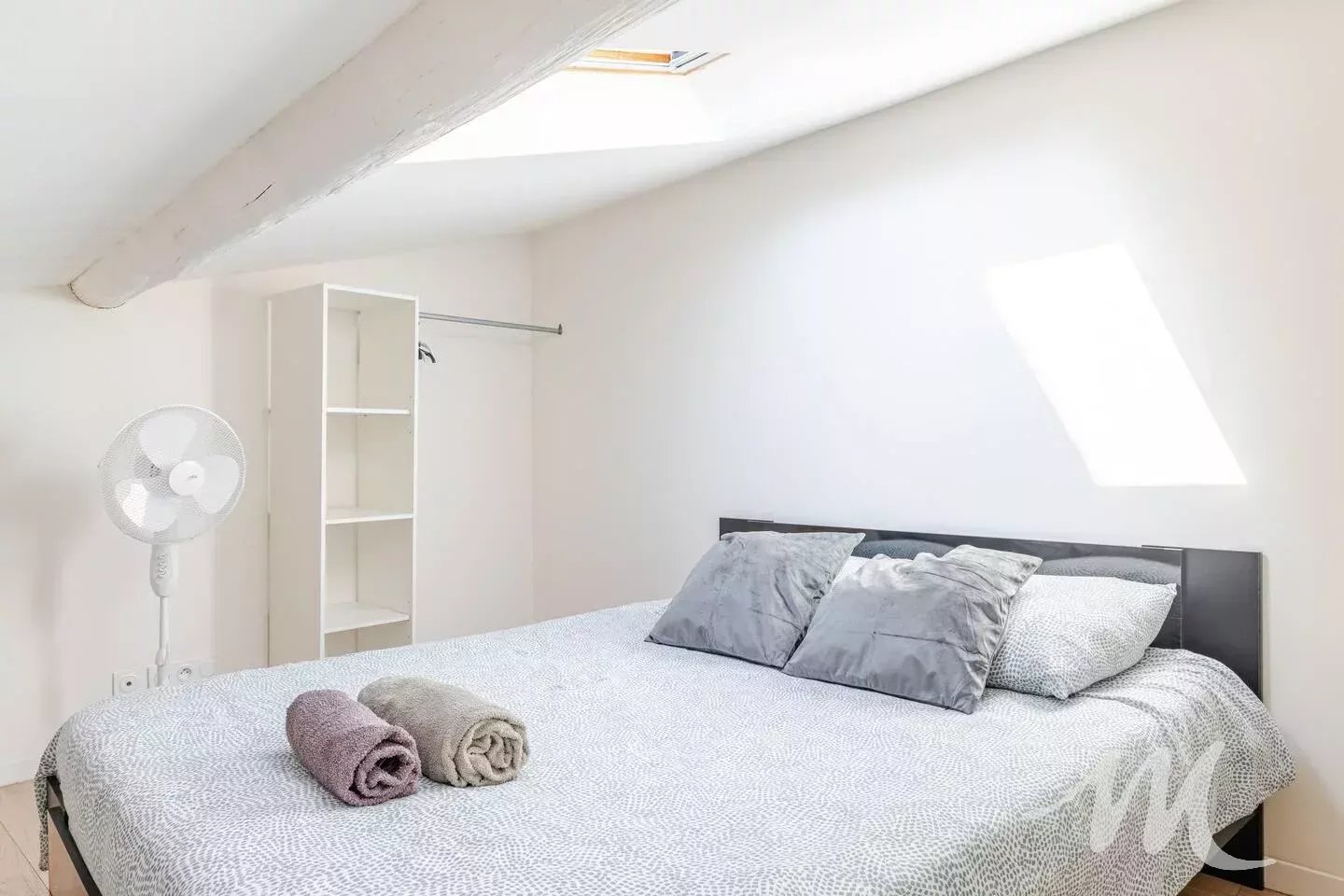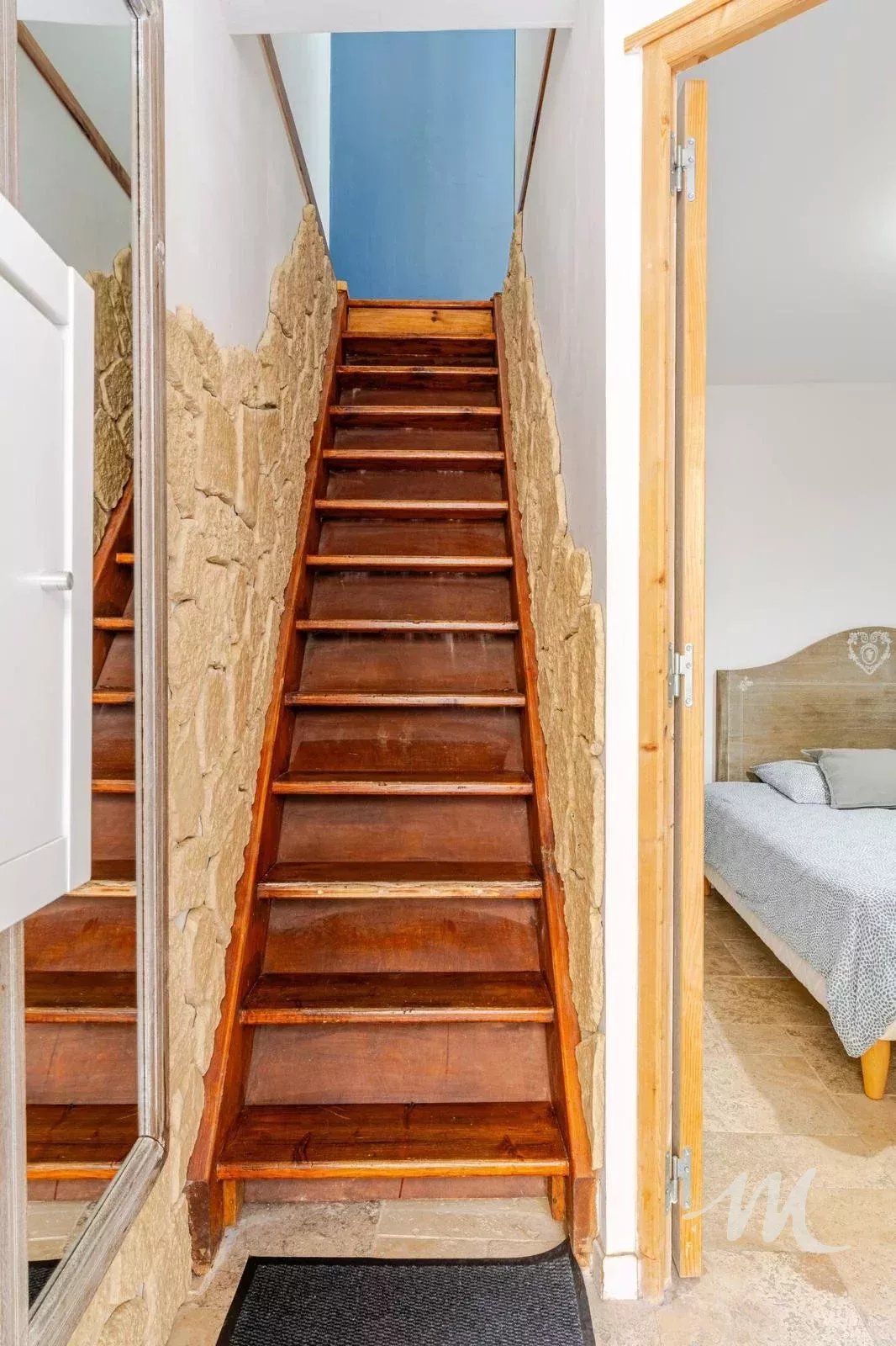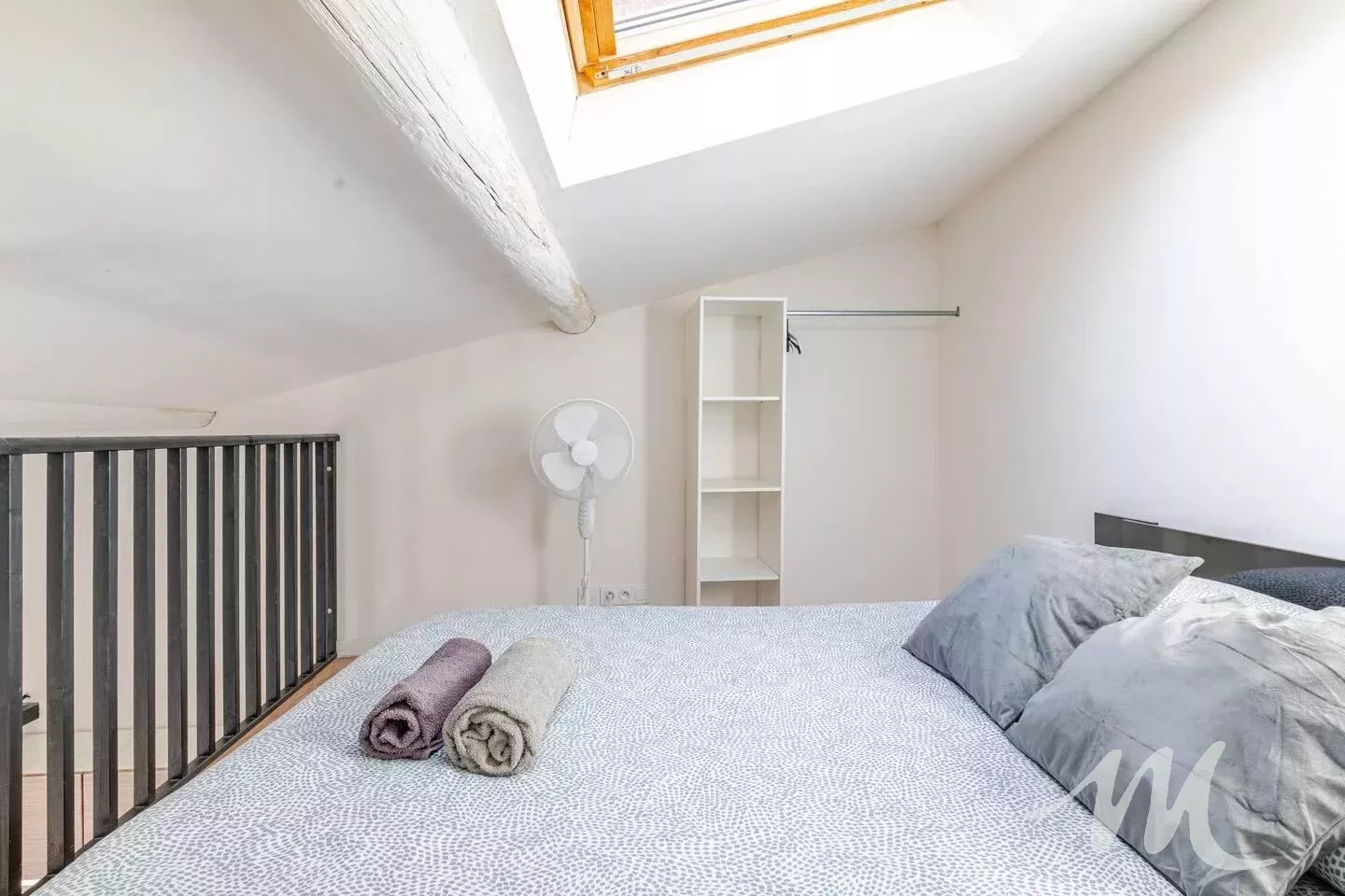 À l’étage, une agréable pièce de vie avec cuisine équipée, ainsi qu’une chambre mansardée.