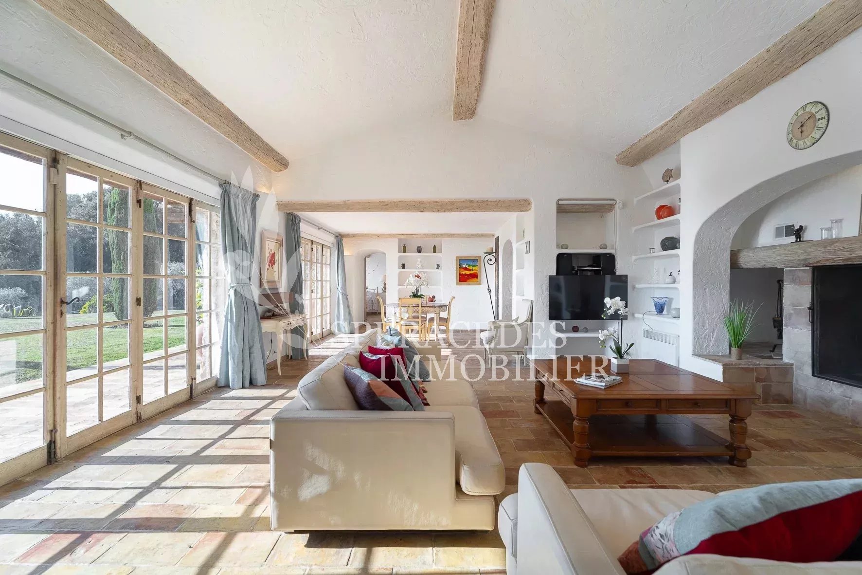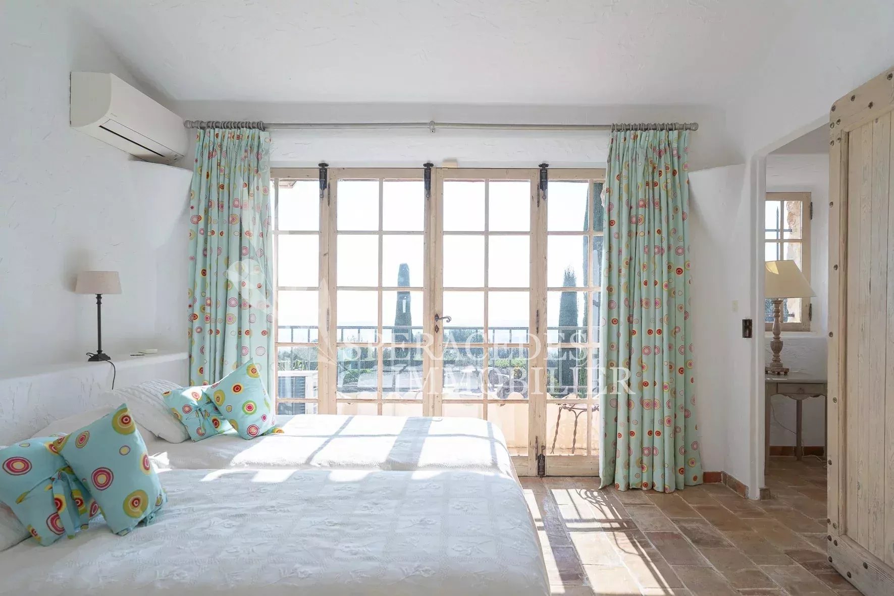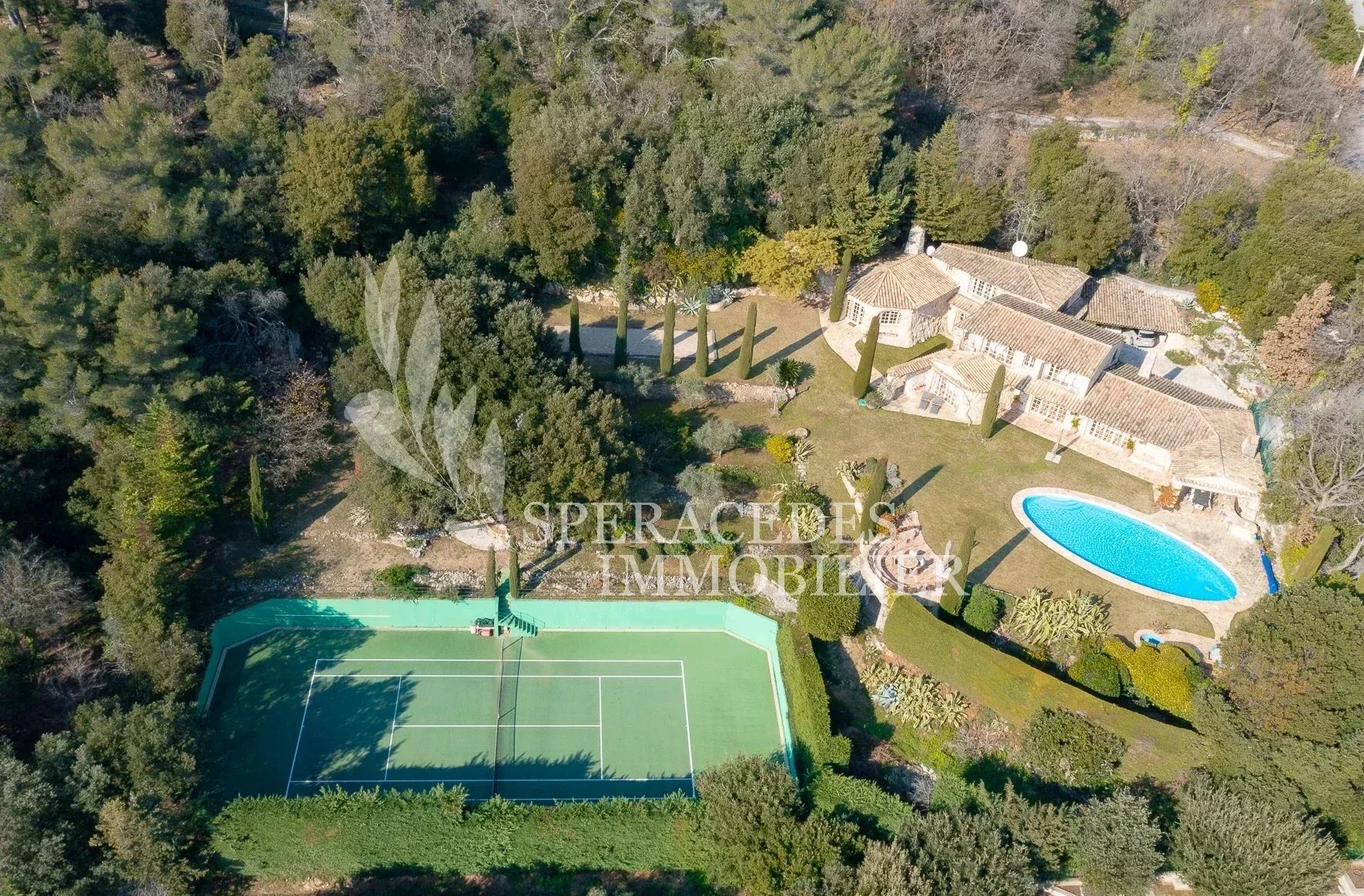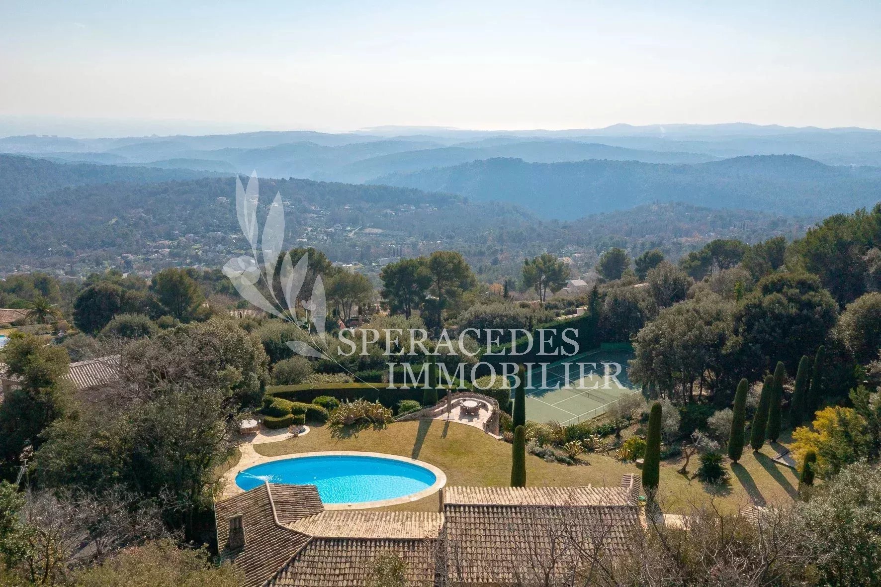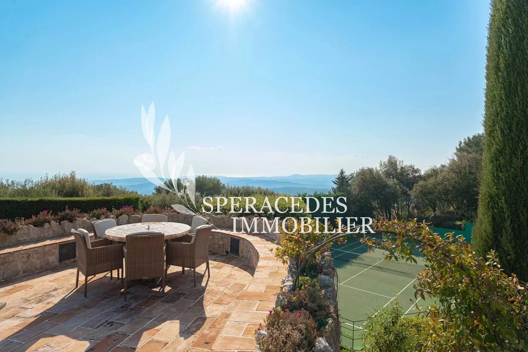À quelques pas du village de Tourrettes-sur-Loup, dans un environnement d’un calme absolu, cette remarquable propriété signée Robert Dallas bénéficie d’une vue panoramique spectaculaire sur la vallée et la mer. Les espaces de réception, ouverts et baignés de lumière, comprennent salon, salle à manger, cuisine, bureau et salon TV. La propriété offre cinq chambres en suite ainsi qu’un appartement d’amis indépendant. Les extérieurs invitent à la détente avec une salle à manger d’été couverte, une piscine chauffée et un court de tennis, le tout au cœur d’un magnifique jardin provençal composé de pelouses plates et de terrasses.