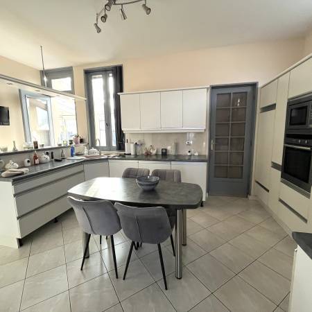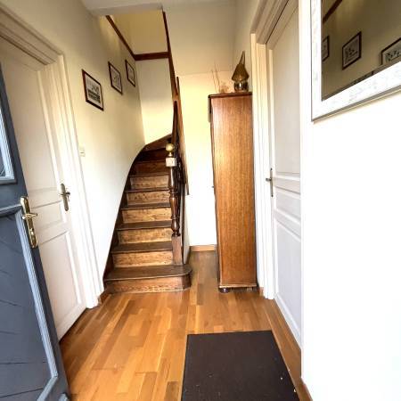 Au Rez de chaussée : un hall d'entrée desservant une salle à manger avec son parquet bois d'origine, un salon ouvert sur une cuisine aménagée équipée, donnant sur une belle véranda bien exposée de 20 m2, une salle de douche, un wc.