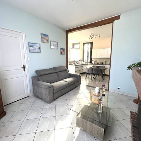 Charmante Maison entièrement rénovée à 15 mns de la Baie de Somme et des plages de Mers les Bains située à Fressenneville dans un bourg tous commerces comprenant :