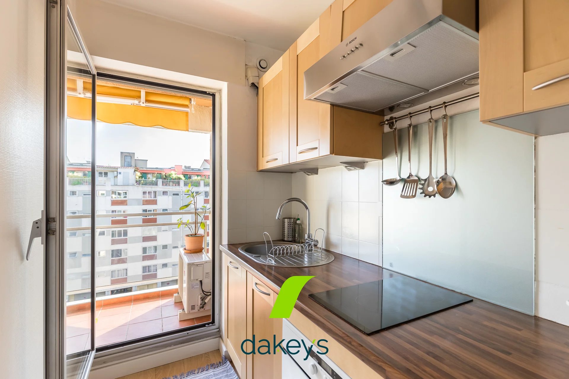Au 4ème étage sur 7 avec ascenseur orienté Est cet appartement est inondé de lumière et il offre une entrée qui distribue un spacieux séjour avec sa terrasse de 12m2 et sa vue sur la ville et sa cuisine indépendante entièrement aménagée et équipée ouvrant elle aussi sur la terrasse. La partie nuit propose une grande chambre et placards de rangement en excellent état avec accès terrasse . Il possède une jolie salle de bains et des toilettes indépendants ainsi qu'un espace de rangements.