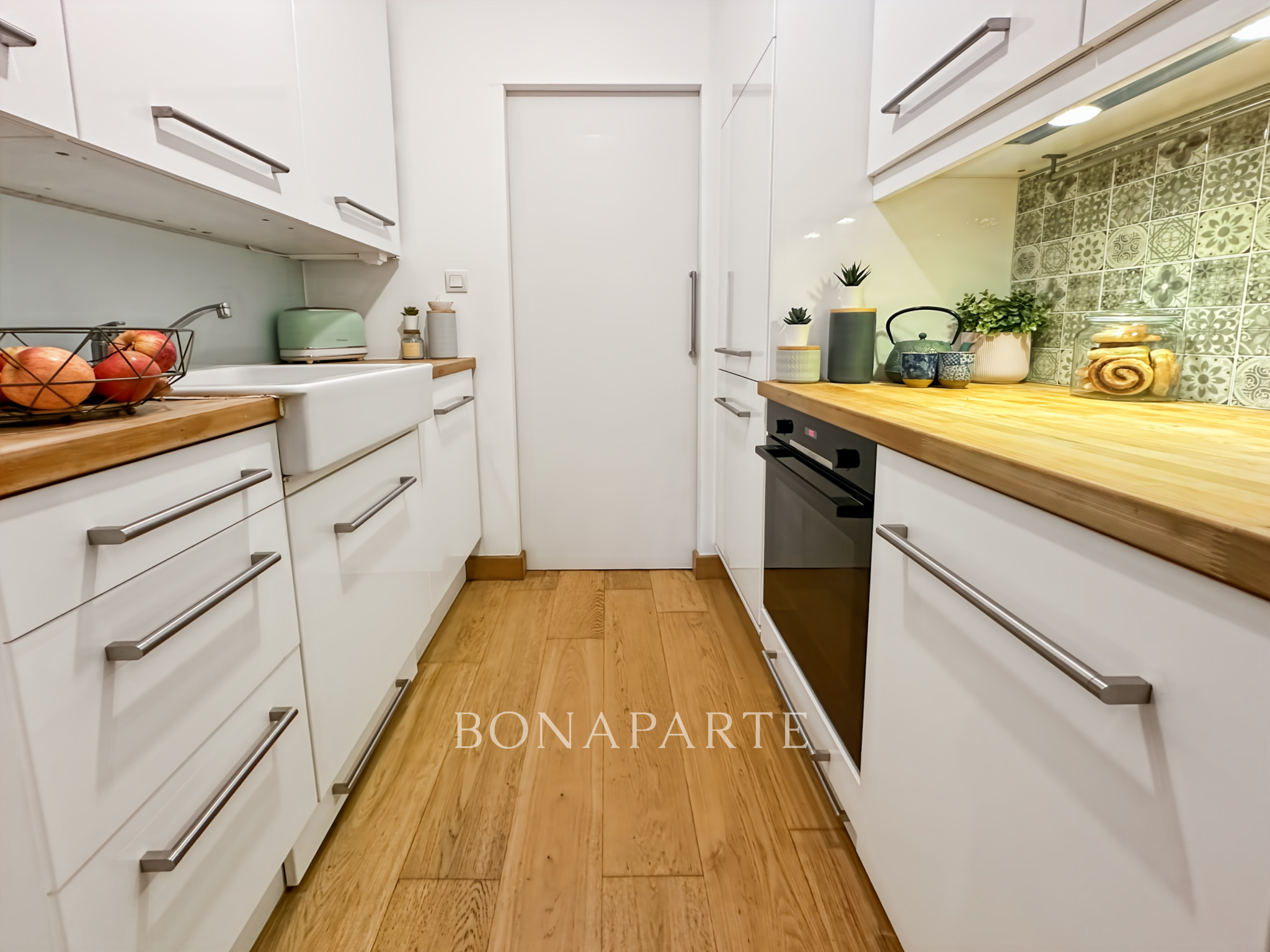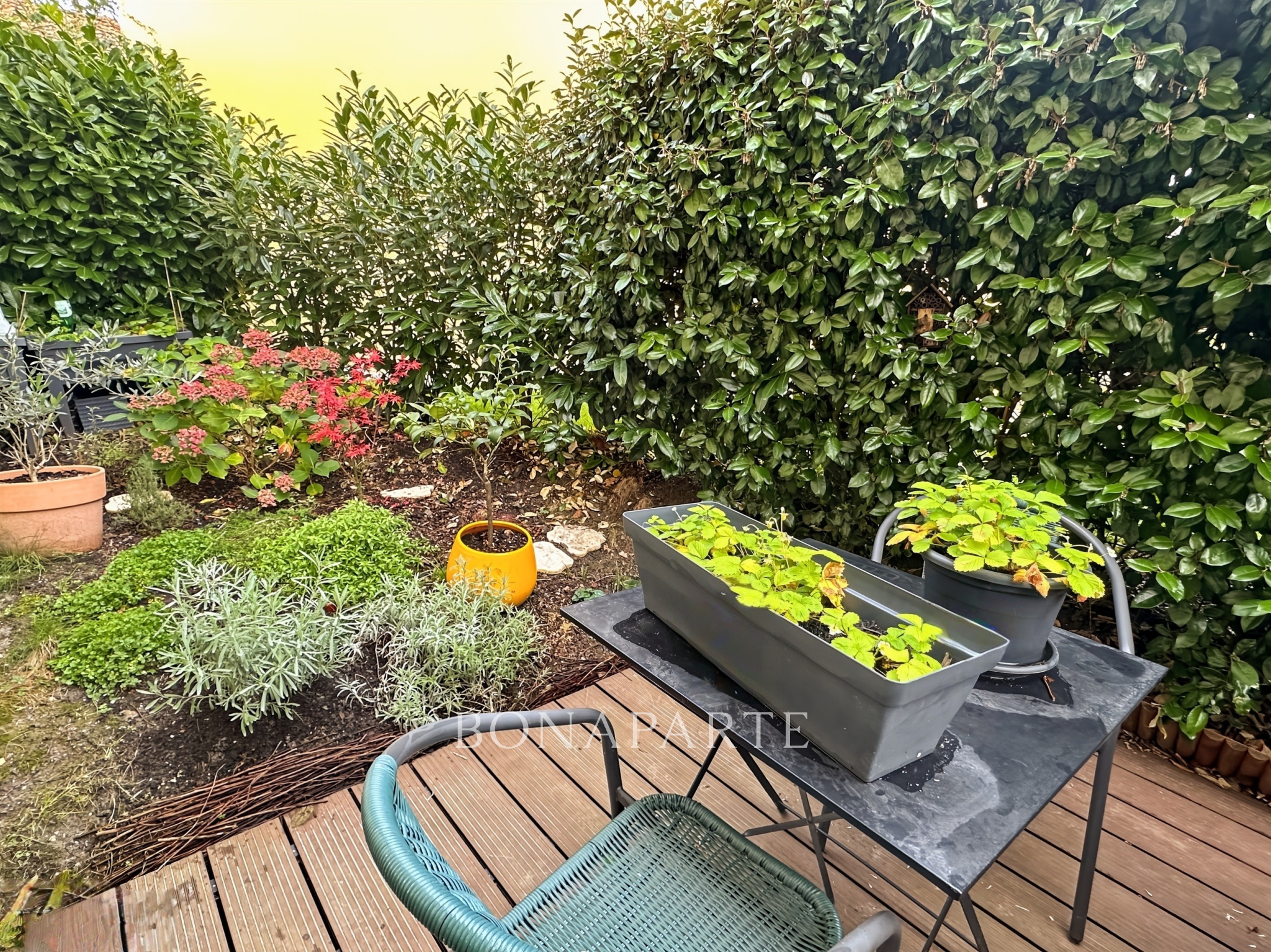 La pièce de vie lumineuse s'ouvre sur une charmante terrasse privative et un jardinet paysagé. De l'autre côté des lieux, la cuisine ouverte aux couleurs douces est complétée par un grand cellier aménagé.