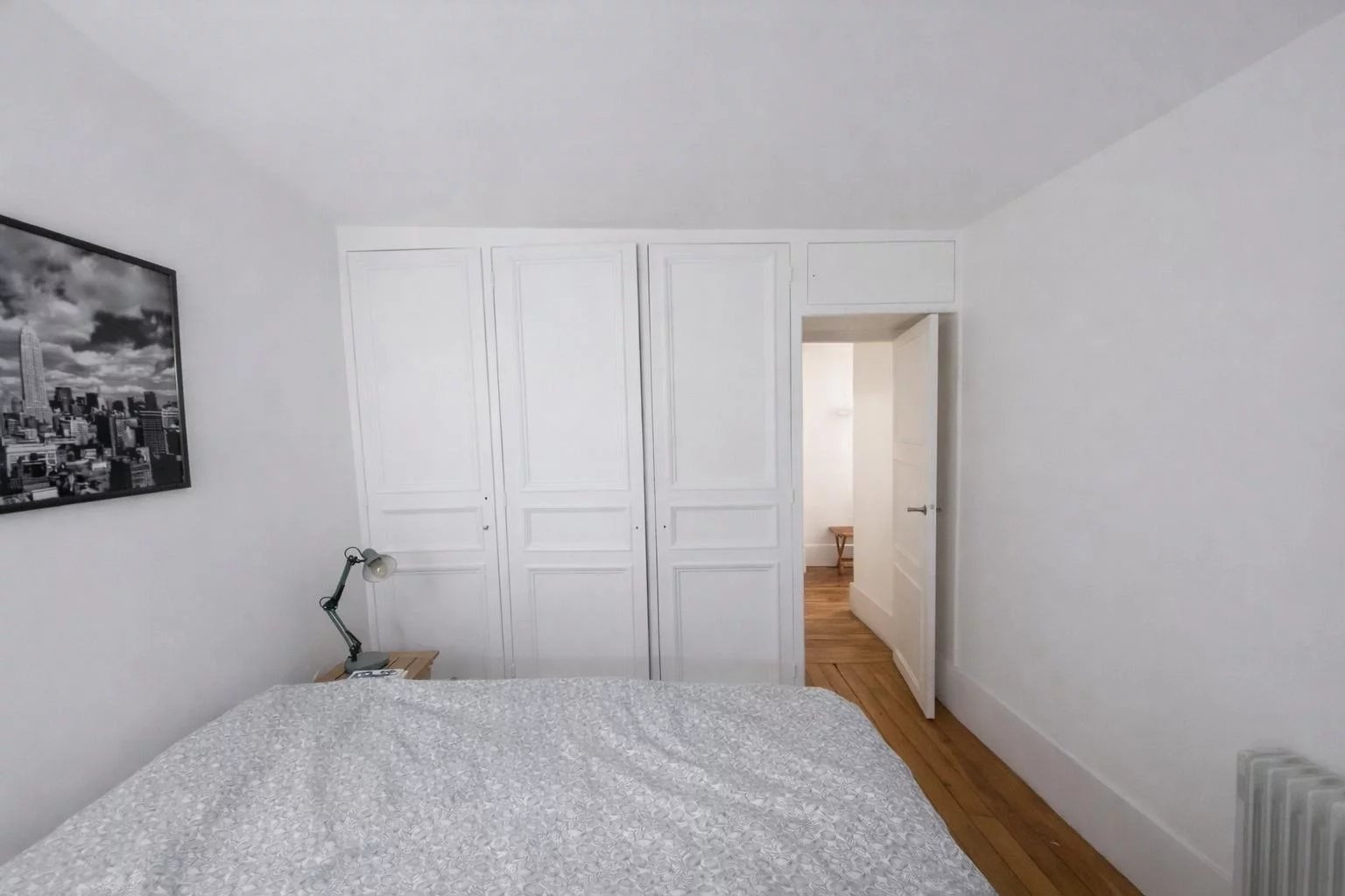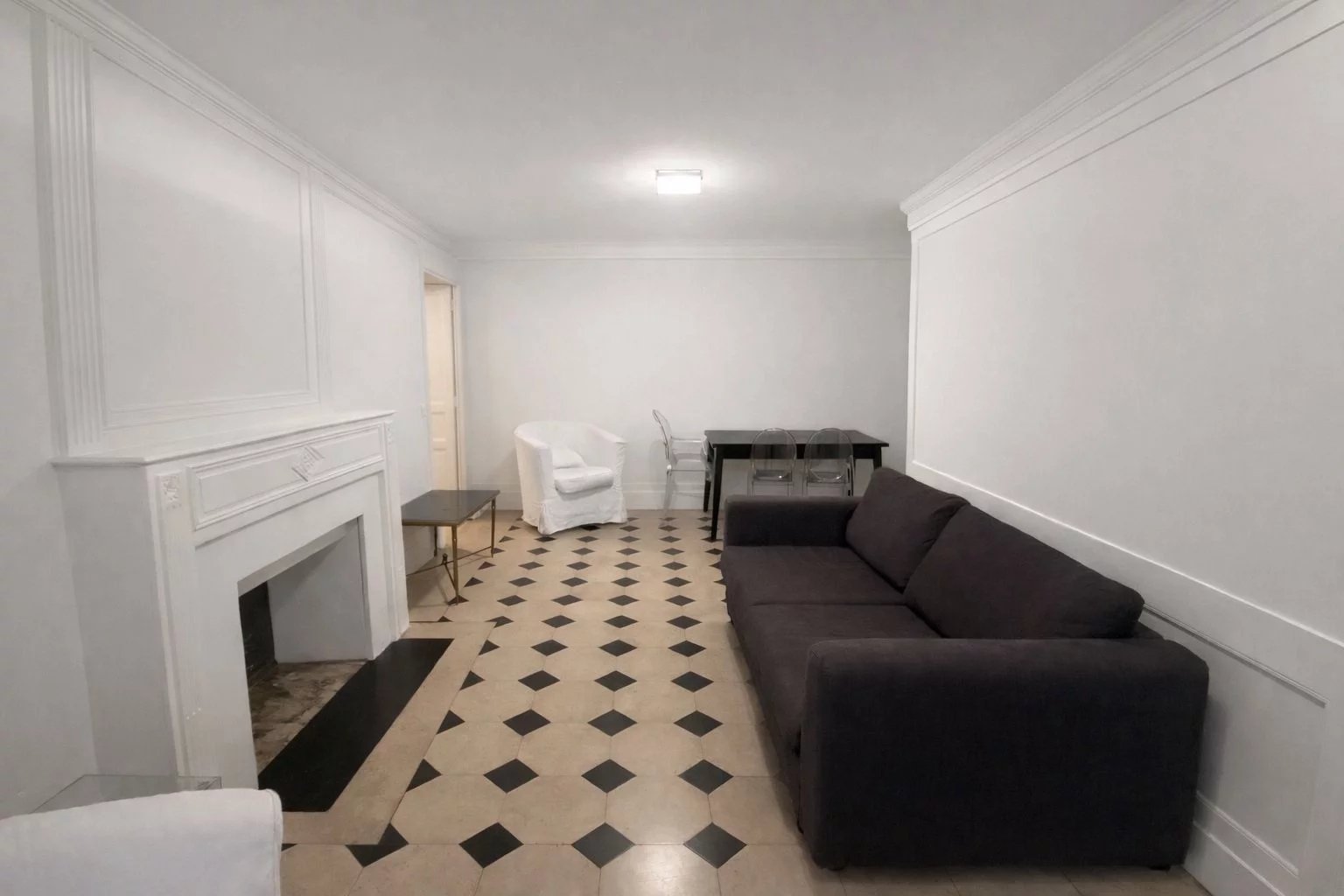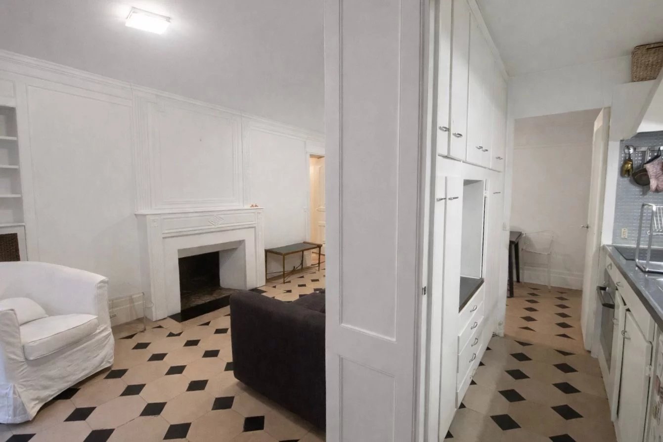 L’appartement se compose d’une entrée ouvrant sur un séjour chaleureux, sublimé par une cheminée, ainsi que d’une cuisine pour la partie jour.