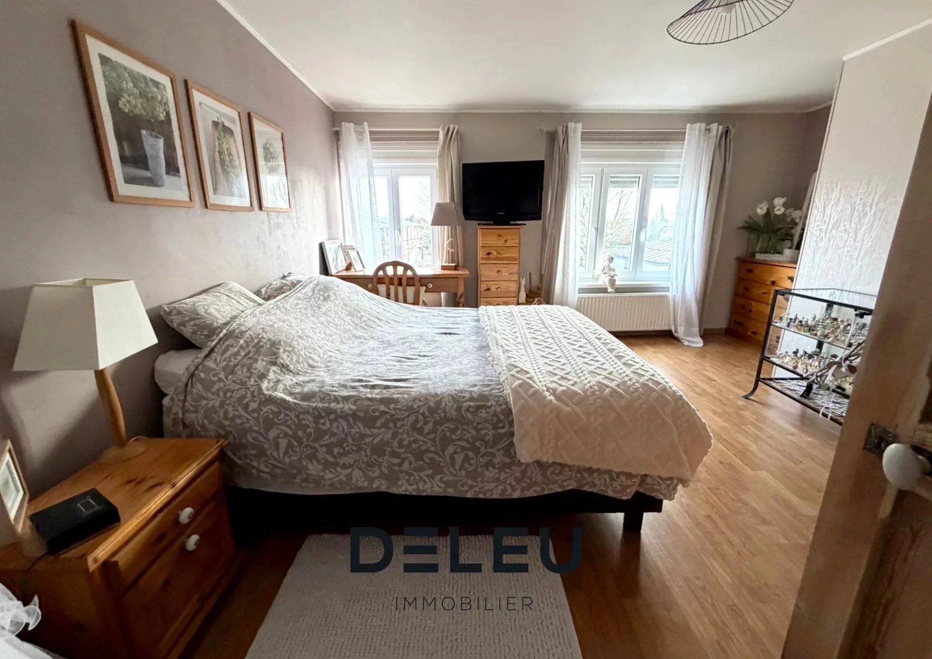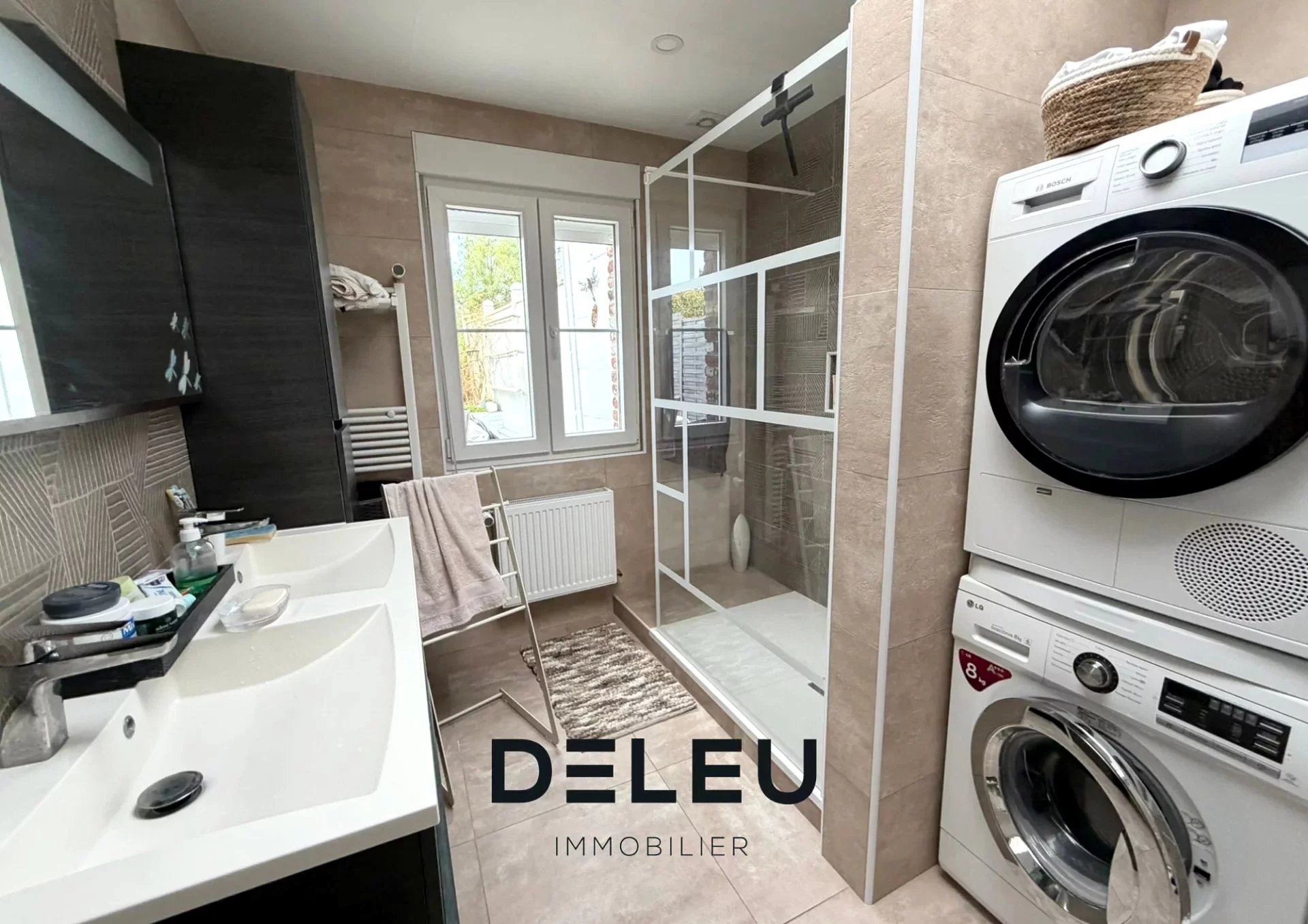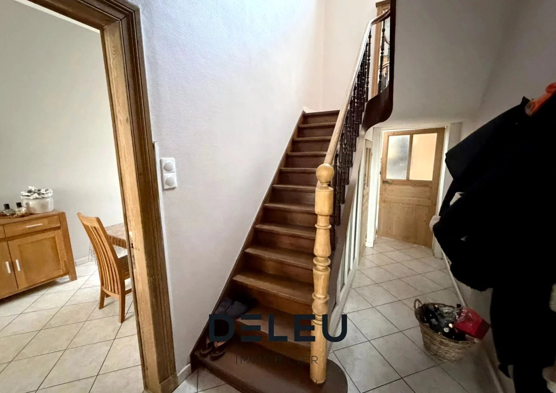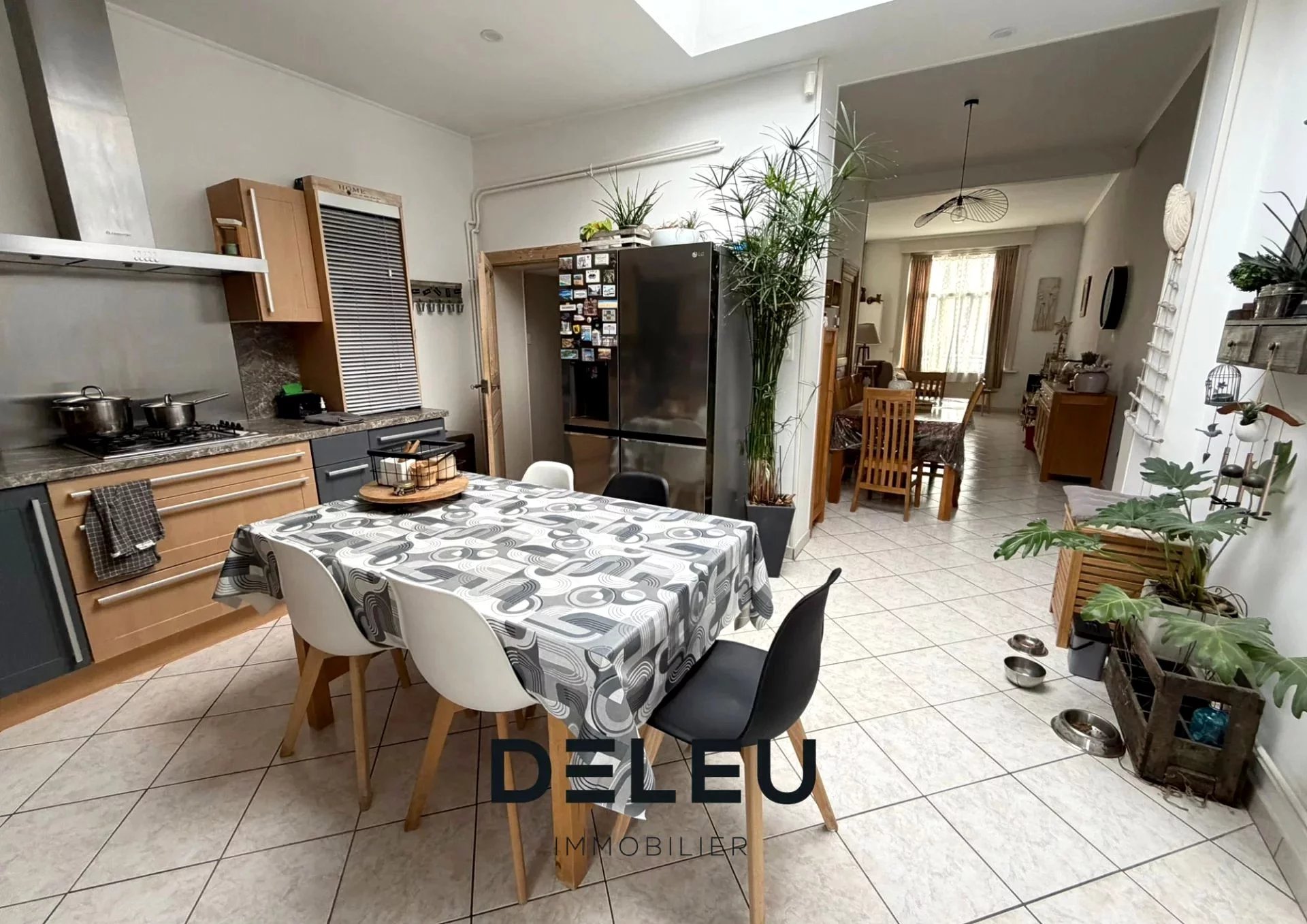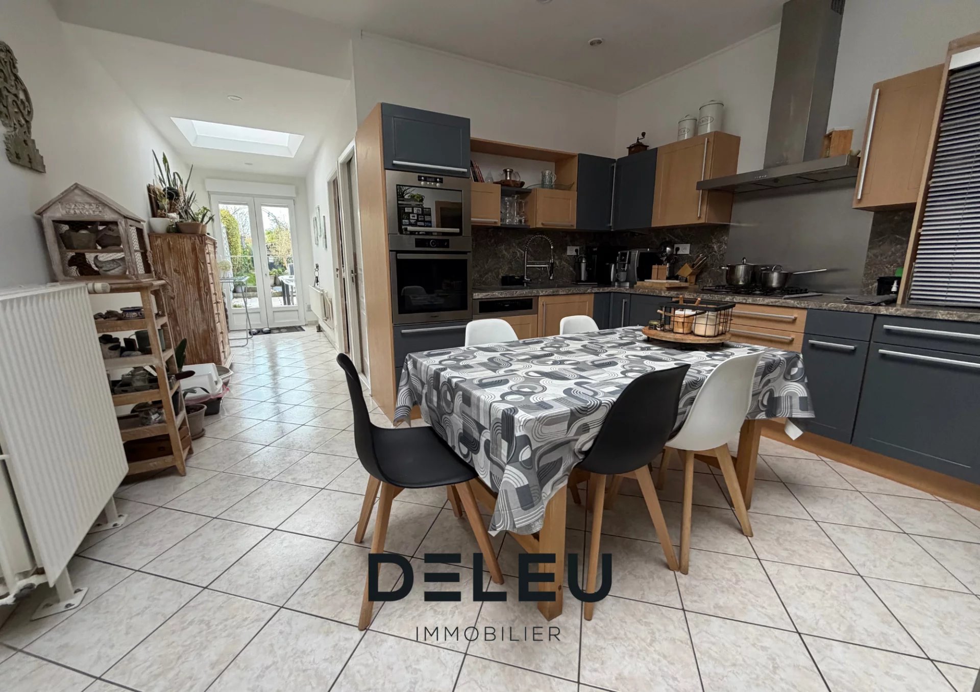 MAISON 150 M² AVEC 4 CHAMBRES JARDIN EN CENTRE-VILLE (mandat n°562). Votre agence Deleu Immobilier, vous propose cette belle maison située en centre-ville de Wambrechies. Rez-de-chaussée : hall, pièce à vivre d'environ 50m² comprenant le salon, salle à manger et une grande cuisine équipée et dinatoire. Ensuite une salle de bains avec espaces pour les machines et wc séparé. Puis un jardin avec terrasse, sans vis-à-vis avec abri et accès piéton par le fond du terrain. Aux étages, 4 belles chambres (20.2, 10.4, 20.4,18.4m²). Une cave saine de 10m² complète ce bien. Les + : hauteur sous plafond, portes et escaliers anciens, bon état technique, prox. écoles/commerces/bus, jardin au calme.