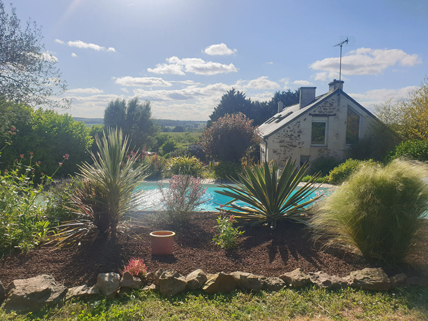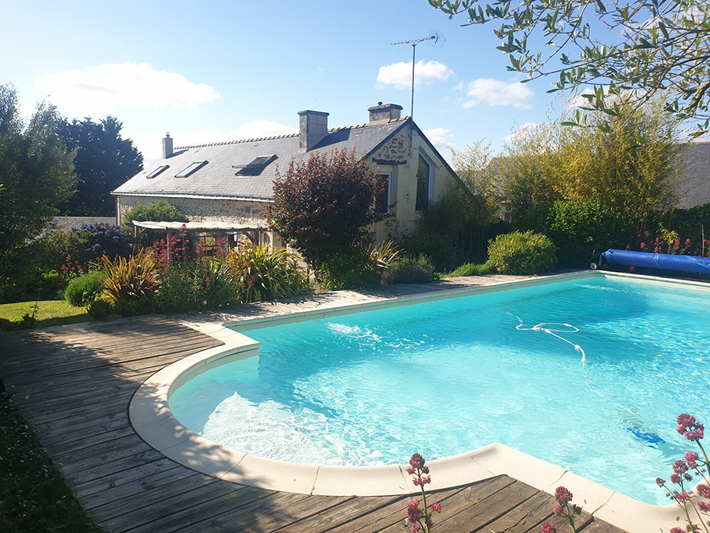 En exclusivité chez I WANT IMMO, venez découvrir cette jolie longère pleine de charme, offrant une vue magnifique sur la plaine et ses couchers de soleil, et une piscine idéale pour profiter des beaux jours. La maison propose des volumes agréables et une organisation fonctionnelle : Au rez-de-chaussée : -Un salon / séjour chaleureux avec cheminée à foyer ouvert -Une cuisine séparée, à aménager selon vos envies -Une chambre et une salle d'eau -Une buanderie -Un WC indépendant En rez-de-jardin : Une pièce supplémentaire pouvant servir de second salon, salle de détente ou espace de réception selon vos besoins. A l'étage : -Une mezzanine (coin bureau, lecture, espace jeux...) -Deux chambres, chacune avec sa salle de bain privative et WC (confort parfait pour la famille ou les invités) Confort et performance énergétique : la maison bénéficie d'un mode de chauffage performant grâce à une chaudière à granulés récente. A l'extérieur : Vous profiterez d'un magnifique terrain arboré de 1 653 m², parfaitement propice à la détente, comprenant : -Le local technique de la piscine -Un préau permettant de garer une voiture à l'abri (et sa borne de recharge pour voiture électrique) -Un atelier, idéal pour le bricolage ou le rangement -Une chaufferie Un bien rare, mêlant cachet, confort et cadre exceptionnel, à découvrir sans tarder. Pour tout renseignement, n'hésitez pas à nous contacter au 02.41.51.77.77 (4.90 % honoraires TTC à la charge de l'acquéreur.)