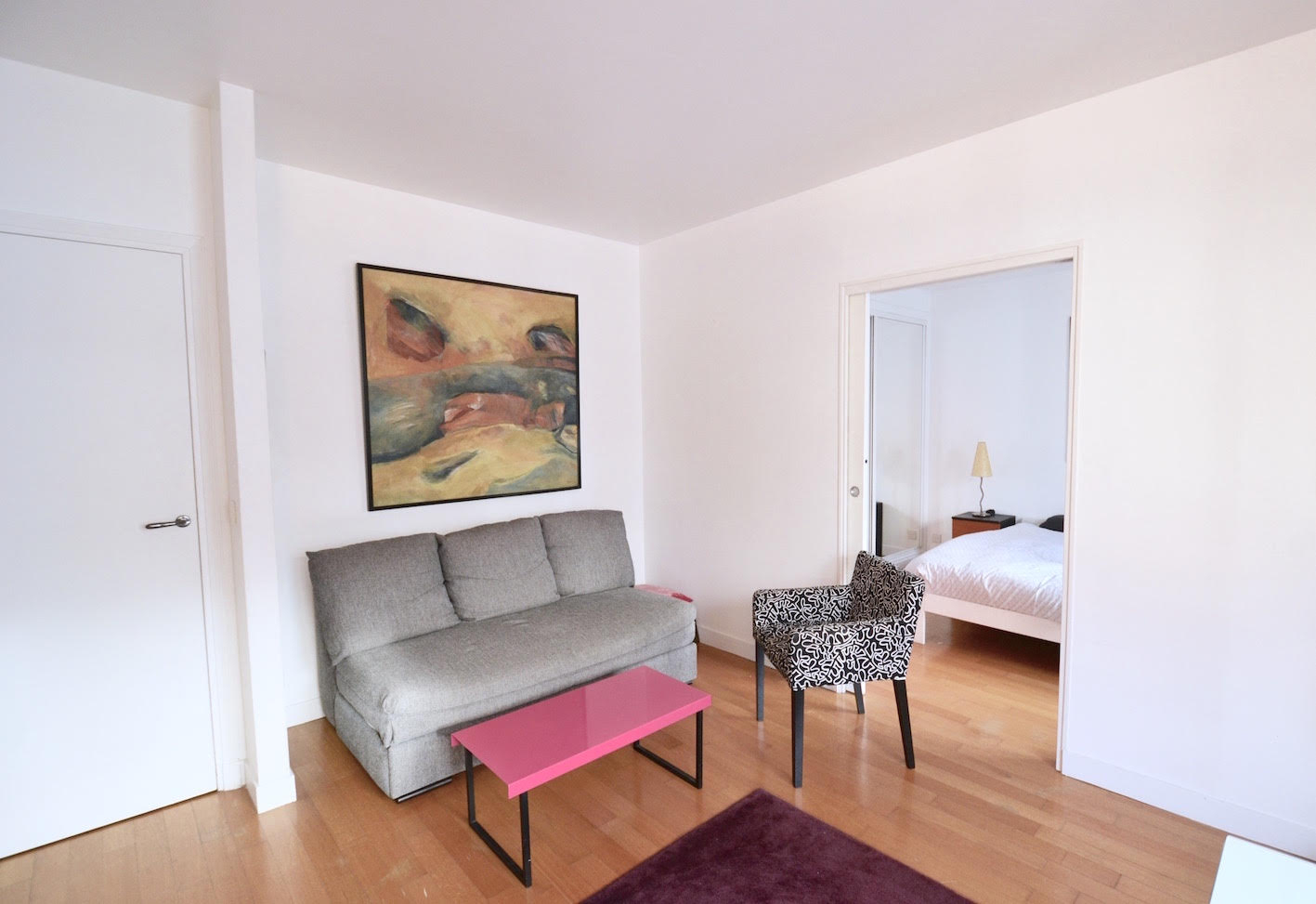 Village d'Auteuil, Rue Mirabeau, 1 min métro, bus et commerces, appartement 2 pièces meublé comprenant : entrée, séjour, cuisine équipée, chambre, salle de bains, WC séparé. Parfait état. Chauffage individuel électrique. Libre immédiatement.