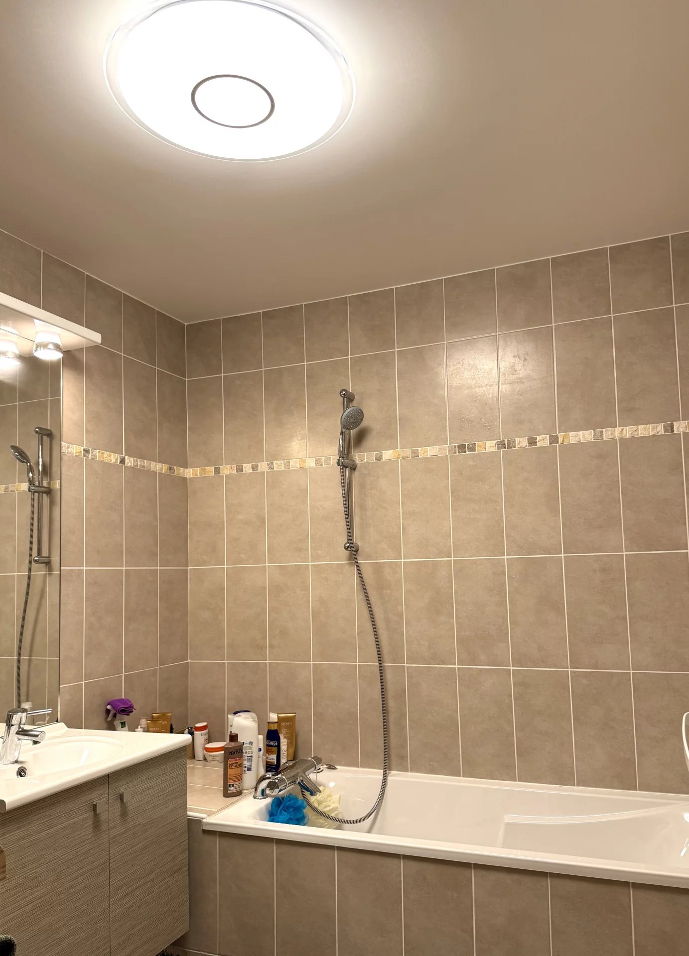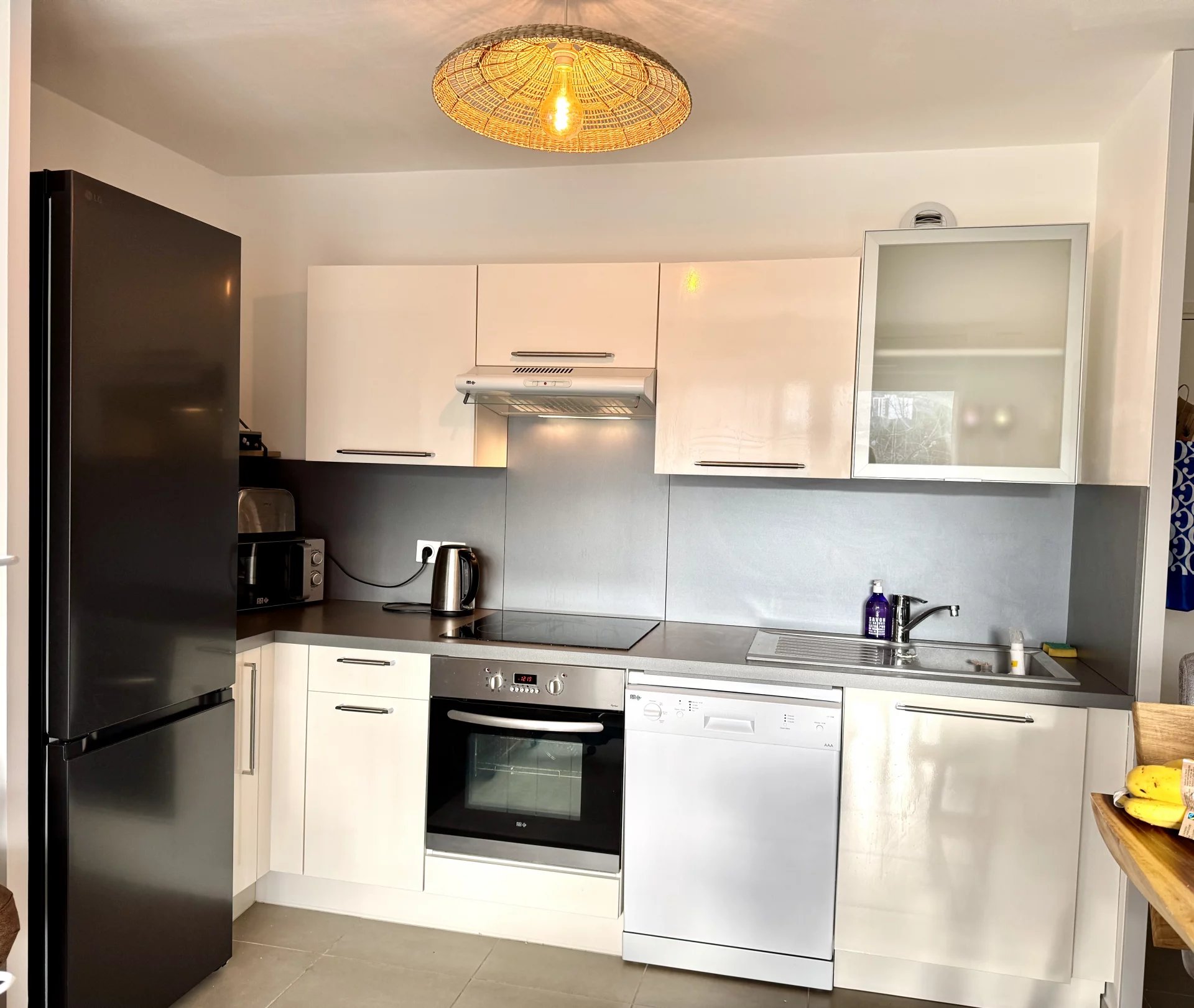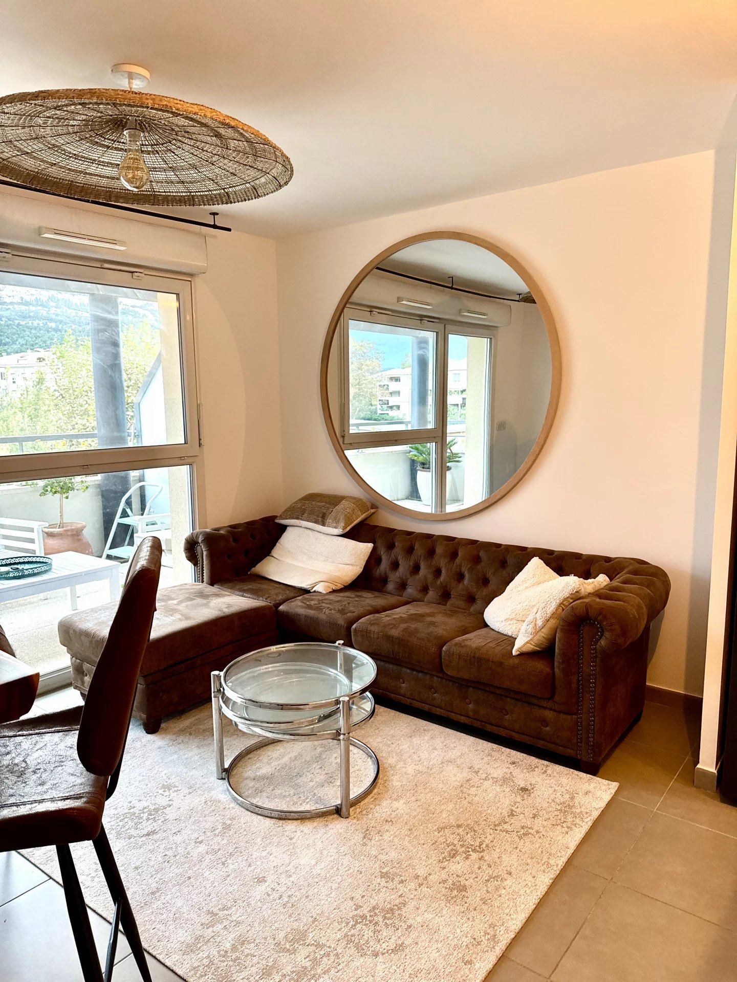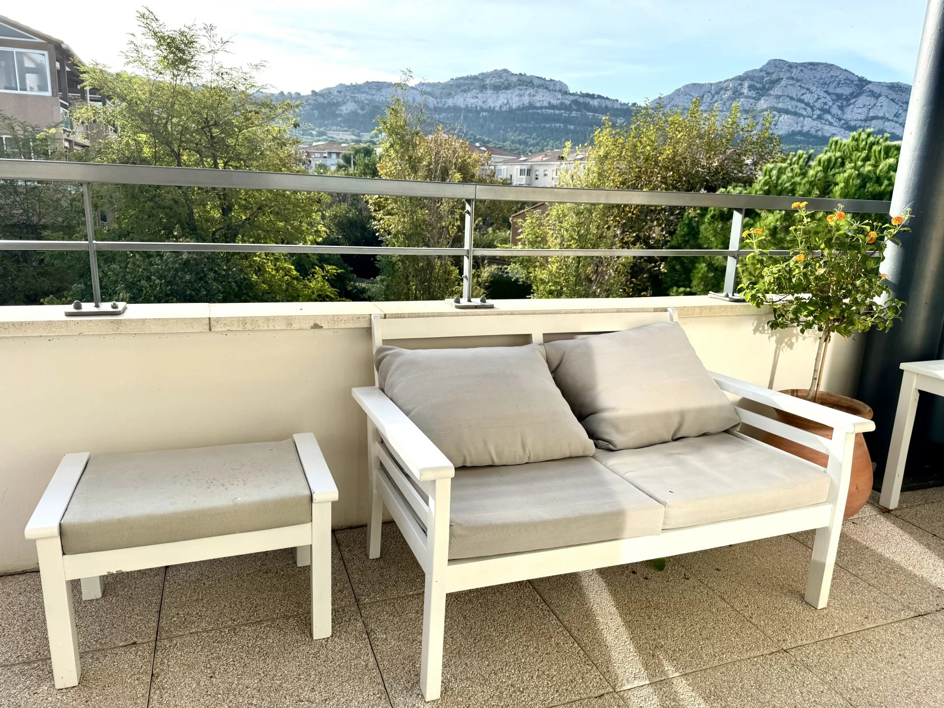 L'appartement propose un beau séjour climatisé et ouvert sur une cuisine totalement équipée, donnant directement accès à une grande terrasse de 12m² exposée Sud Est avec vue imprenable sur las collines.