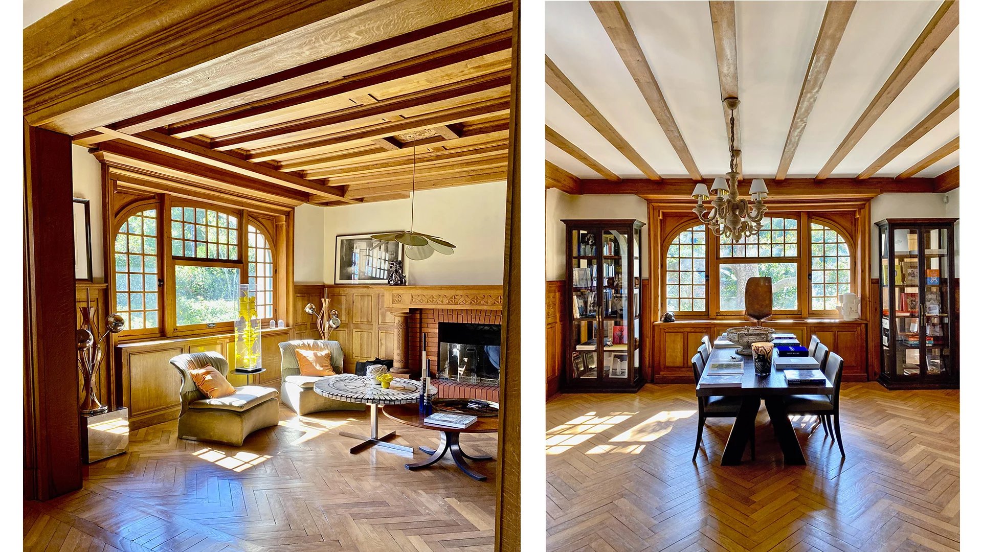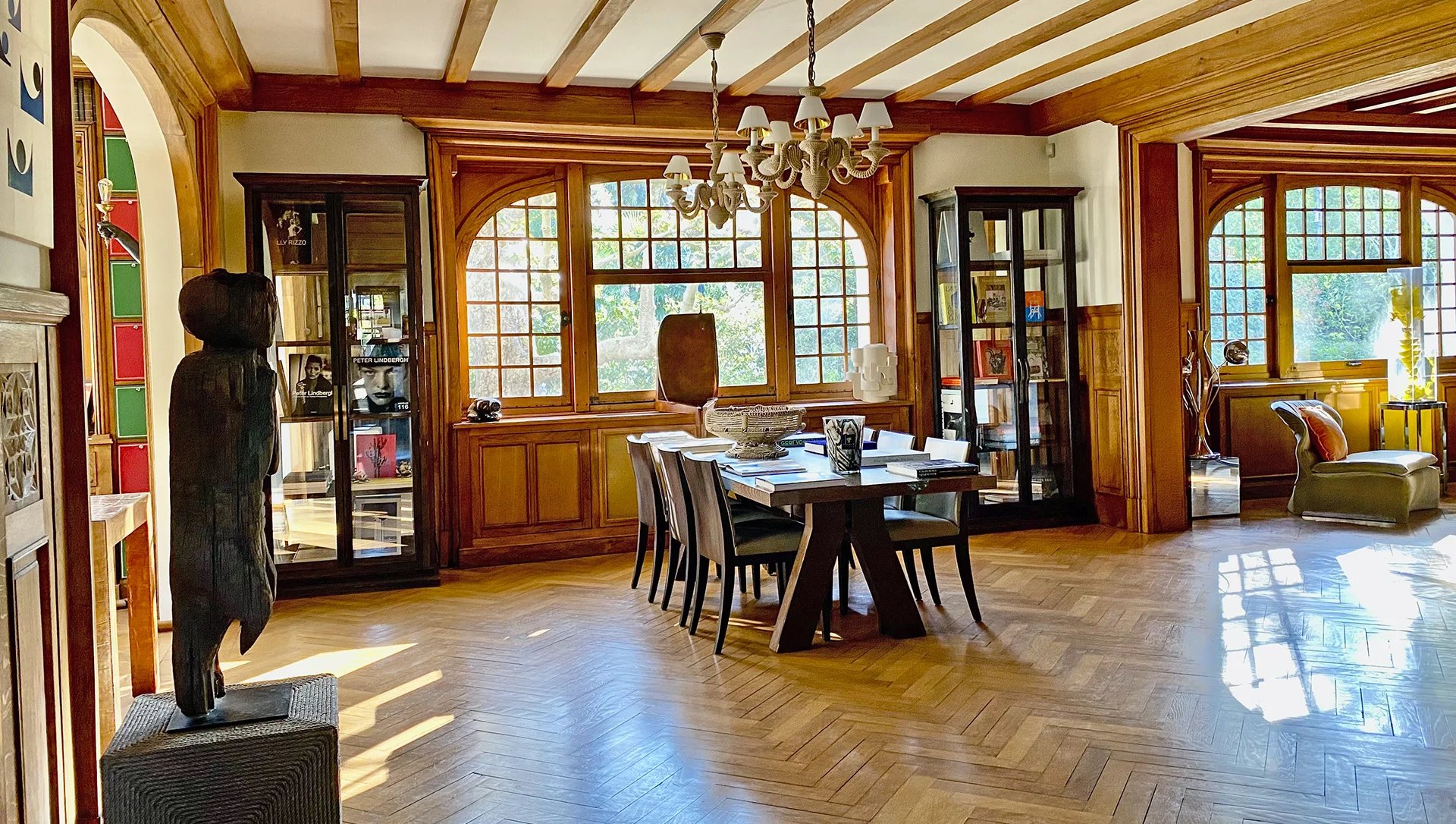 Une grande pièce de vie décorée de boiseries d'époque, avec une double exposition, comprenant trois espaces : salon, salle à manger et bureau.