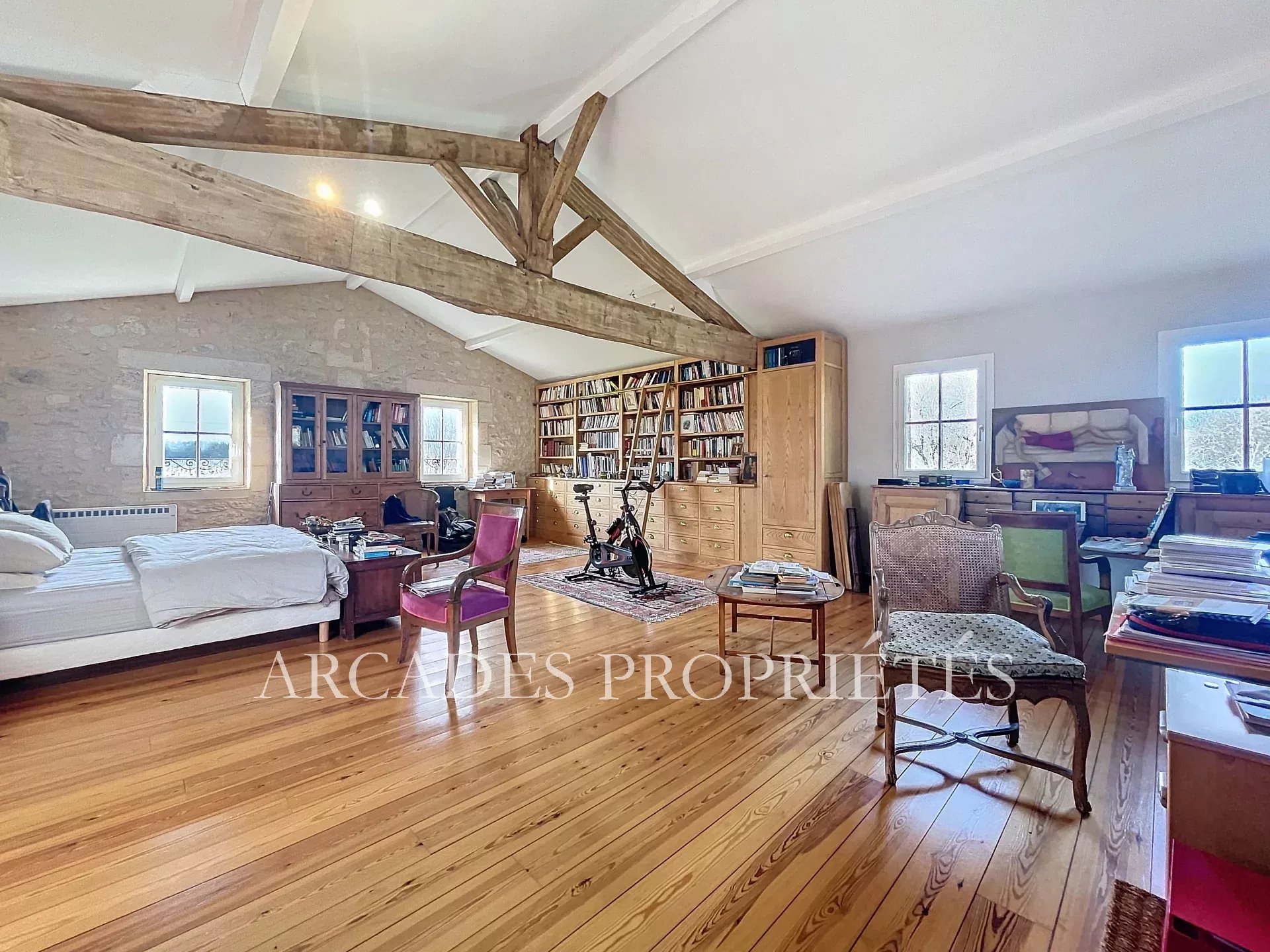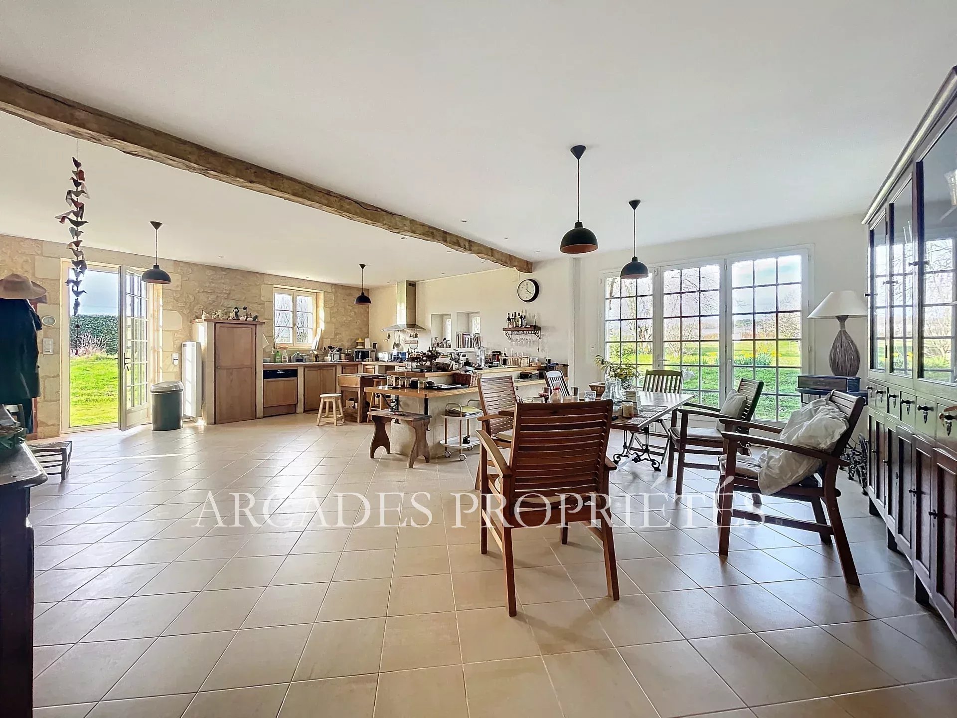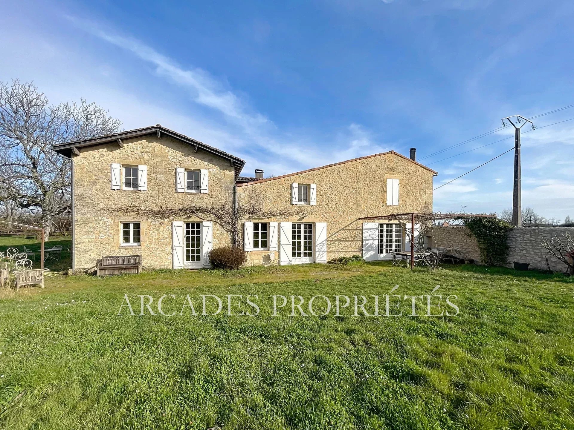 TRES BELLE DEMEURE FAMILIALE en PIERRE DE TAILLE des années 1800. Cette propriété se compose de trois maisons sur deux niveaux (ailes EST, OUEST et SUD) qui peuvent être dissociées pour en faire un projet d'hôtes ou de gîtes. Vous trouverez en rez de chaussée des espaces de vies avec divers salons et bureaux, des séjours - salle à manger, des cuisines mais aussi des espaces nuit avec des chambres et salles de bains ou salles d'eau. A l'étage, de. nombreuses chambres avec salle de bains et salles d'eau, des espaces bureaux, bibliothèque et diverses pièces. L'ensemble de ce domaine comprend 11 chambres, divers salons et salles TV pouvant être aménager en chambres complémentaires, des espaces de vie privatifs ainsi qu'un espace chaufferie. Les trois maisons communiquent entre elles par des couloirs et paliers mais peuvent être entièrement indépendantes les unes des autres par des doubles portes. A l'extérieur, sur un terrain clos de plus de 9000 m², arboré et paysagé avec de magnifiques arbres dont de nombreux fruitiers, une piscine de 100m² avec son local technique en pierre, un boulodrome, des terrasses extérieures. Bien entièrement rénové par les actuels propriétaires. Secteur privilégié au sein de la nature, agréable et calme, proche des commodités. Bien rare. ARCADES PROPRIETES.