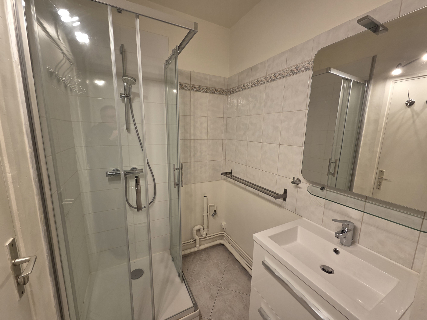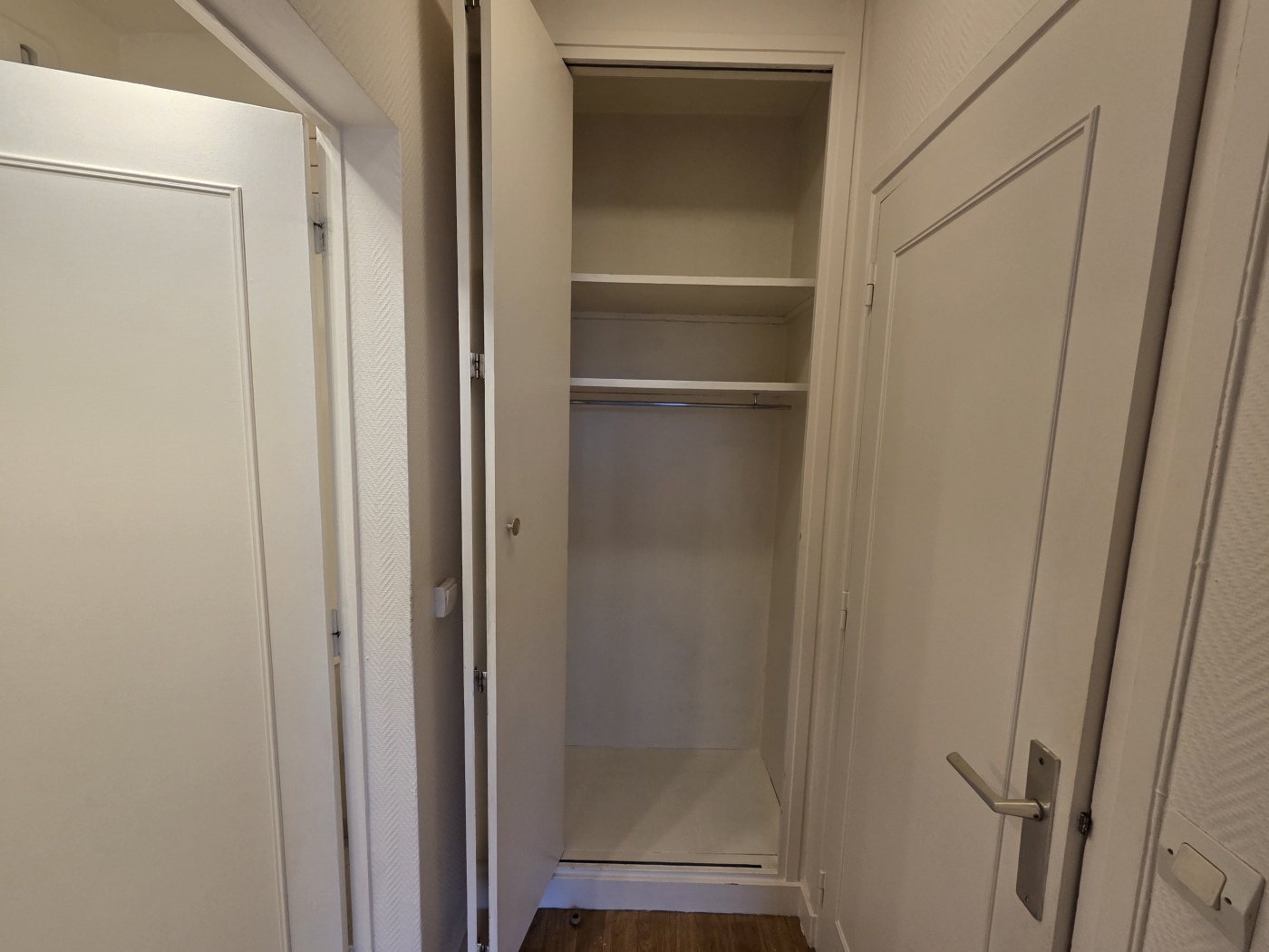 L'appartement est composé d'entrée avec porte blindée et penderie, d'un vaste séjour, dégagement avec rangements, une chambre, une cuisine séparée équipée, une salle d'eau wc avec connexion pour le lave-linge.