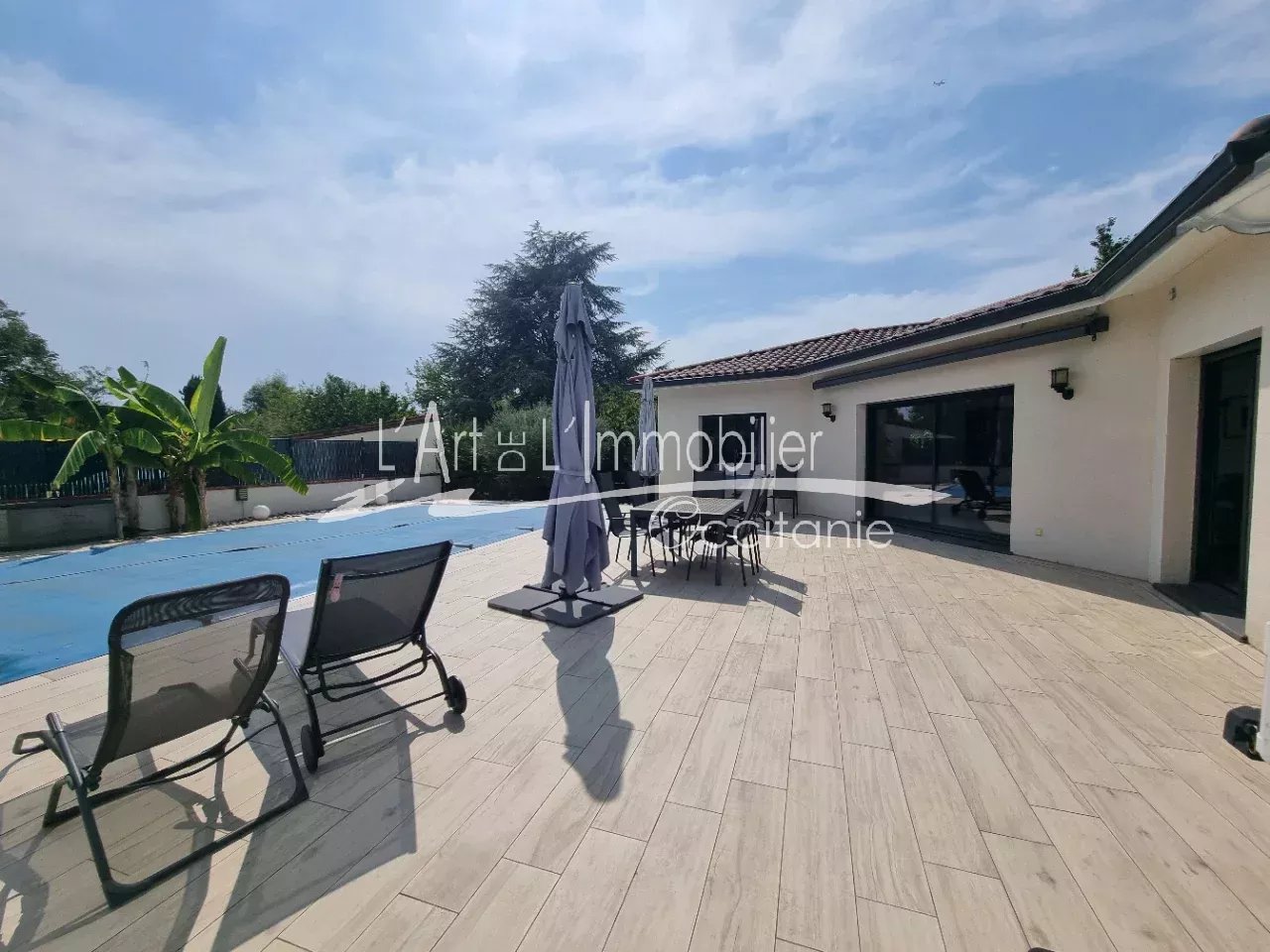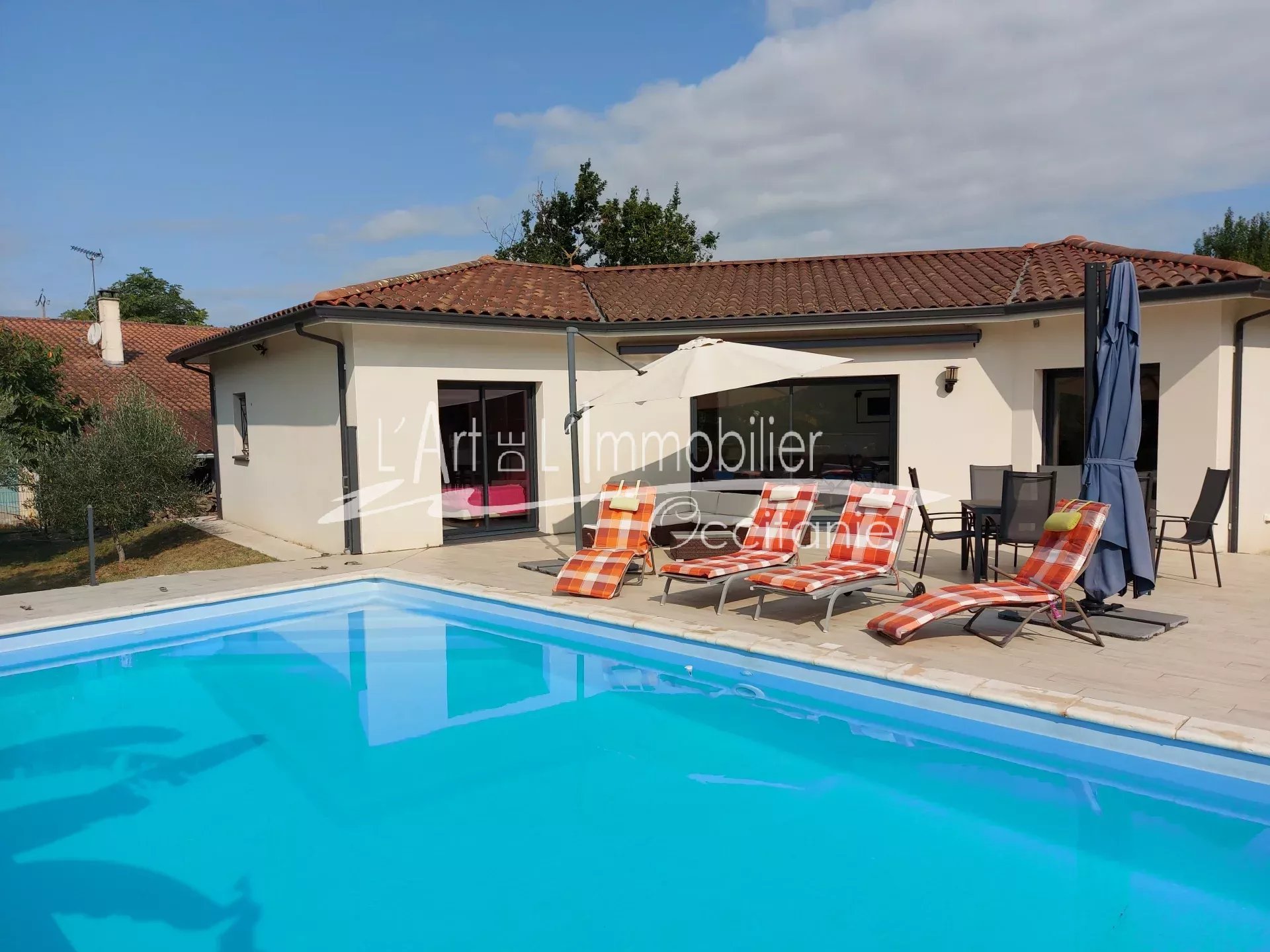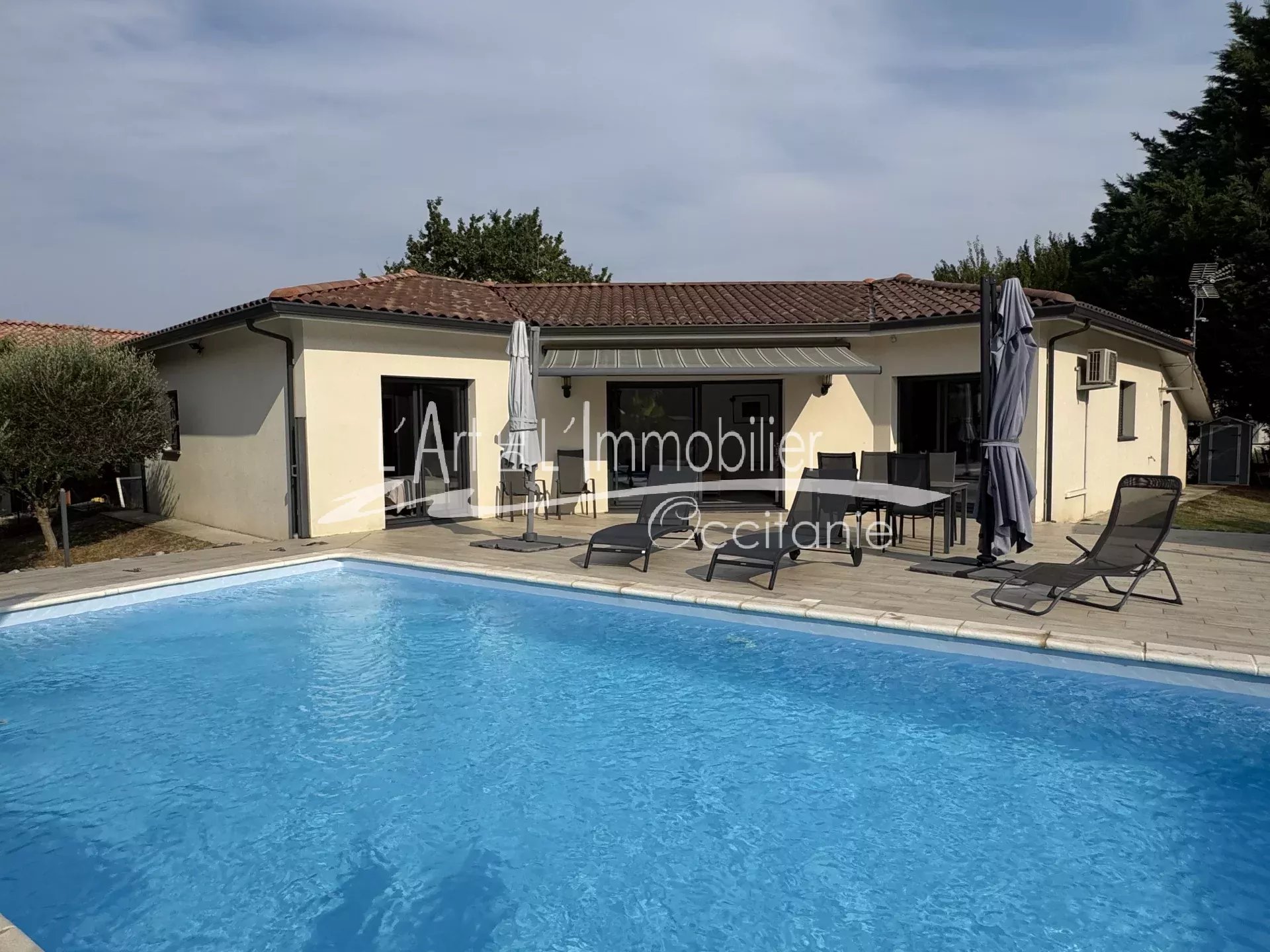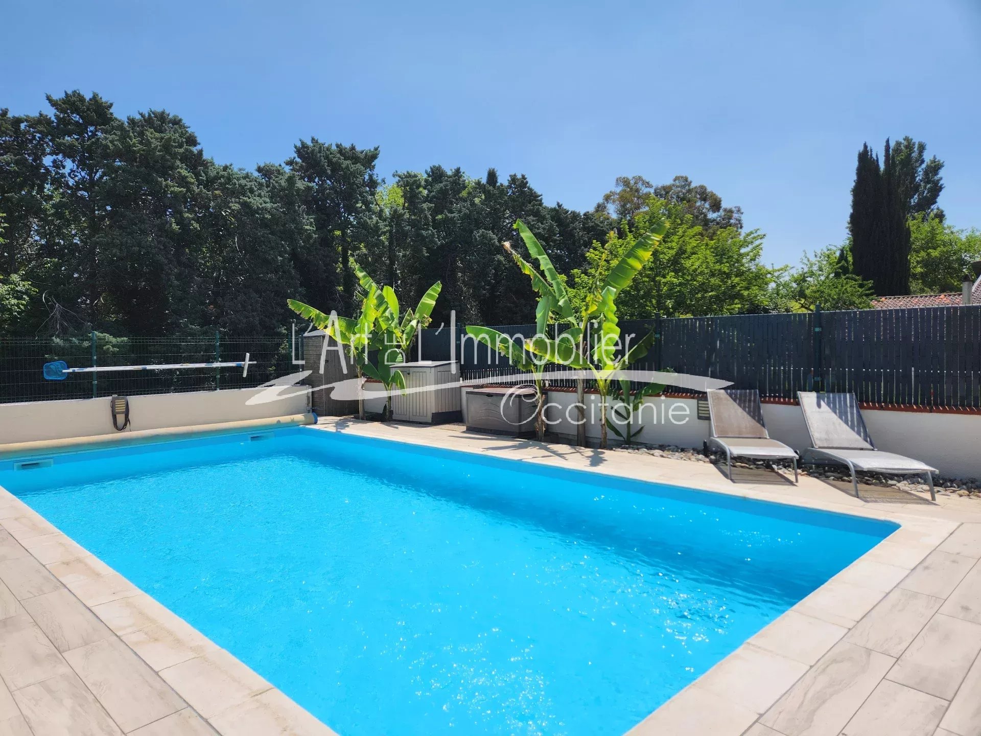 Belle maison contemporaine, de standing, de plain pieds, située dans un écrin de verdure, à 5 mn des commodités. Son intérieur se compose de son entrée/dégagement, toilettes/lave mains, placards, séjour/cuisine équipée, ouverts sur terrasse, vue piscine, buanderie/cellier, . Sa partie nuit offre une belle chambre parentale agrémentée de son dressing et salle d'eau/wc + 2 autres chambres, dont 1 avec son grand placard. Salle de bains. Très belles prestations, haut de gamme. Piscine sécurisée, bâchée, belle plage dallée, ensoleillée et protégée par son store banne, motorisé. L'ensemble édifié sur un beau terrain clos de 884 M². Sans vis à vis. Au calme.