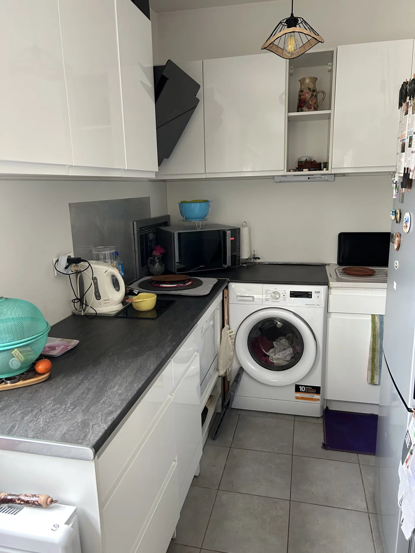 L’entrée dessert un dégagement qui mène, d’un côté, à une salle d’eau, et de l’autre à une pièce de vie lumineuse avec cuisine ouverte, aménagée et entièrement équipée (plaque de cuisson, hotte aspirante, lave-linge, lave-vaisselle – installation récente en 2024).