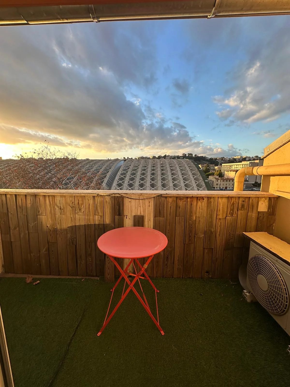 Palais des Exposition, beau 2 pièces meublé en dernier étage (avec ascenseur jusqu'au 3ème) composé de : une entrée, un séjour avec cuisine US ouvrant sur un beau balcon à ciel ouvert, une chambre avec dressing, une salle d'eau et un W.C indépendant.