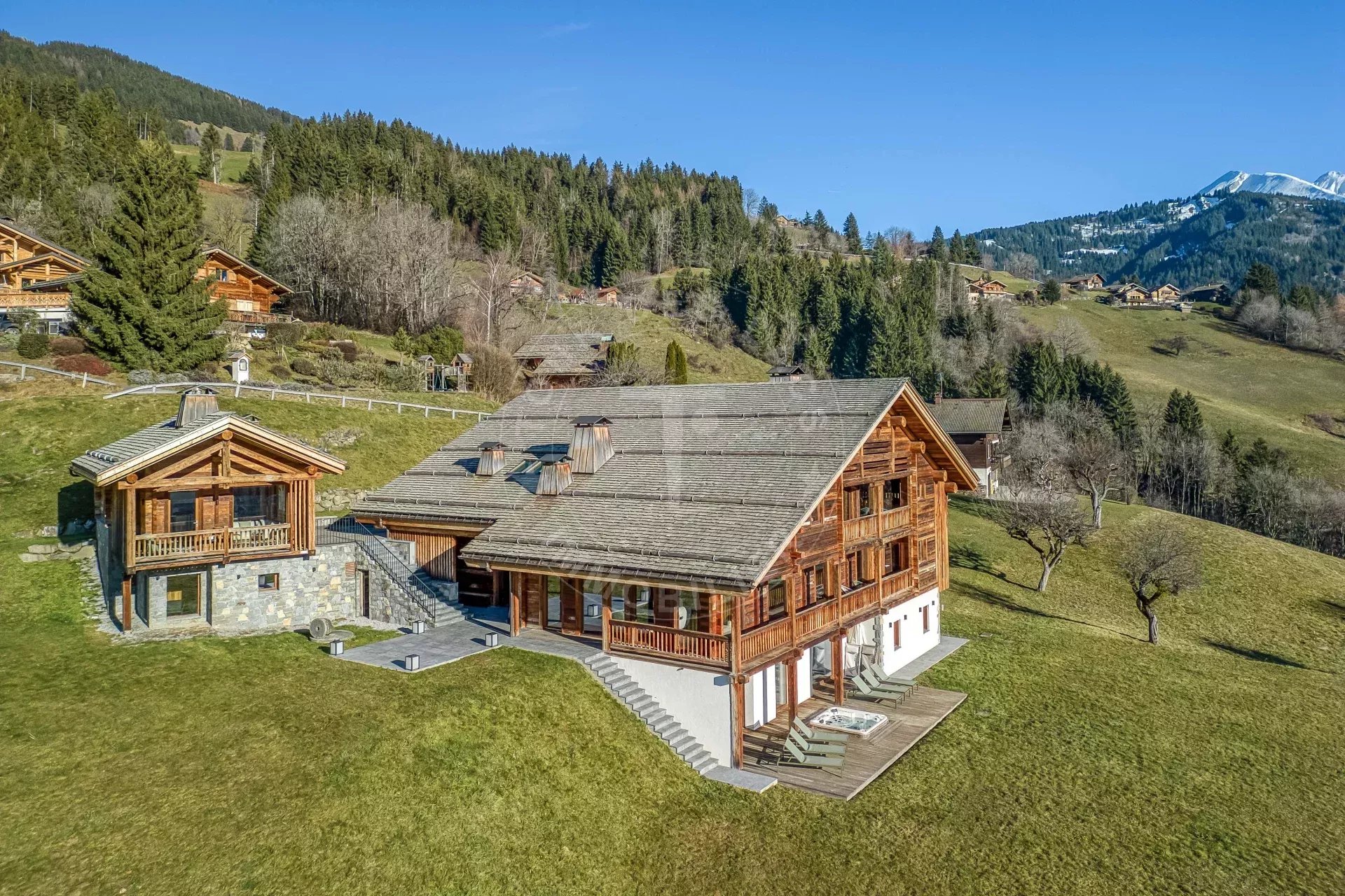 Avec 895 m² au sol, 37 m² de balcons et plus de 220 m² de terrasses réparties sur différents niveaux, cette propriété d’exception s’impose comme l’un des chalets les plus remarquables du massif des Aravis.
