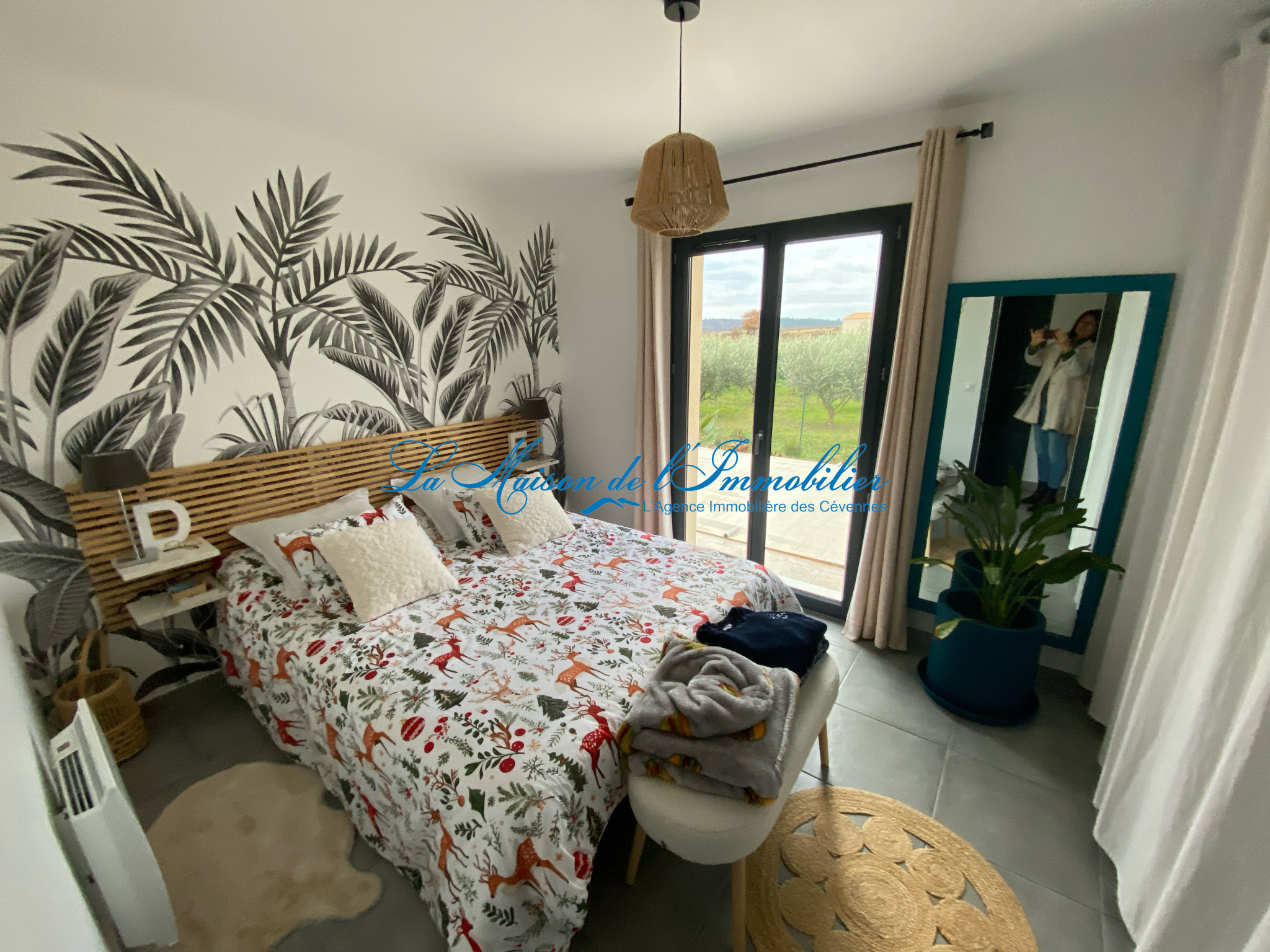 d'un bel espace séjour/salon avec cuisine équipée de 42 m2 avec une baie vitrée donnant sur la terrase qui offre une vue imprenable sur un champs d'oliviers,