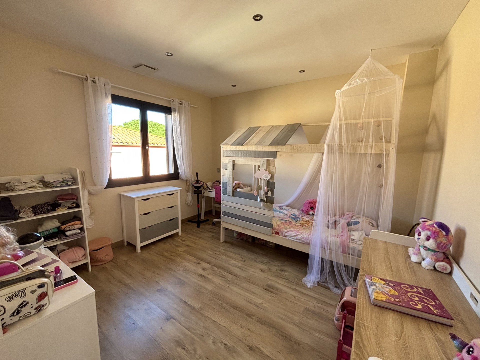 Bien immobilier : villa 5 chambres dont une suite parentale en rez-de-chaussée, pièce à vivre de 70m2 avec cuisine équipée et espace bureau, une salle d'eau, une salle de bain, prestations de qualité, jardin aménagé, terrasses, piscine, garage (prix 398000EUR).