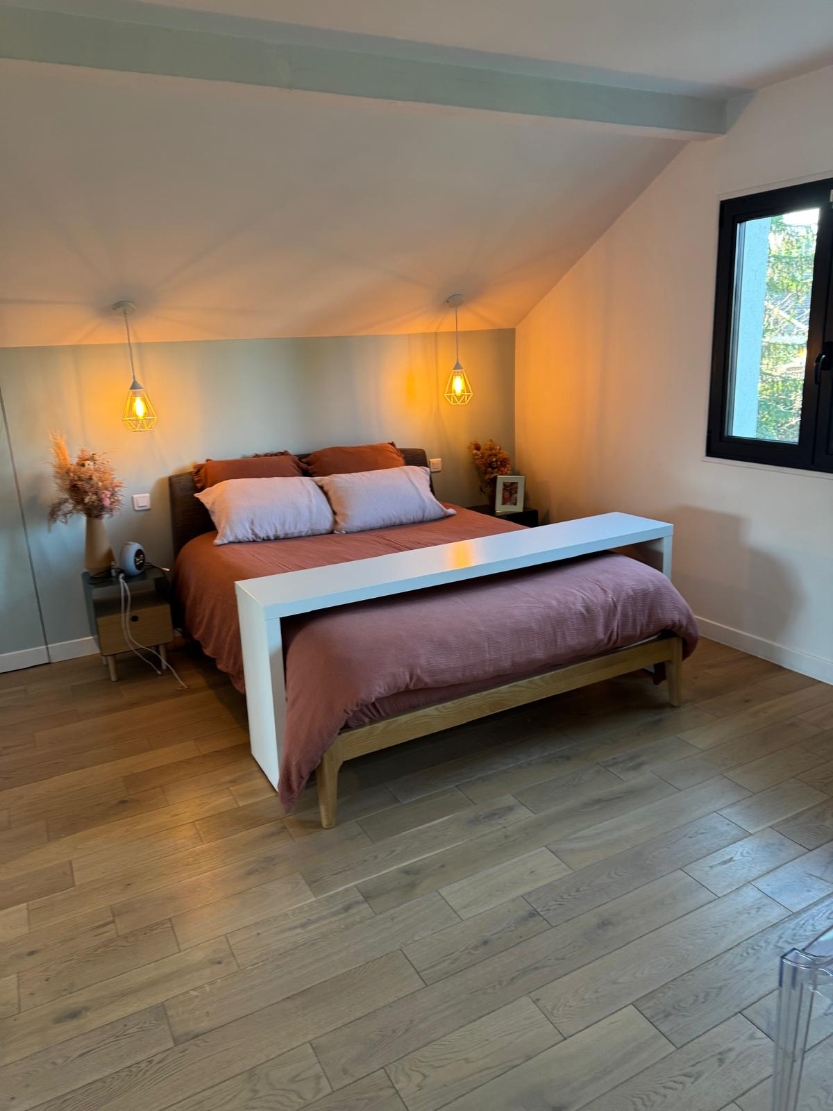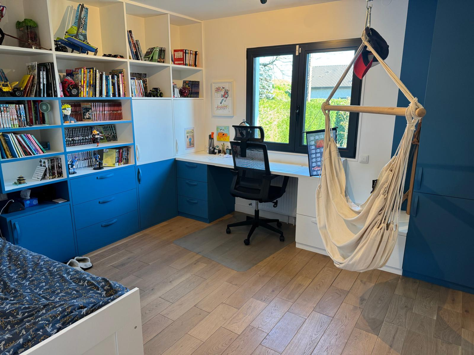 A l'étage : nous retrouvons un endroit intime pour les parents avec une magnifique suite parentale avec espace dressing aménagé et sa propre salle de douche avec un wc, un grand espace du bureau ou également peut être converti en une grande chambre avec un balcon et vue magnifique vue sur les Alpes et le Mont Blanc.