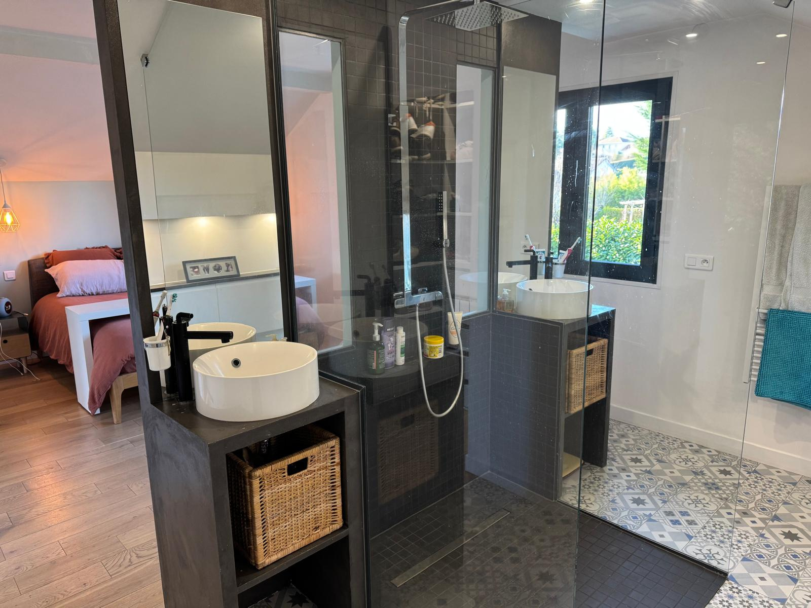 Au rez-de-chaussée : d'une belle entrée avec un vestiaire, un wc visiteur, vaste pièce de vie en L avec une cuisine entièrement équipée et aménagée ouverte sur le salon- séjour et la salle à manger avec une belle hauteur sous plafond et agrémenté d'une cheminée le tout avec accès direct aux terrasses et au jardin grâce à de belles ouvertures, un dégagement desservant 3 belles chambres avec rangements aménagés sur mesure, une grande salle de douche aménagée et un wc.
