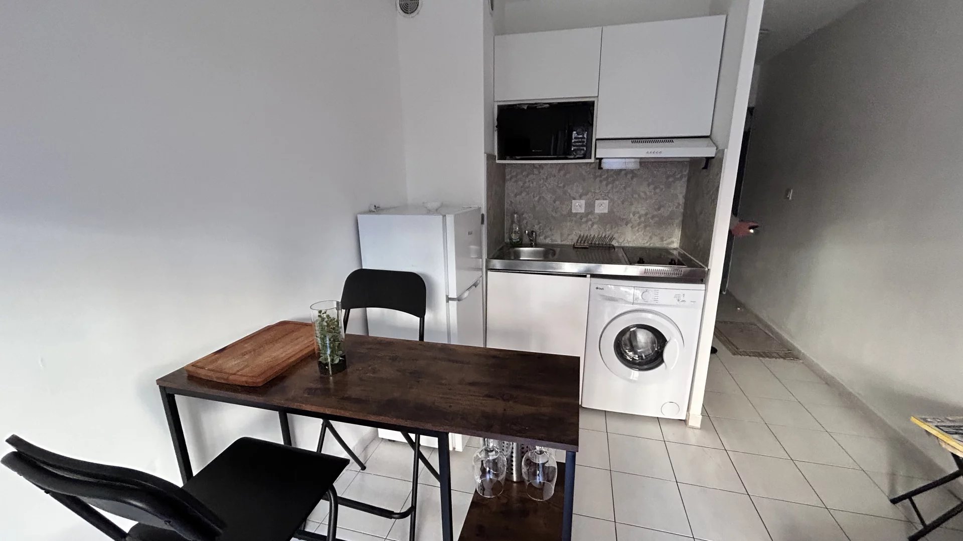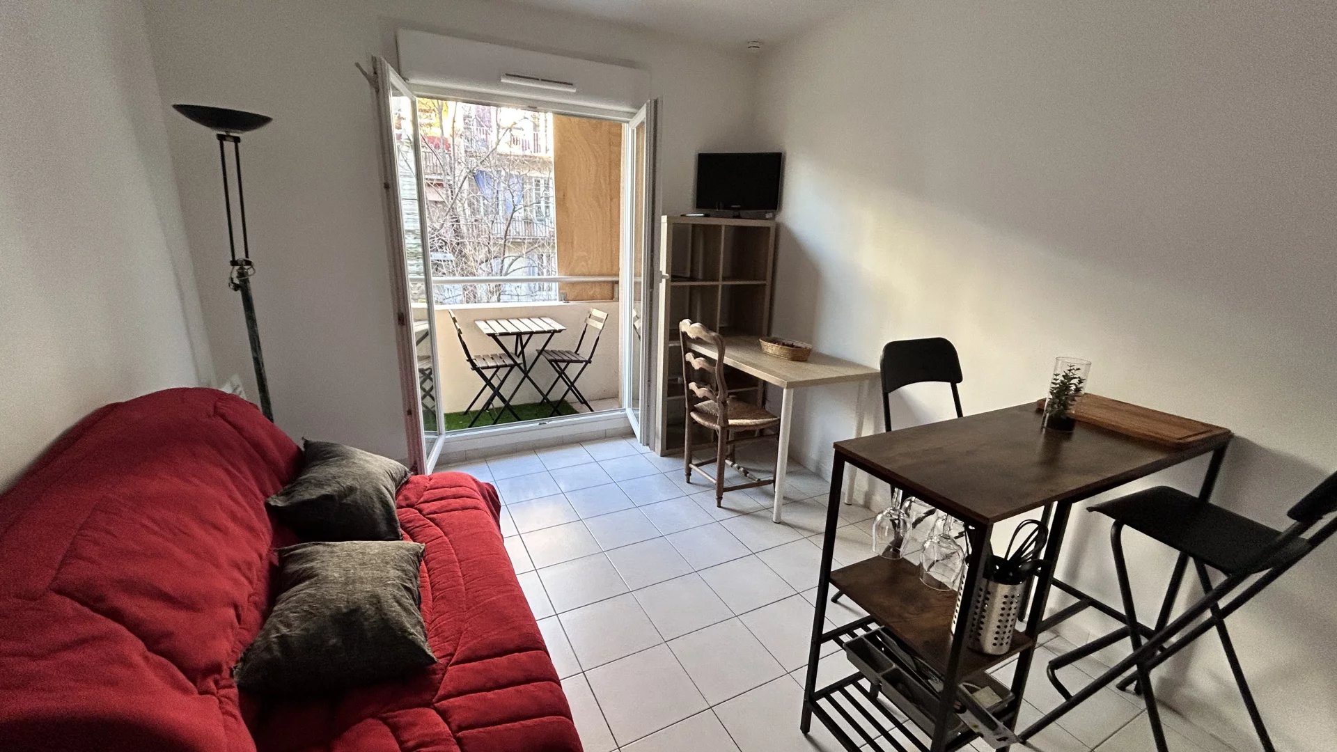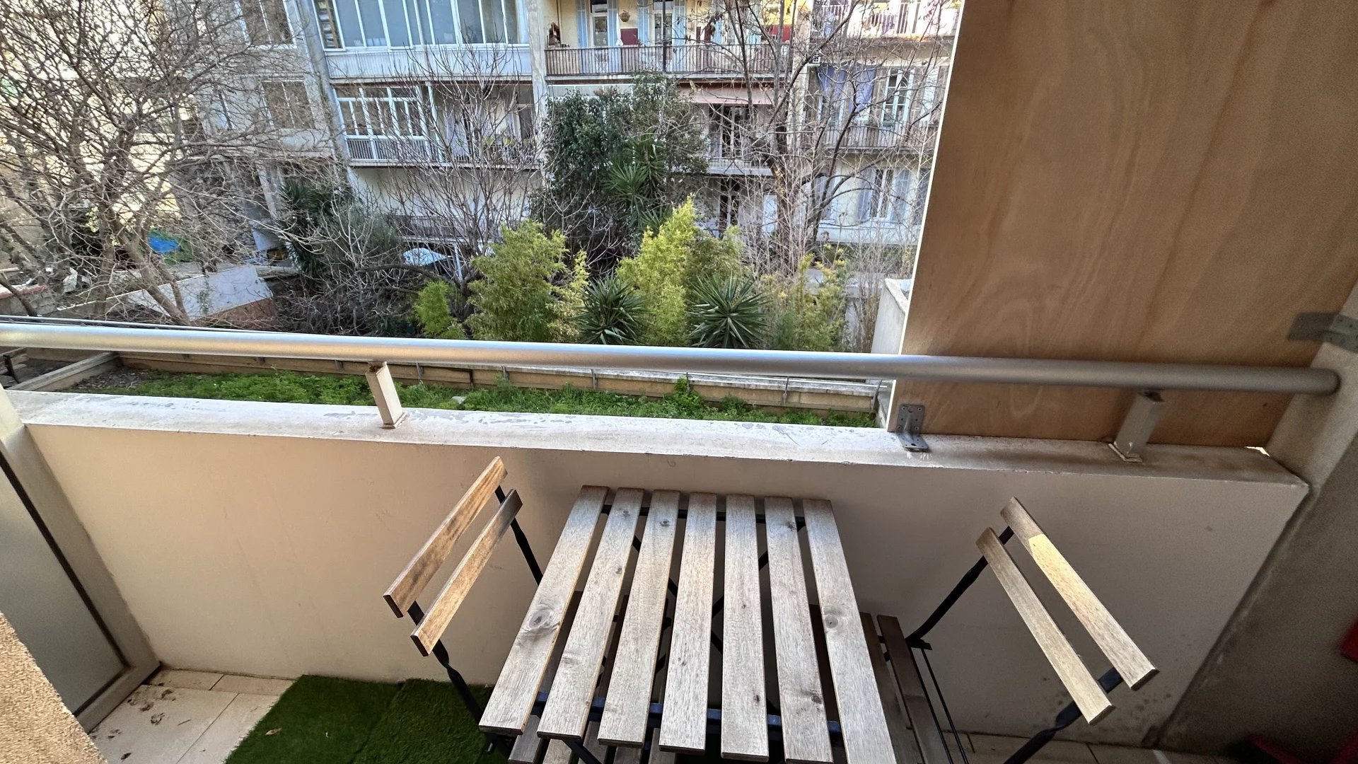 Marseille 5ème CHAVE/BLANCARDE: Situé au 2ème étage avec ascenseur, cet appartement de type 1 Meublé se développe de la manière suivante: Une entrée avec rangement, une salle d'eau avec wc, une cuisine Us équipée avec salon donnant sur balcon côté jardin. Belles prestations, double vitrage, literie neuve, ustensiles neuf, électroménager neuf, calme, bien isolé. A deux pas de toutes commodités