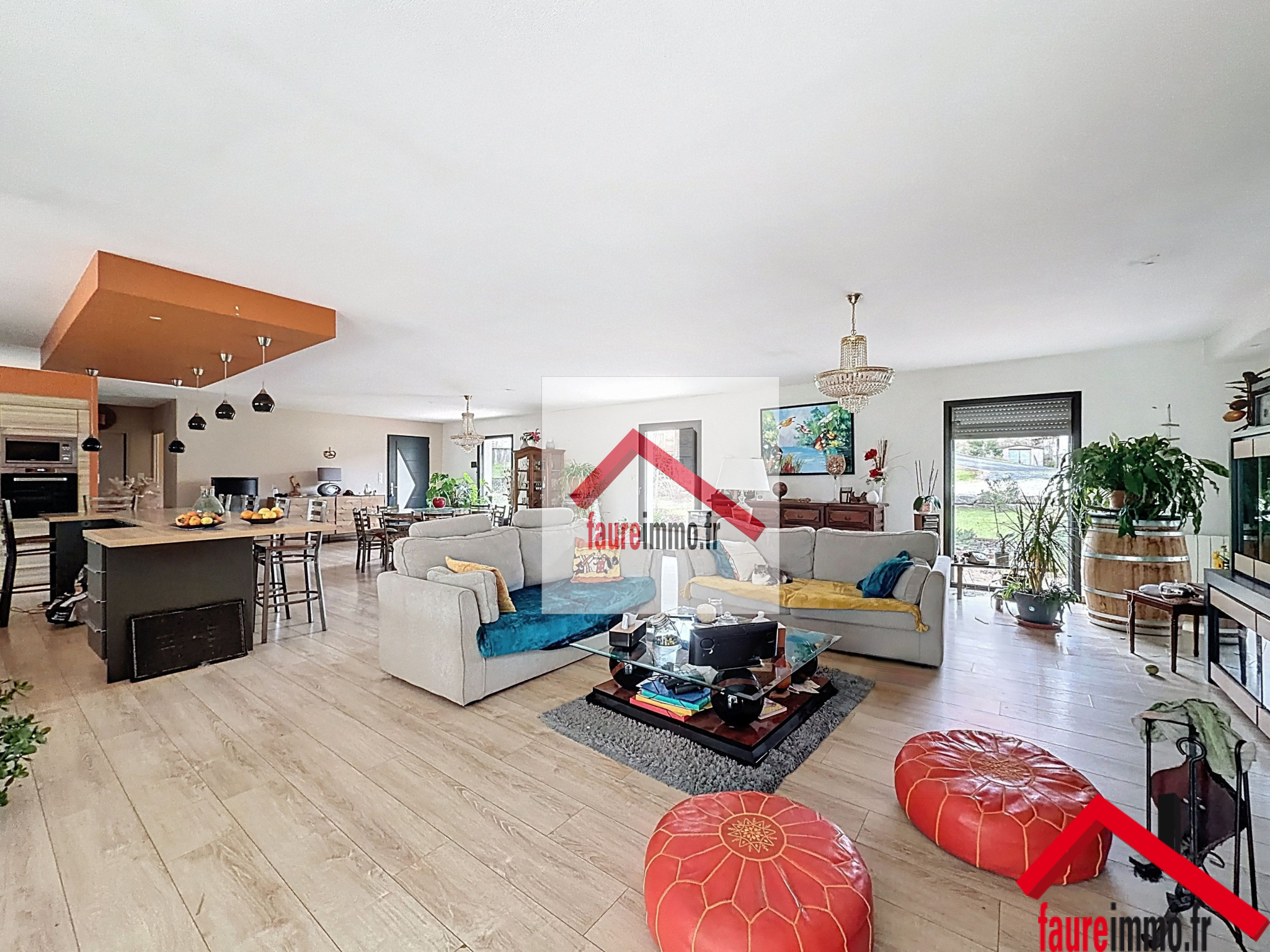 EXCLUSIVITE FAUREIMMO.FR : Maison récente de plain pied de plus de 200 m2 habitables, comprenant un séjour de plus de 100m2 avec cuisine aménagée et équipée, 4 chambres dont une suite parentale de plus de 28 m2 avec salle d'eau, un double garage de 60 m2 le tout sur un terrain arboré d' environ 5144 m2. contact@faureimmo.fr