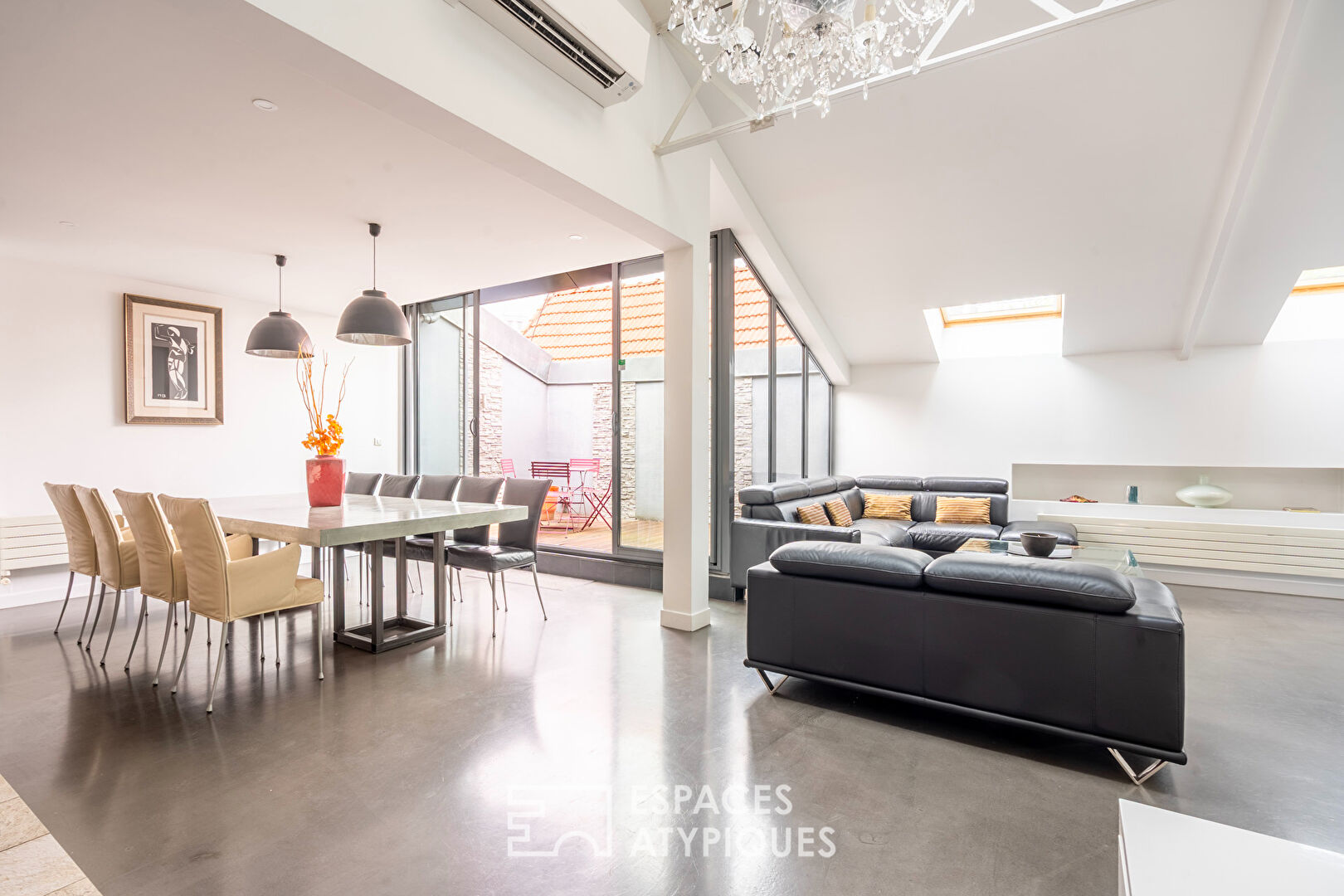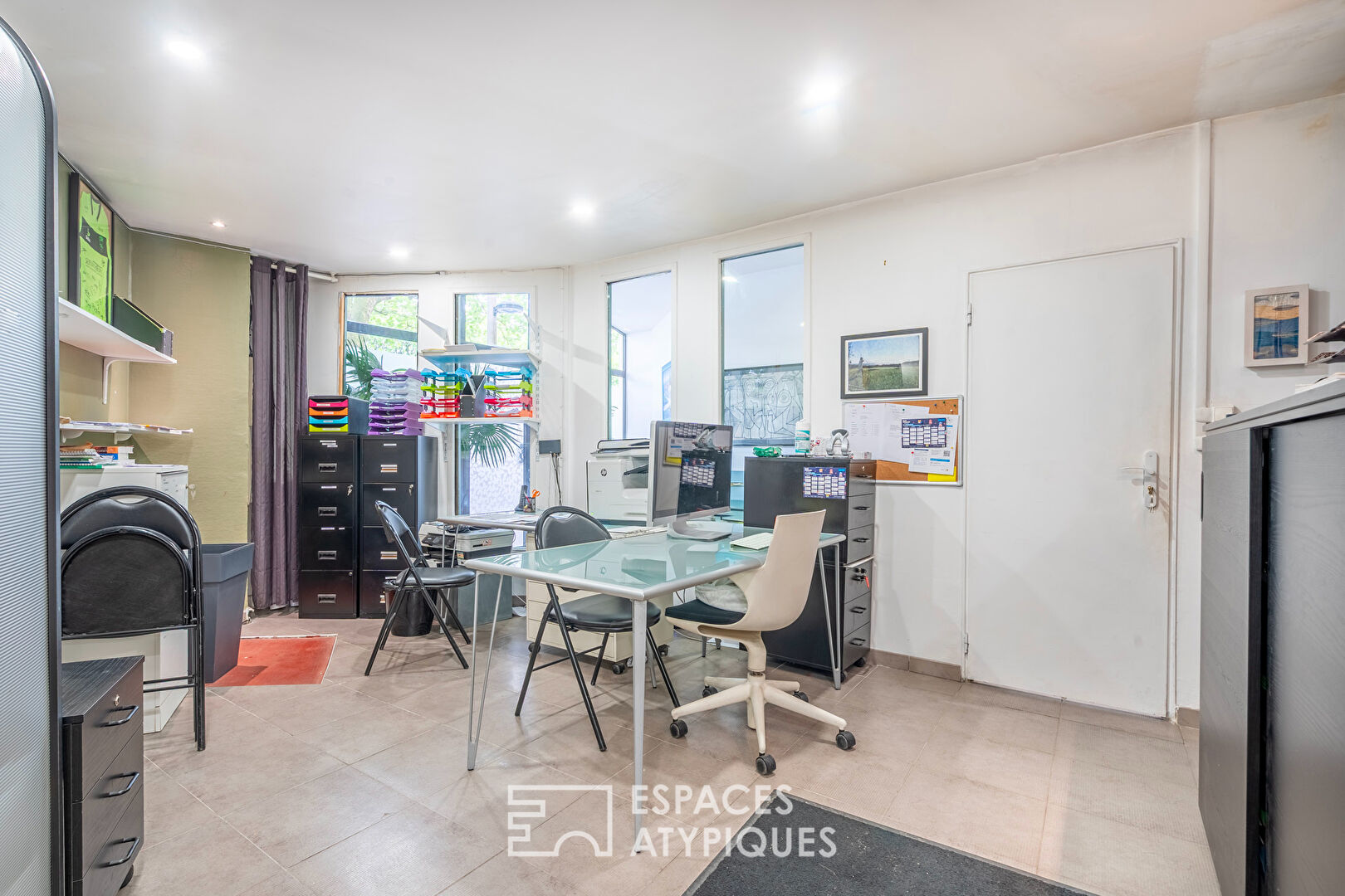 Situé à Romainville, à quelques minutes de la Place Carnot et des axes routiers, ce lieu hybride offre une combinaison rare : un espace professionnel de 180 m² en rez-de-chaussée et un triplex de 208 m² au sol (187,19 m² Carrez) à l'étage. Depuis la rue, le rez-de-chaussée accueille un espace professionnel fonctionnel : une entrée menant à un bureau, une surface de 88 m² idéale pour du stockage ou un atelier, ainsi qu'un garage de 43 m². Une cave et un WC indépendant complètent ce niveau dédié à l'activité. L'accès au loft, au rez-de-chaussée, se fait par une entrée agrémentée de nombreux rangements. A l'étage, une pièce de vie de plus de 85 m² sous une belle hauteur est coiffée de poutres métalliques témoignant du passé industriel des lieux. Nichée sur une estrade, une cuisine entièrement équipée profite d'aménagements sur mesure. L'ensemble est baigné de lumière grâce aux larges fenêtres de toit et prolongé d'une terrasse tropézienne de 11 m². Une salle d'eau avec buanderie ainsi qu'un WC indépendant complètent ce niveau. Au dernier étage, un dégagement distribue une chambre ainsi qu'une suite parentale bénéficiant d'un dressing et d'une salle de bains privative avec douche et baignoire. Un WC indépendant complète ce niveau. Ce lieu singulier, à proximité des commodités, s'adresse à celles et ceux qui recherchent un cadre modulable, où vie personnelle et activité professionnelle se conjuguent harmonieusement. Bien soumis au statut de la copropriété. Métro ligne 11 : Carnot à 700 mètres ; Montreuil-Hôpital à 500 mètres Accès autoroute : A3 à 4 minutes CLASSE ENERGIE : B / CLASSE CLIMAT : B Montant moyen estimé des dépenses annuelles d'énergie pour un usage standard, indexées aux années 2021, 2022, 2023 : entre 1 650 euros et 2 290 euros (abonnement compris). Les informations sur les risques auxquels ce bien est exposé sont disponibles sur le site Géorisques : https://www.georisques.gouv.fr Contact : Daniel 06 64 01 30 43 EI - RSAC : 811 163 369 Bobigny Copropriété de 44 lots - dont 19 lots habitation. (Pas de procédure en cours). Charges annuelles : 2075 euros. Daniel Teran (EI) Agent Commercial - Numéro RSAC : 811 163 369 - Bobigny.