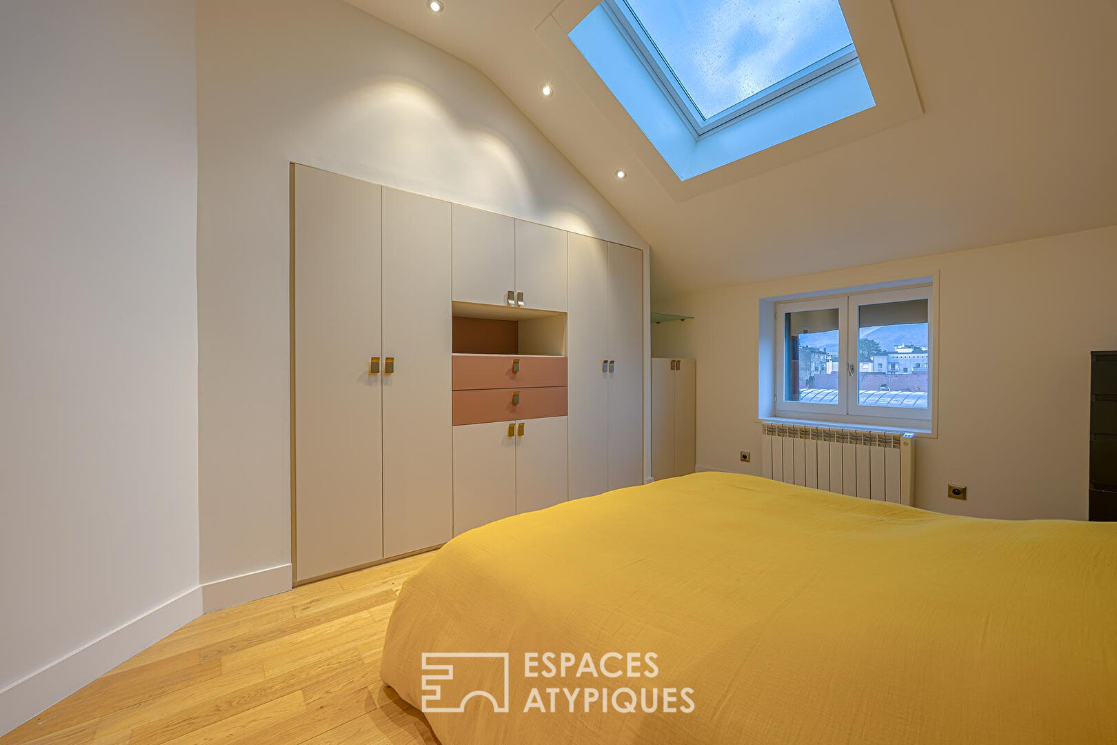 Cet appartement d'exception de 87 m² Carrez environ est niché au cinquième et dernier étage sans ascenseur d'un immeuble haussmannien au coeur d'Annecy. Ce bien immobilier atypique offre une alliance parfaite entre l'élégance de l'ancien et le confort contemporain, sublimée par une vue dégagée sur les toits de la ville et les massifs environnants. L'intérieur dévoile des volumes généreux, à l'image de sa pièce de vie lumineuse de 41 m² bénéficiant d'une belle hauteur sous plafond de près de 3,60 mètres. Le parquet en chêne massif et les poutres apparentes confèrent un cachet authentique, tandis qu'un poêle à granulés instaure une atmosphère chaleureuse et cosy. Une cuisine ouverte, entièrement aménagée et équipée, complète cet espace convivial. L'espace nuit se compose de deux chambres, toutes deux dotées de rangements intégrés sur mesure. La chambre parentale offre une vue privilégiée sur la ville et les montagnes. Une salle d'eau moderne avec vasque et douche à l'italienne parachève ce niveau de confort. Idéalement situé, cet appartement permet un accès immédiat à la vie culturelle, aux commerces et aux commodités du centre-ville d'Annecy. Une cave en sous-sol de 9 m² environ ajoute un atout pratique à ce bien. Une opportunité rare pour les amateurs d'immobilier de prestige cherchant un lieu de vie singulier et lumineux. CLASSE ÉNERGIE : E / CLASSE CLIMAT : B. Montant moyen estimé des dépenses annuelles d'énergie pour un usage standard (2021 à 2023) : entre 2 200 euros et 3 050 euros. Les informations sur les risques auxquels ce bien est exposé sont disponibles sur le site Géorisques : www.georisques.gouv.fr. Contact : Laurence 06 61 02 84 42 (5.00 % honoraires TTC à la charge de l'acquéreur.) Copropriété de 19 lots - dont 9 lots habitation. (Pas de procédure en cours). Charges annuelles : 999 euros. Laurence ROMERO (EI) Agent Commercial - Numéro RSAC : 841 857 295 - Annecy.