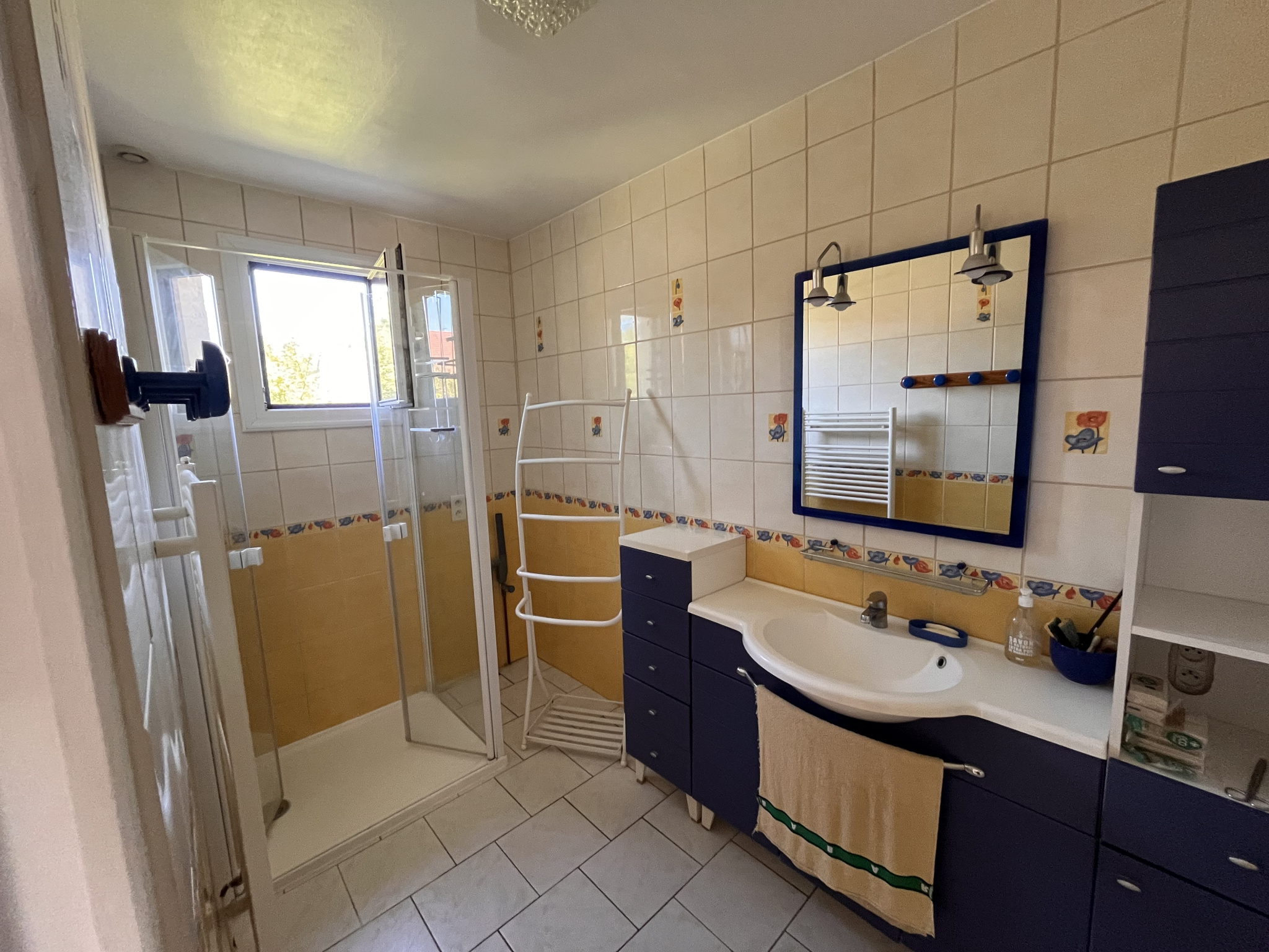 Au rez-de-chaussée : entrée, cuisine, séjour communiquant sur la terrasse, 2 chambres, salle de douches et wc.