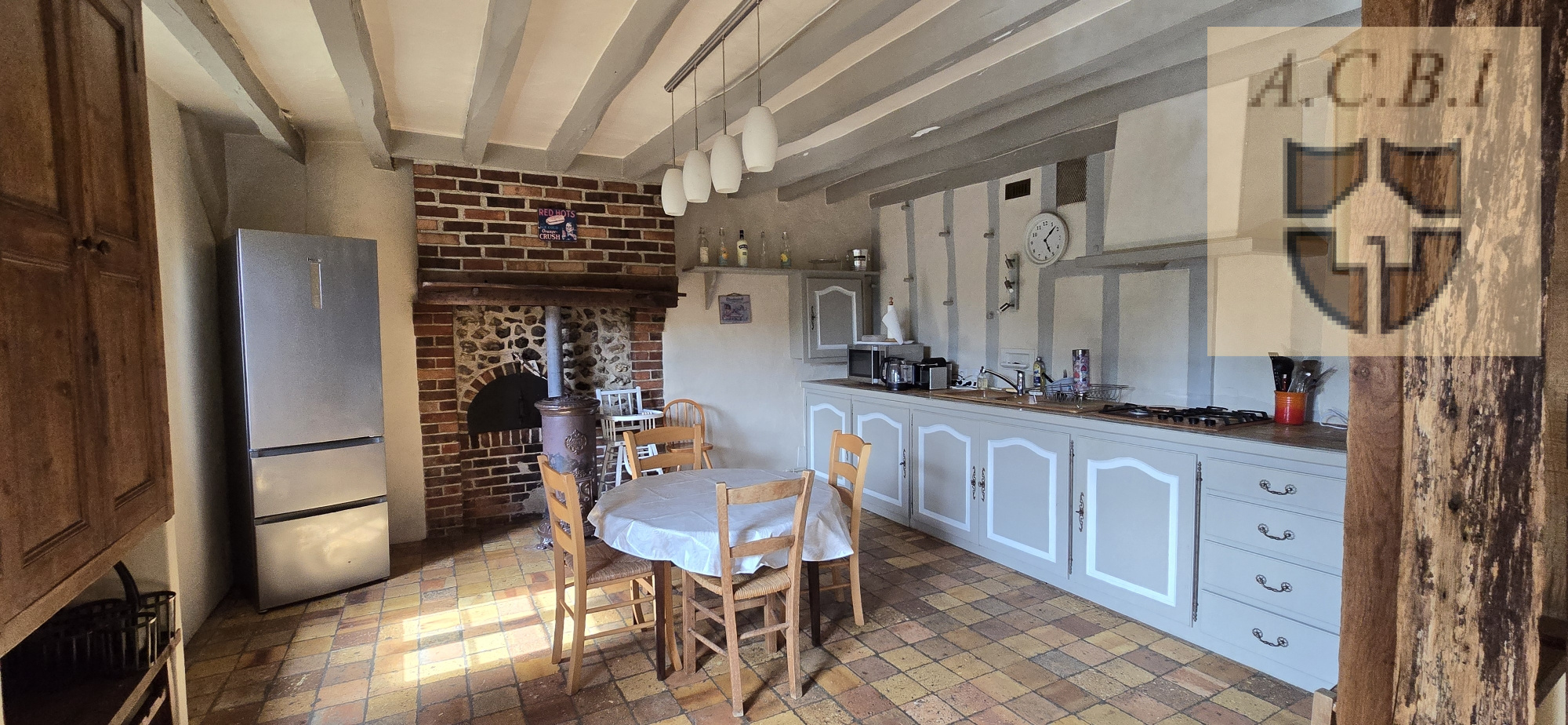 - une maison d'habitation : grand séjour avec cheminée, cuisine aménagée, bureau, 3 chambres dont une en mezzanine, sdb, wc.